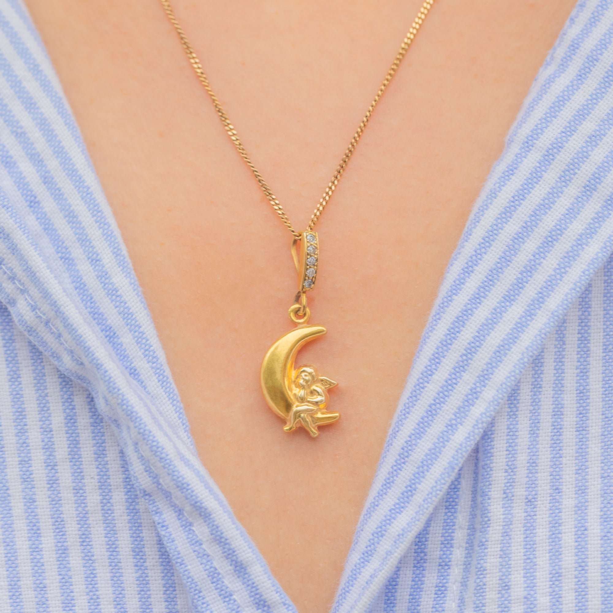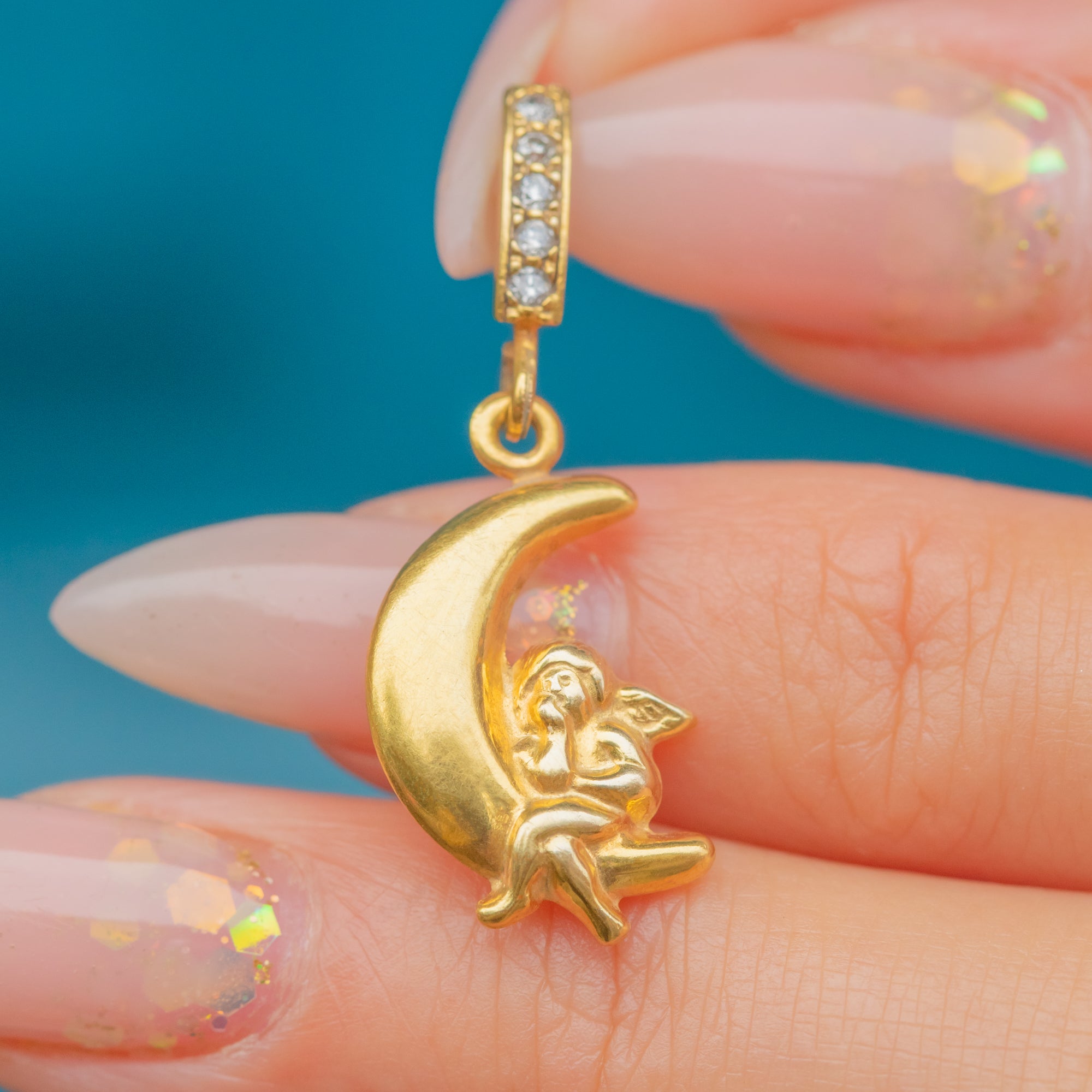 This whimsical Mid-Century charm is crafted in 9ct Gold and features a sweet cherub perched on a crescent moon. The Diamond-encrusted bale adds a touch of sparkle, perfectly complementing the playful yet romantic design.