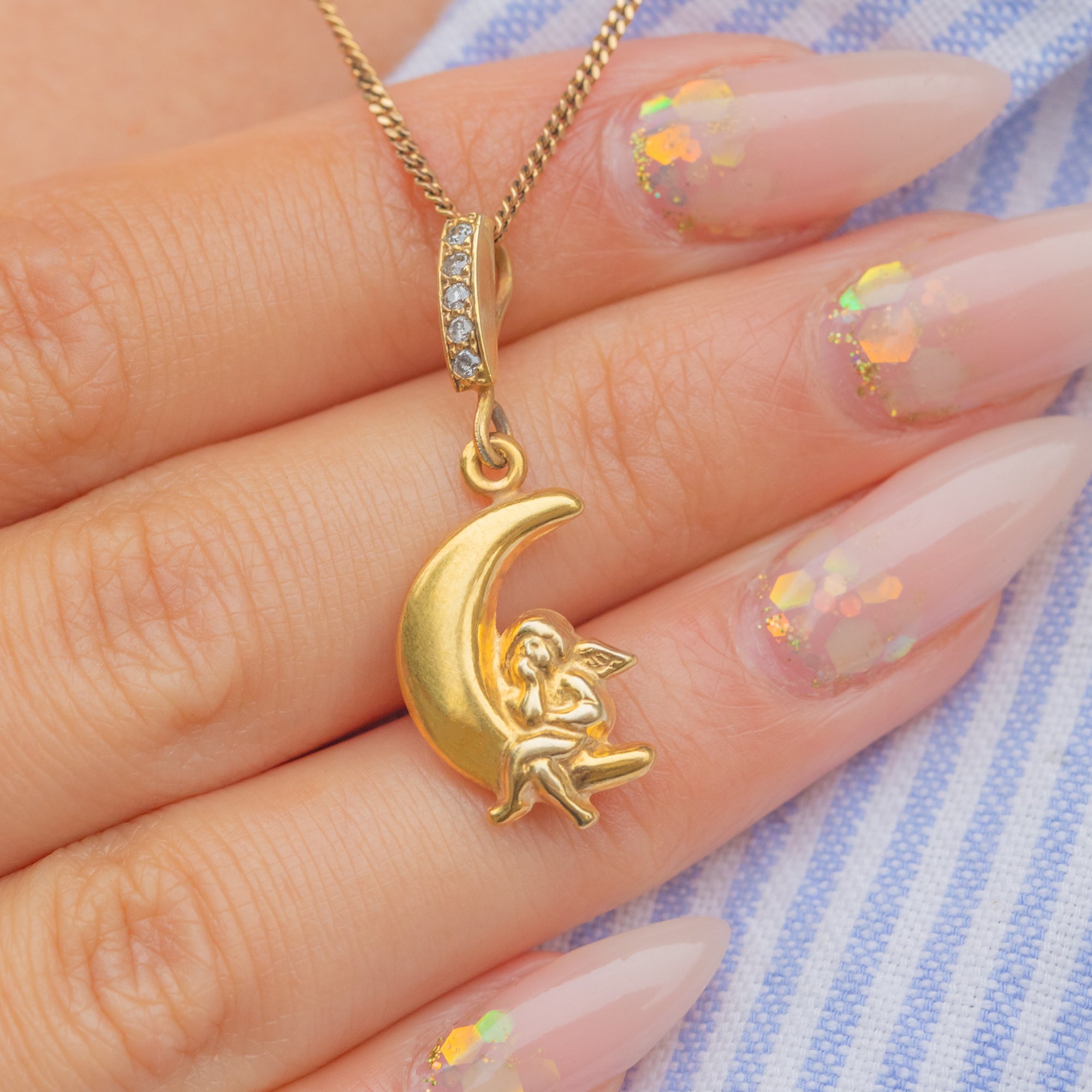 EXCELLENT: The charm is in superb condition. The cherub and crescent moon are well-detailed, the Gold is smooth and polished, and the Diamond is bright and securely set. The jump ring is sound and ready to wear.