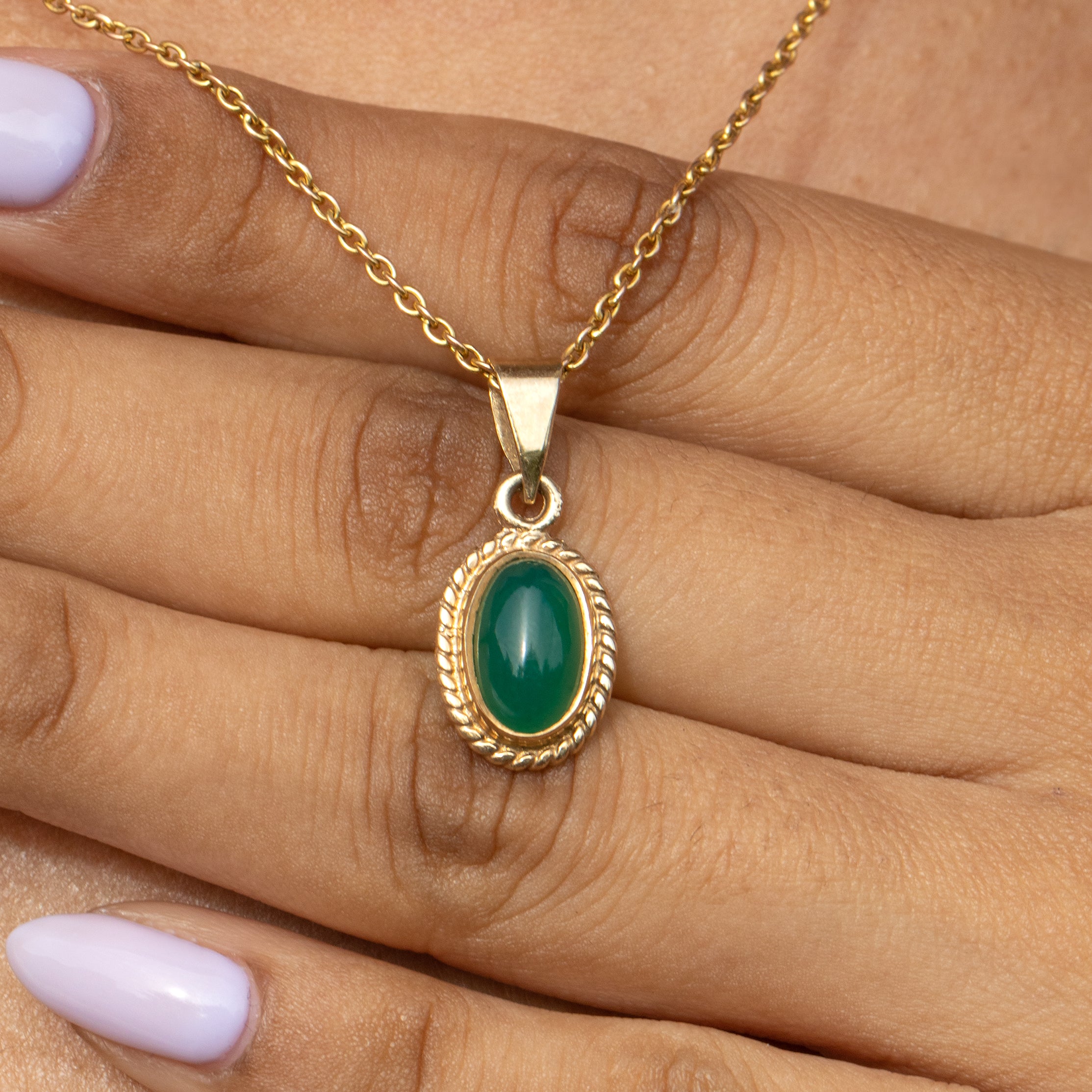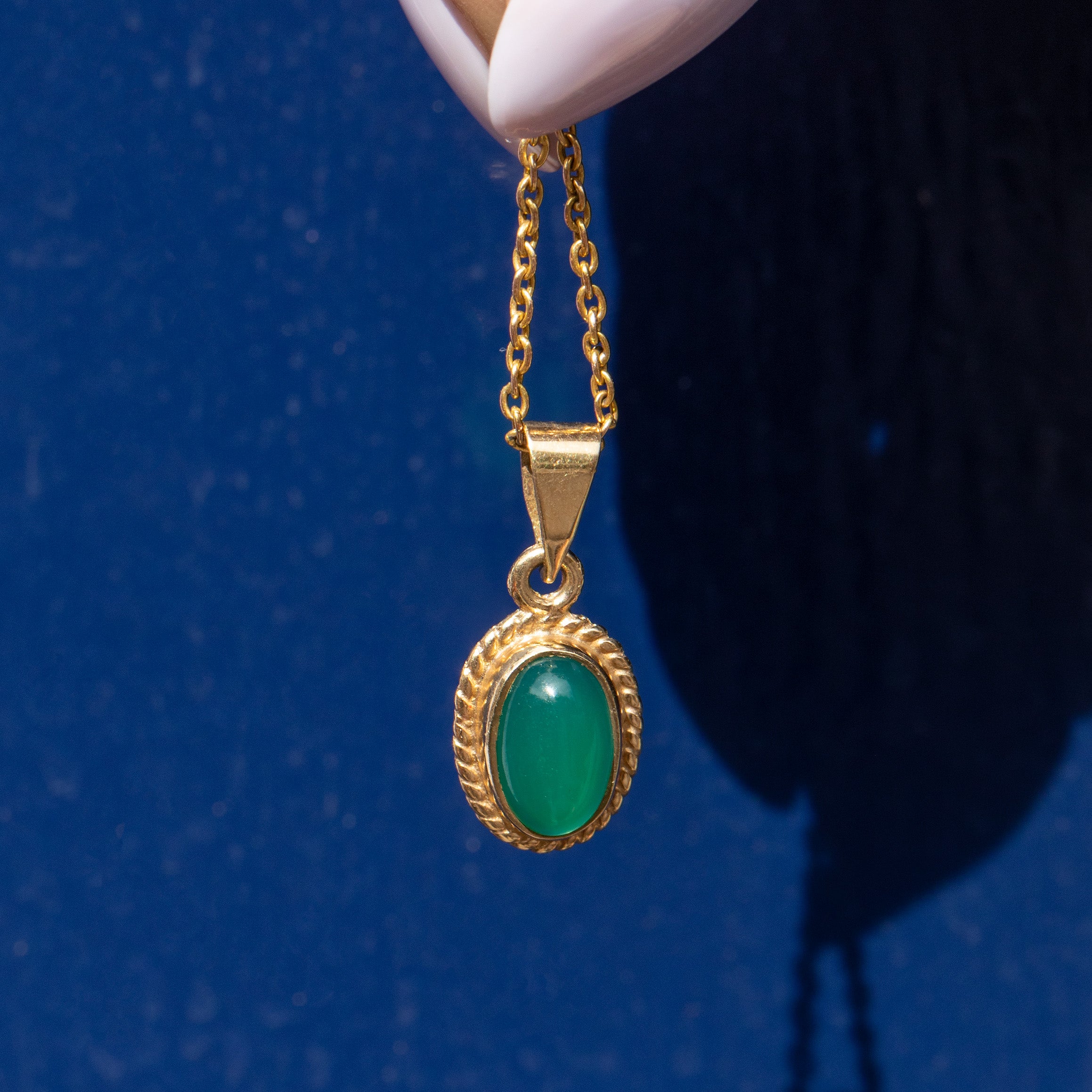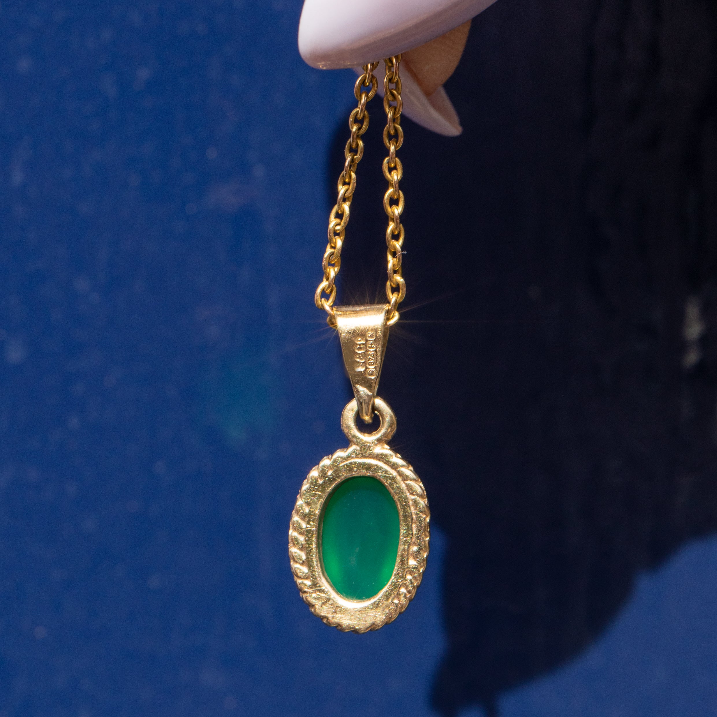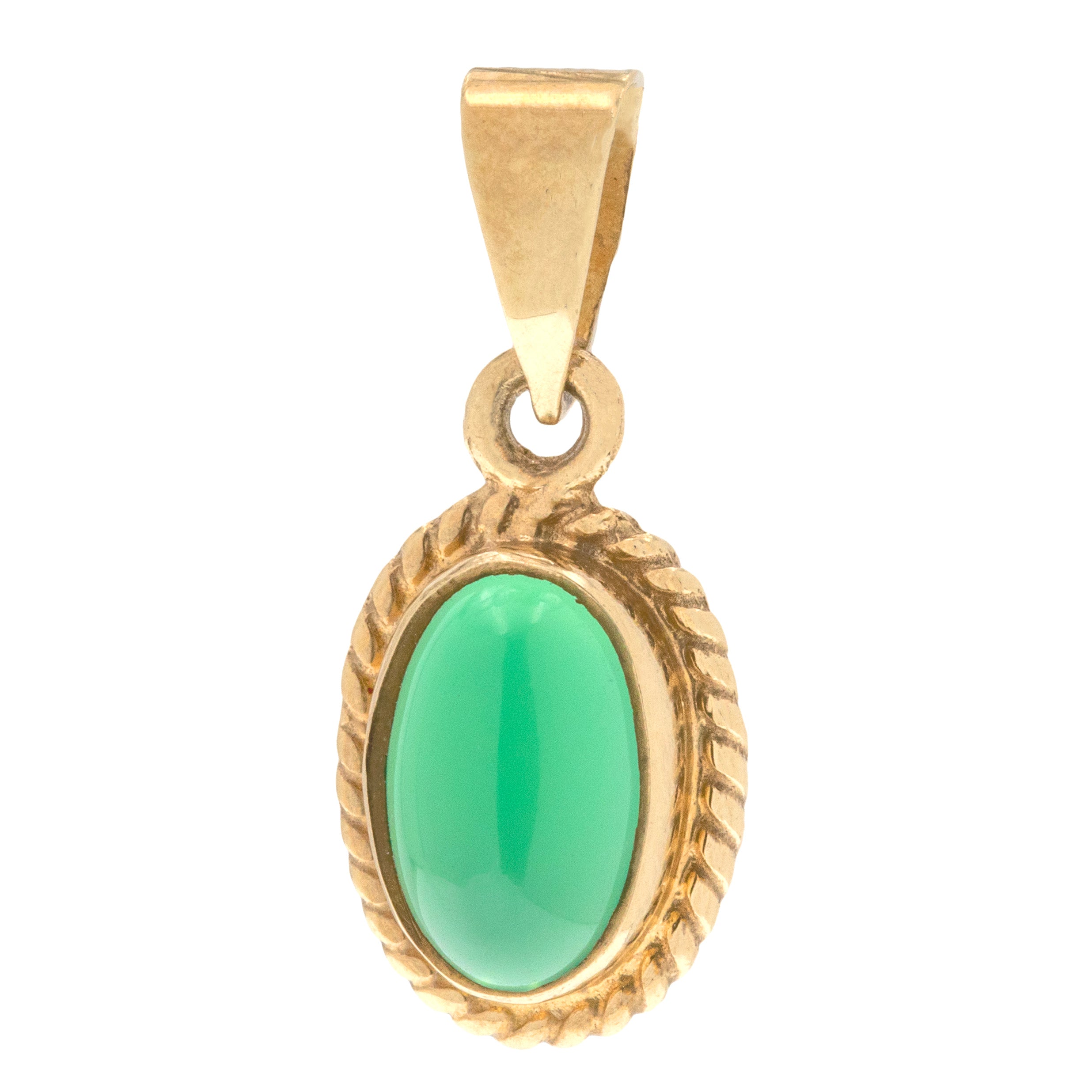 EXCELLENT. This 9ct Gold Chrysoprase charm is in excellent condition! The cabochon cut Chrysoprase is smooth to the touch, secure within the bezel setting, and flaunts mouthwatering hues. The rope detailing is securely soldered and crisp, with no dings to note. This vintage pendant is ready to wear straight from your Lillicoco box!