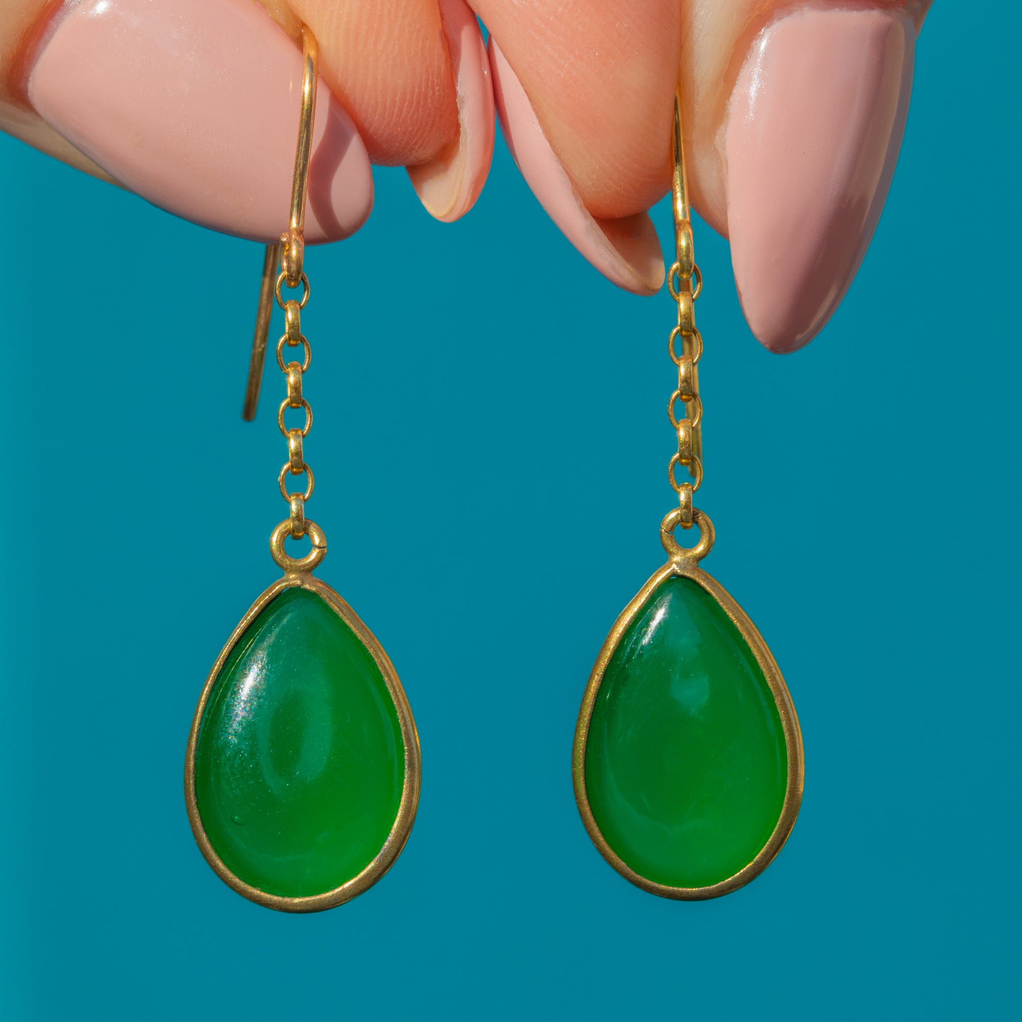 You will instantly become bewitched by these 9ct Gold Chrysoprase pear drop earrings! Gorgeous emerald-green glossy Chrysoprase teardrops are suspended from Gold gilt, and will add a verdant pop to every outfit.