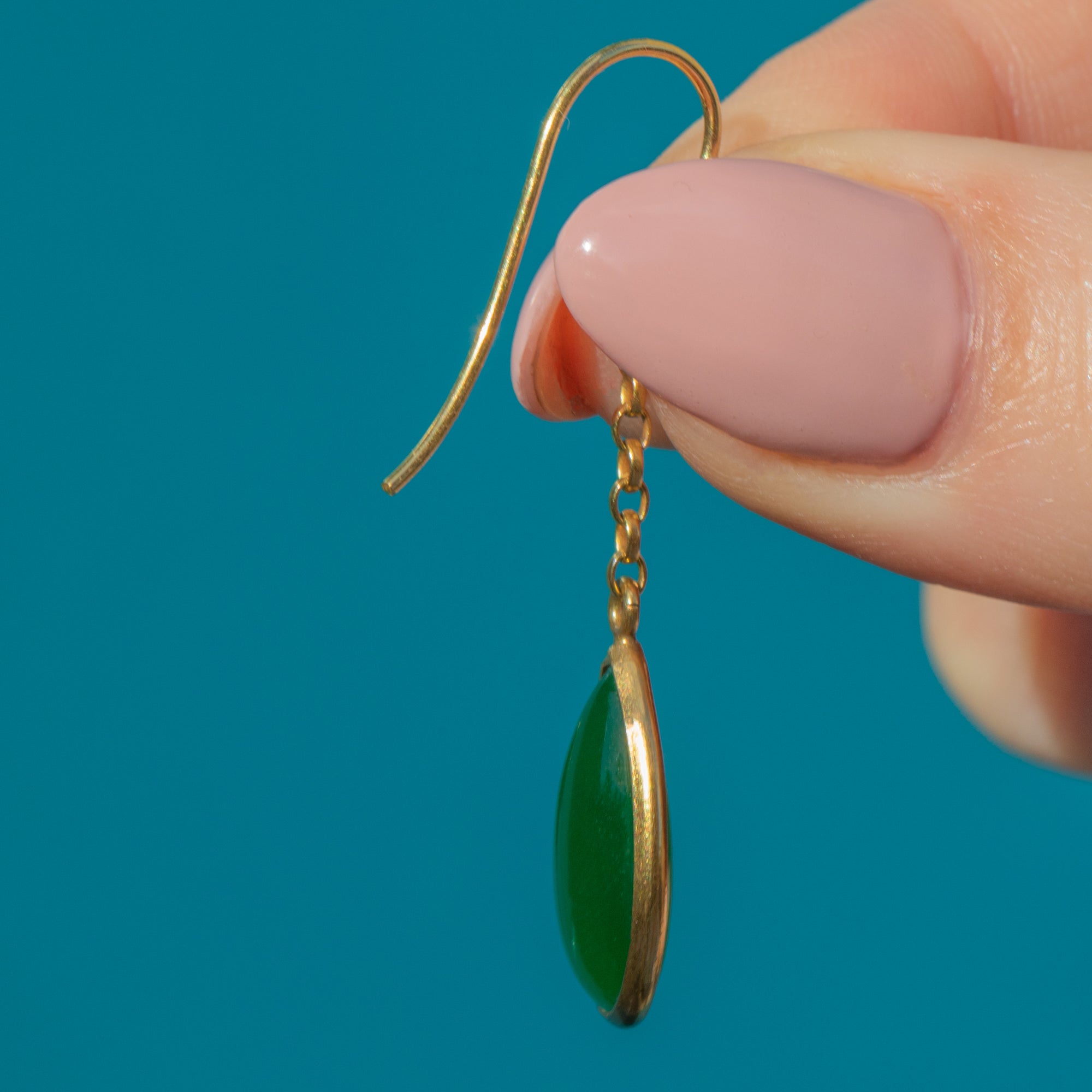 EXCELLENT. These 9ct Gold Chrysoprase pear drop earrings are in fantastic condition throughout. The Chrysoprase drops have no chips or scratches and the Gold gilt chain feels robust and secure. Overall, a stunning pair of mid-century vintage earrings!