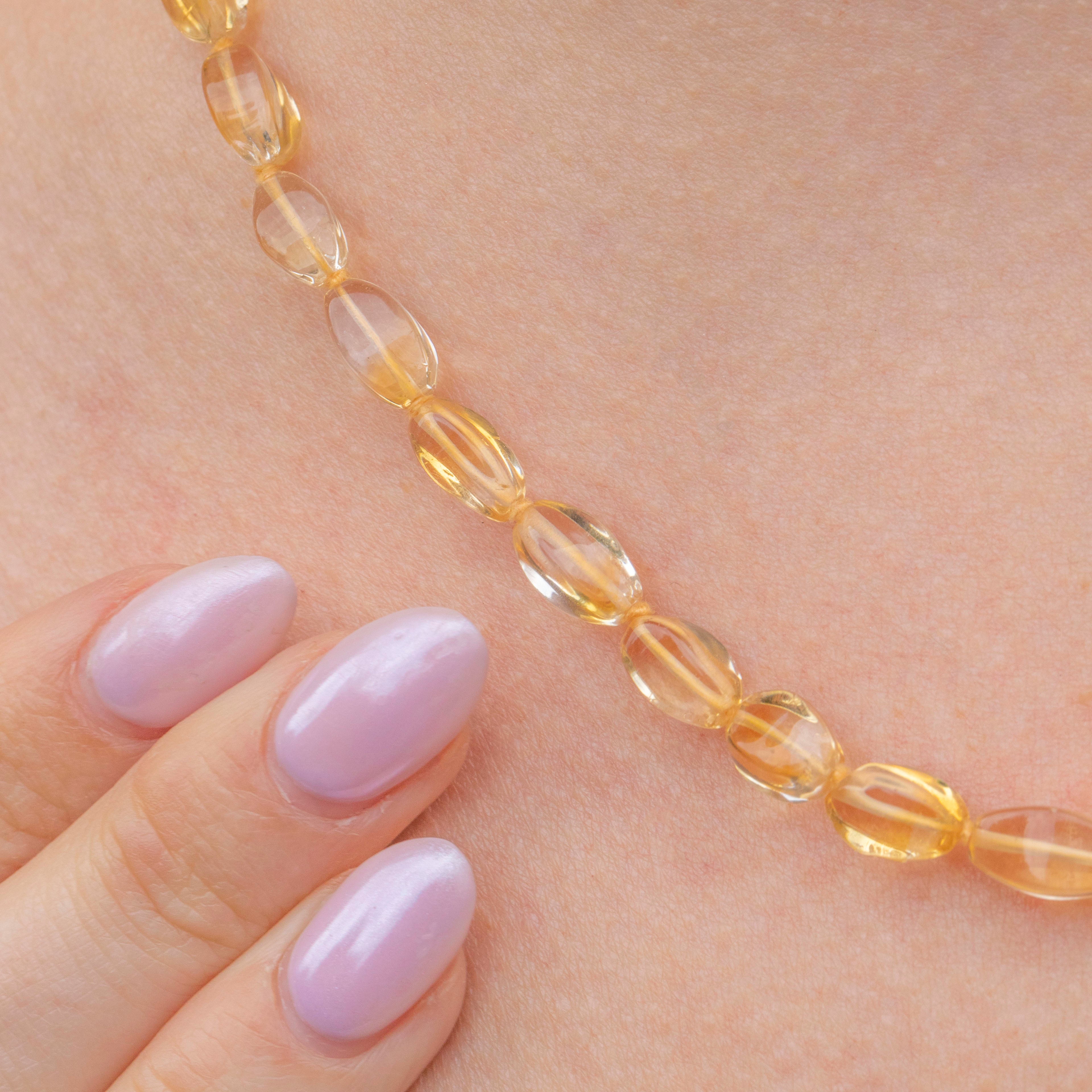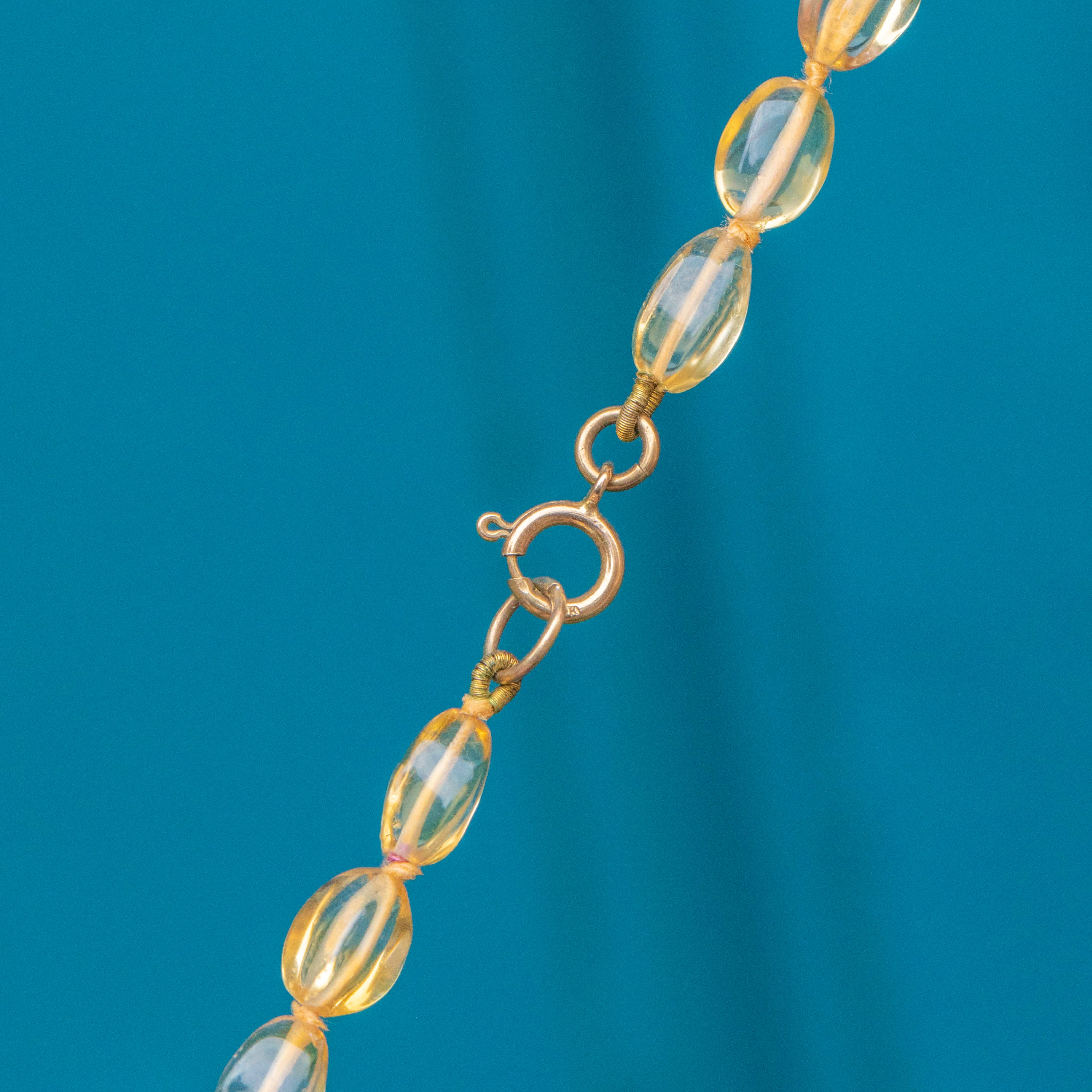 VERY GOOD-EXCELLENT. This 9ct Gold Citrine beaded necklace is in a wonderful condition. The Citrines are all present and securely strung, with only a few minor fleabites throughout commensurate with age, and do not impact the overall appearance of the necklace. Her 9ct Gold bolt ring is in perfect working order; she's ready to wear straight from your pink Lillicoco box!
