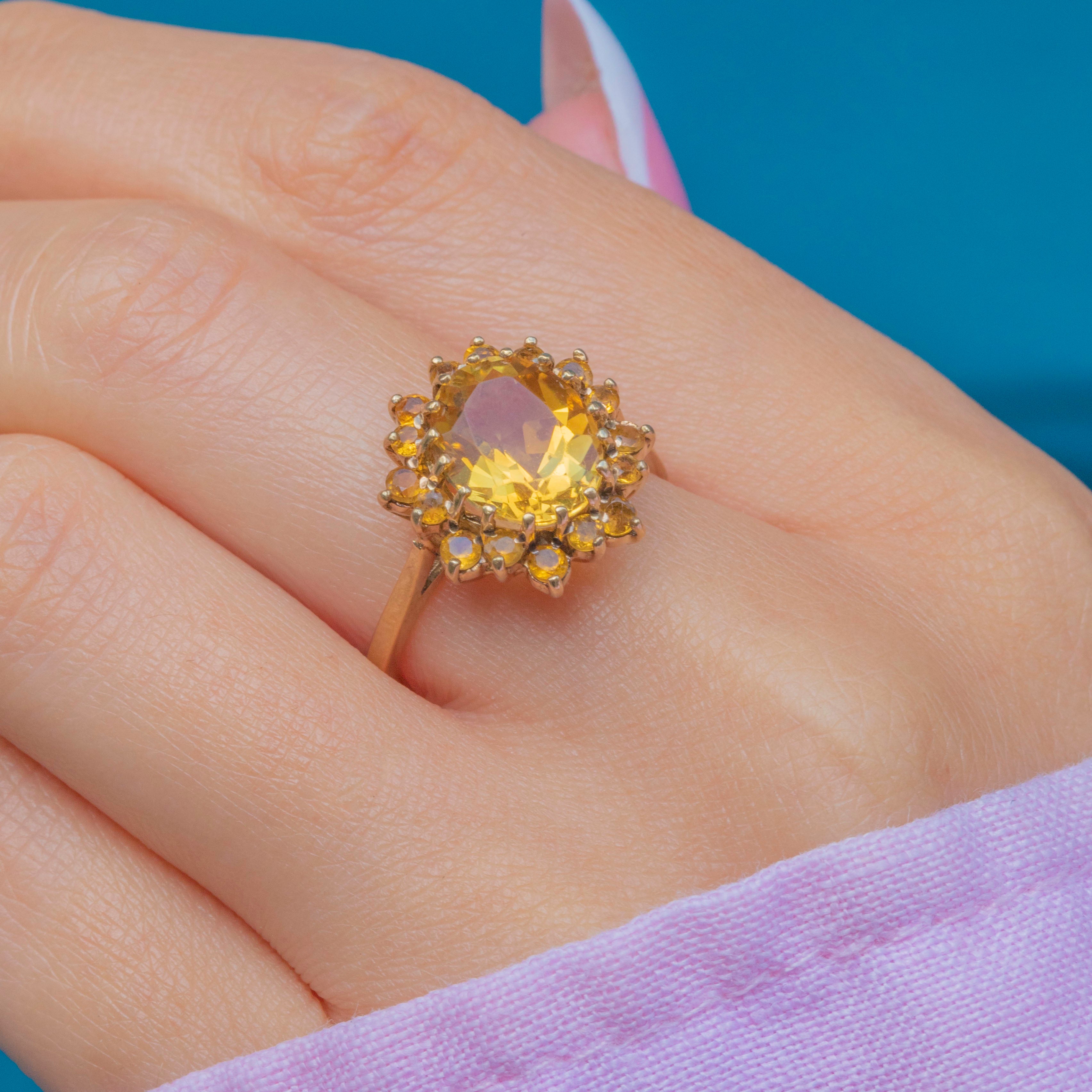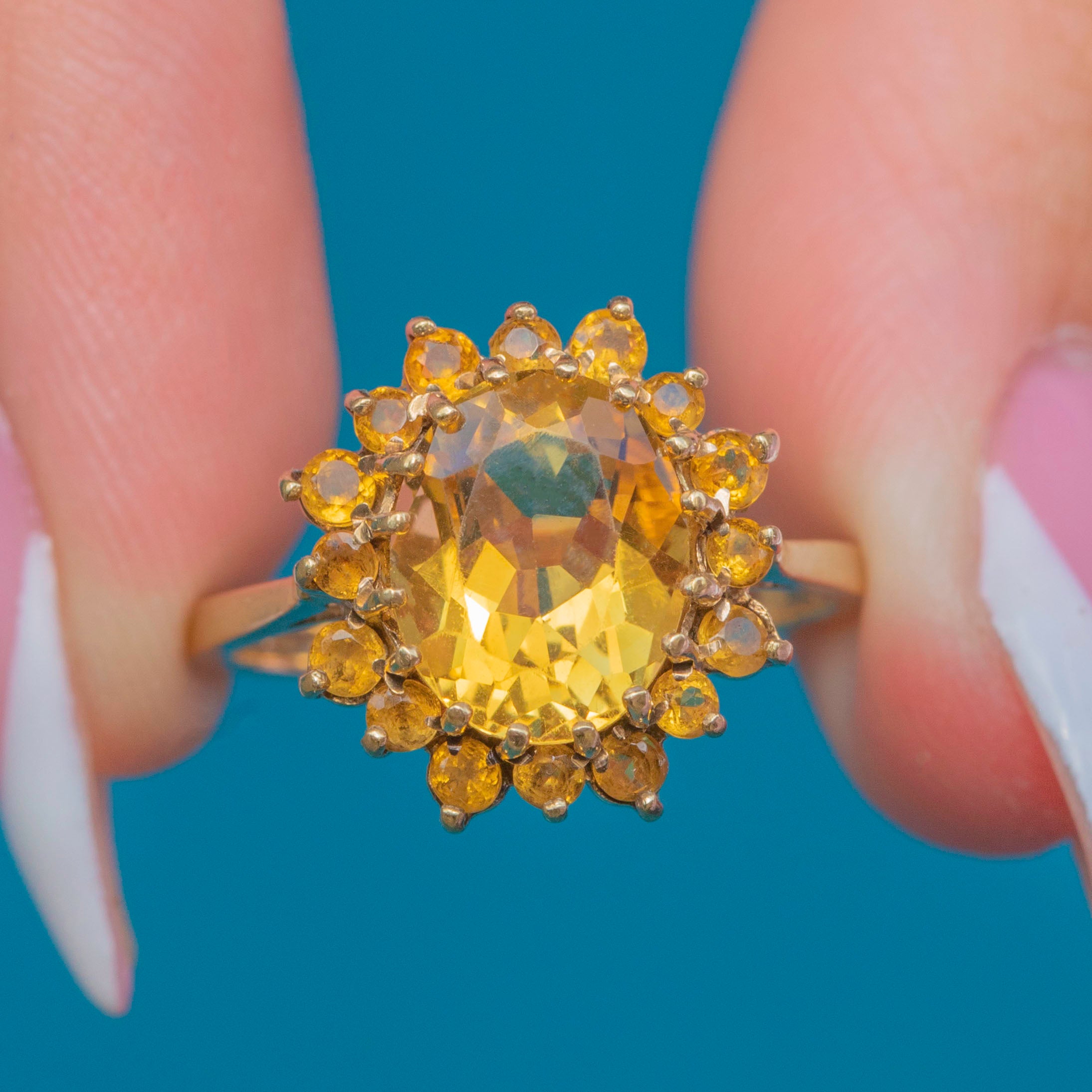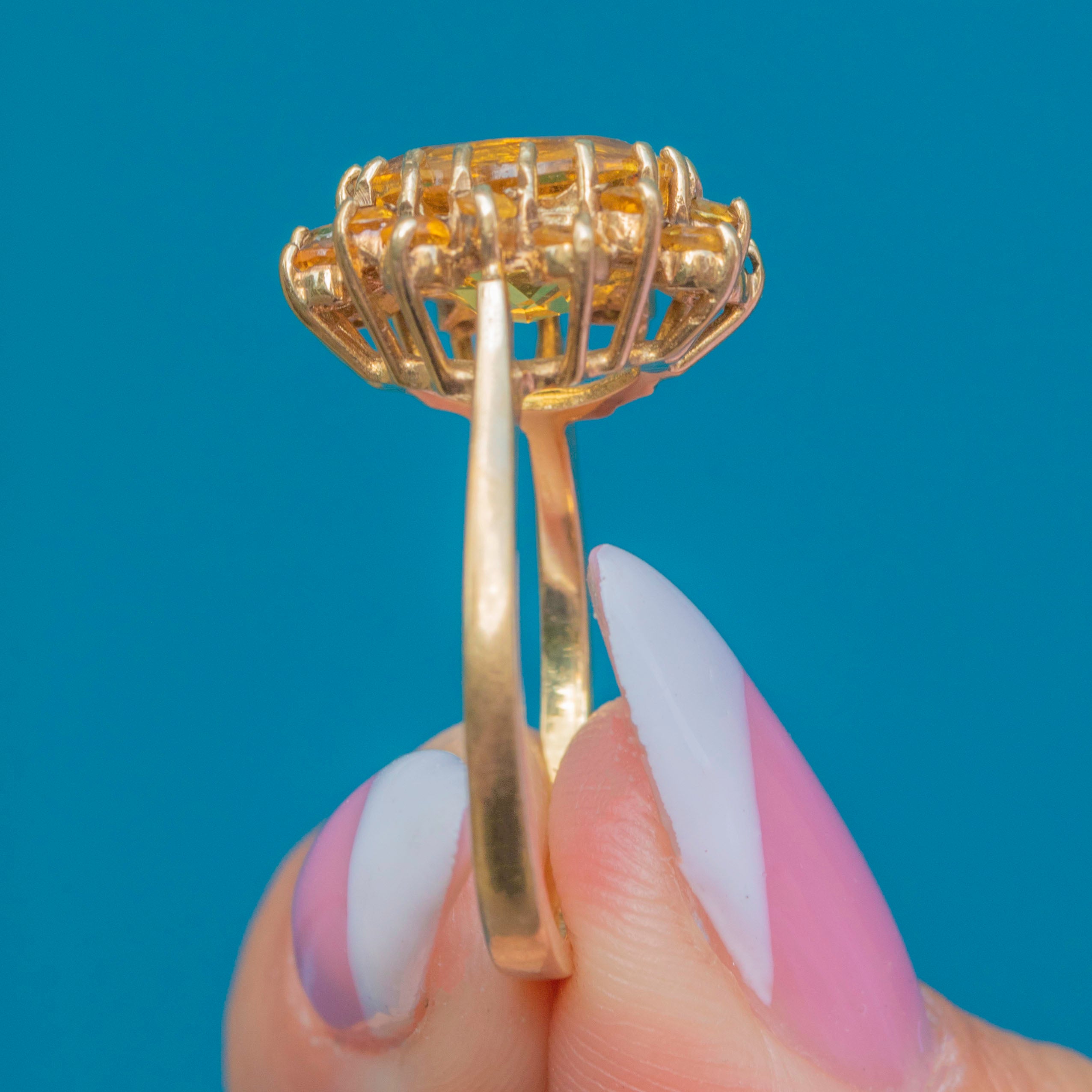 A bright and sunny piece, this vintage ring displays a large Citrine cluster boasting 2.00ct and pouring sweet honey nectar hues from its crisp facets.