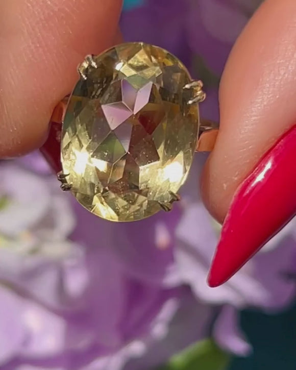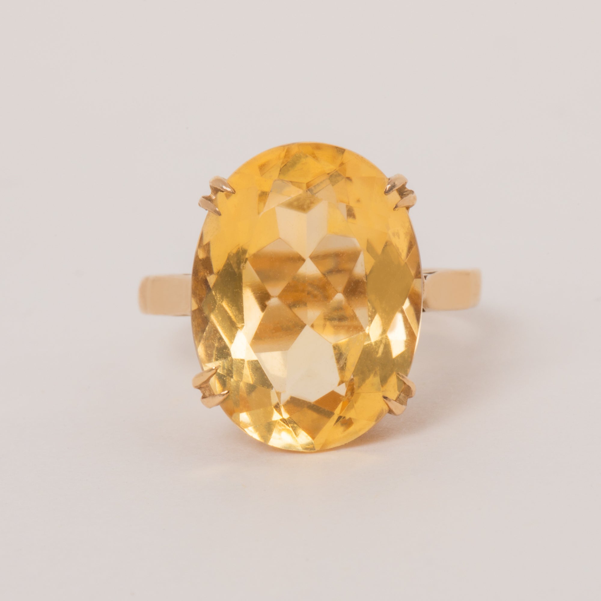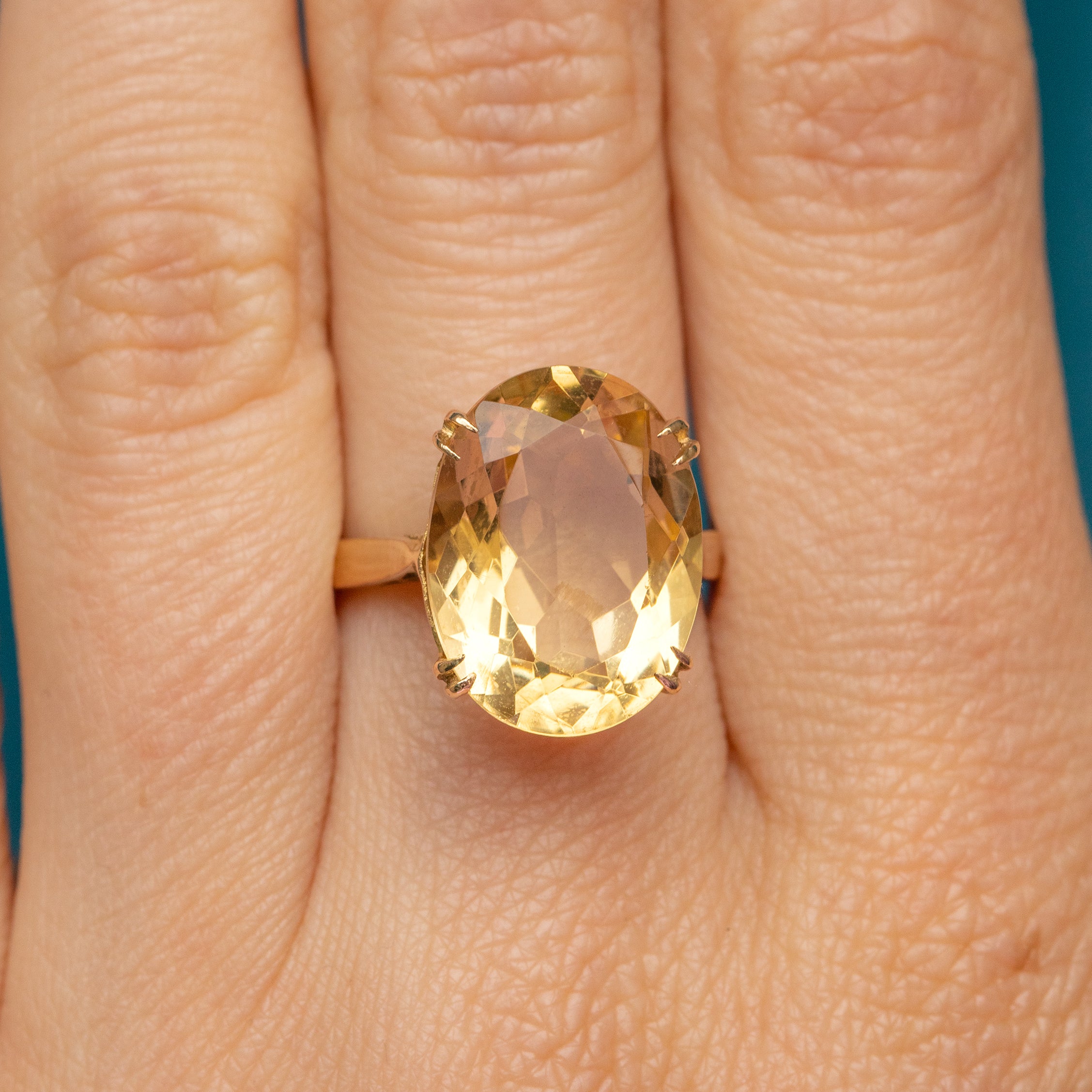 EXCELLENT. A divine 9ct Gold Citrine cocktail ring in beautiful condition! The Citrine sits securely within the claw settings, allowing the light to stream through from all angles. With a smooth ring band, she sits comfortably upon your hand. The gallery is all in pristine condition and the 9ct Gold is buttery throughout. With such sheer beauty and radiance, this antique Citrine ring must be yours!
