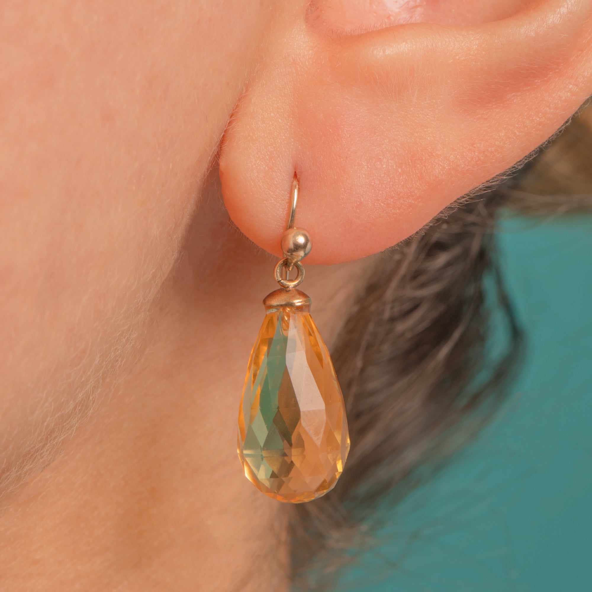 Glowing with honeyed luminosity, these Victorian 9ct Gold Citrine drop earrings are a study in understated elegance. Each transparent teardrop Citrine is expertly briolette-cut for scintillating sparkle, capped with smooth yellow Gold and suspended from bead-topped shepherd’s hooks for graceful movement.