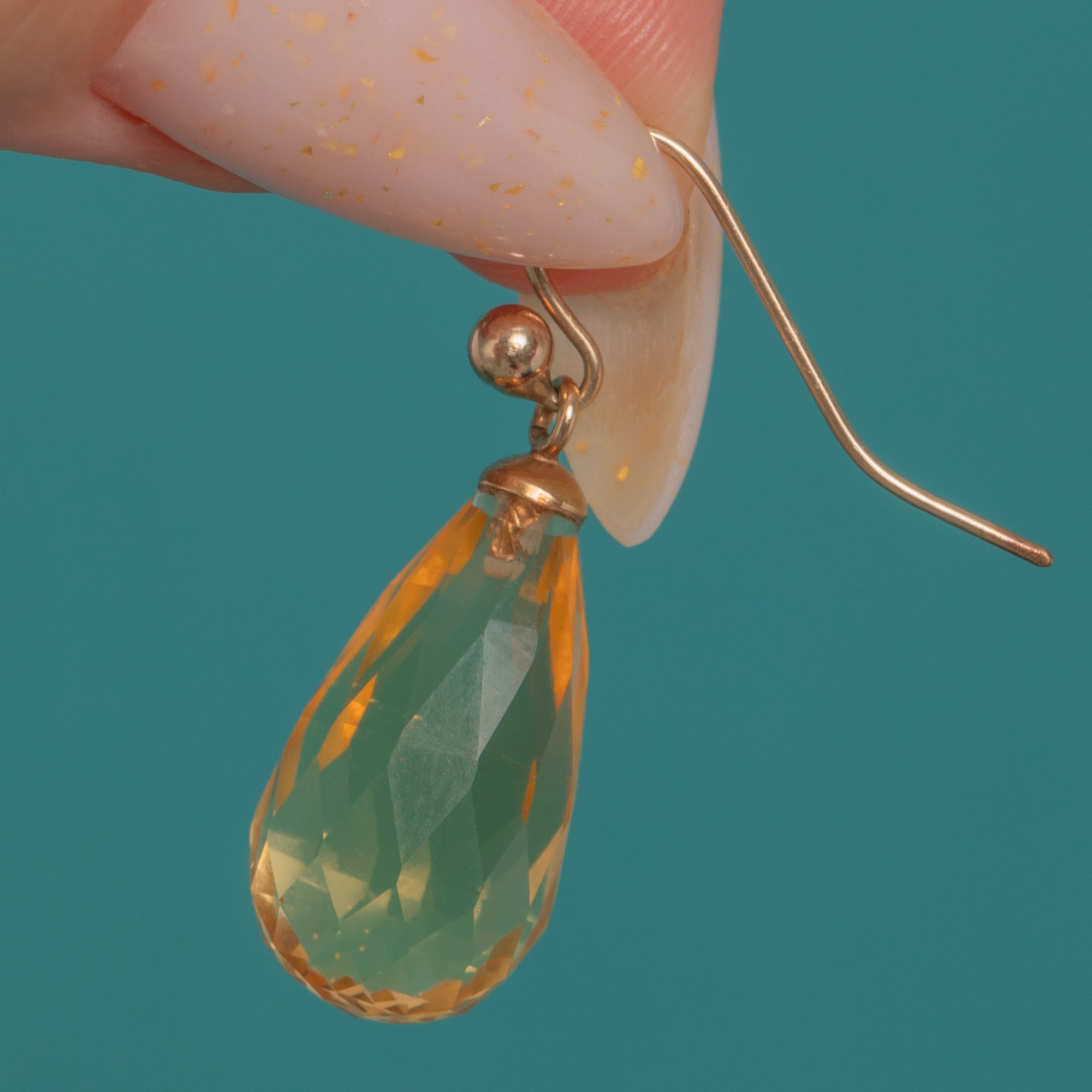 EXCELLENT: The Citrines are bright with crisp faceting and only light, minor abrasions visible under magnification; no obvious chips or cracks. Gold caps, rings and hooks are secure with gentle surface wear and a soft, even patina; ear wires are straight and functional. No visible repairs; a subtle trace of adhesive at the cap junction is typical for briolette settings.