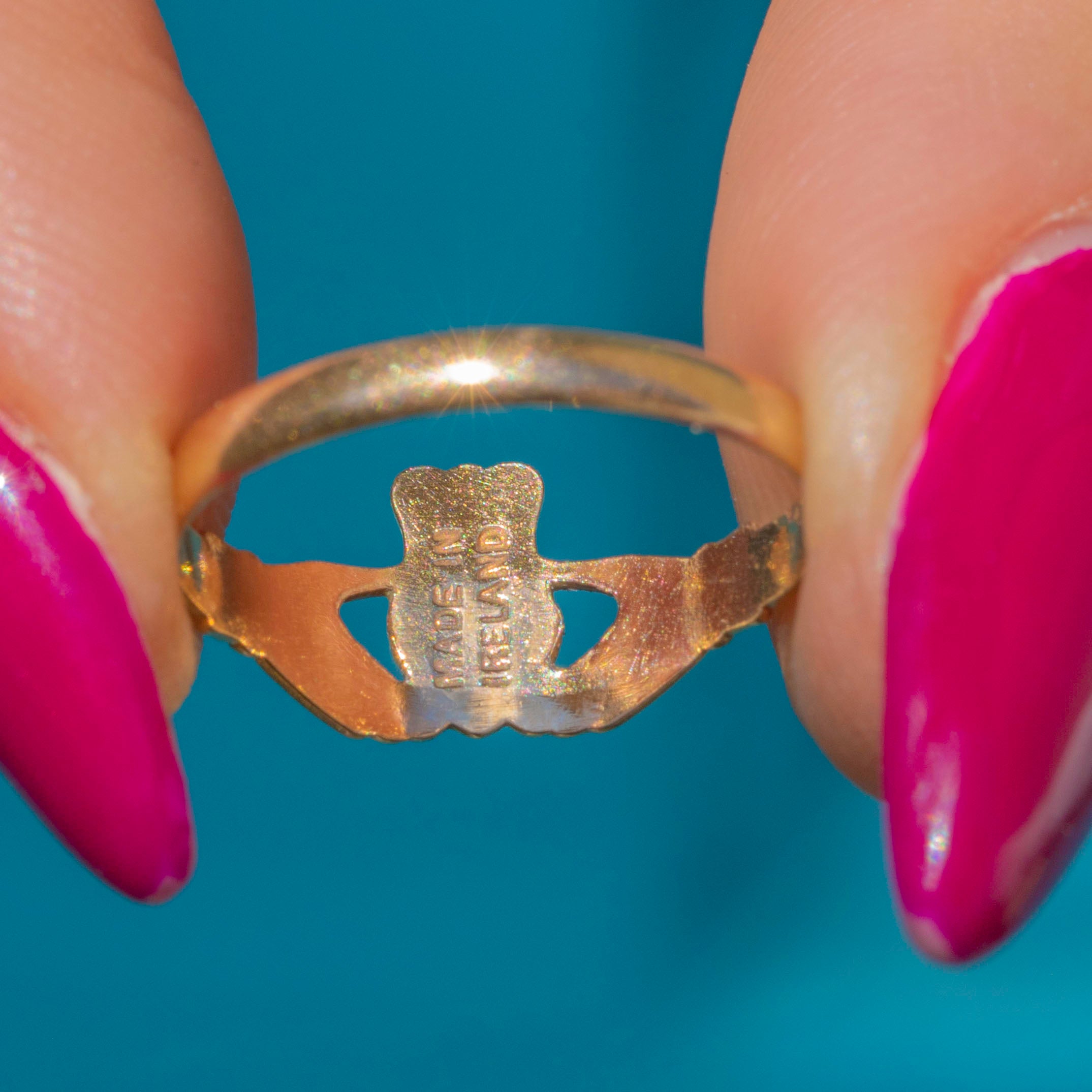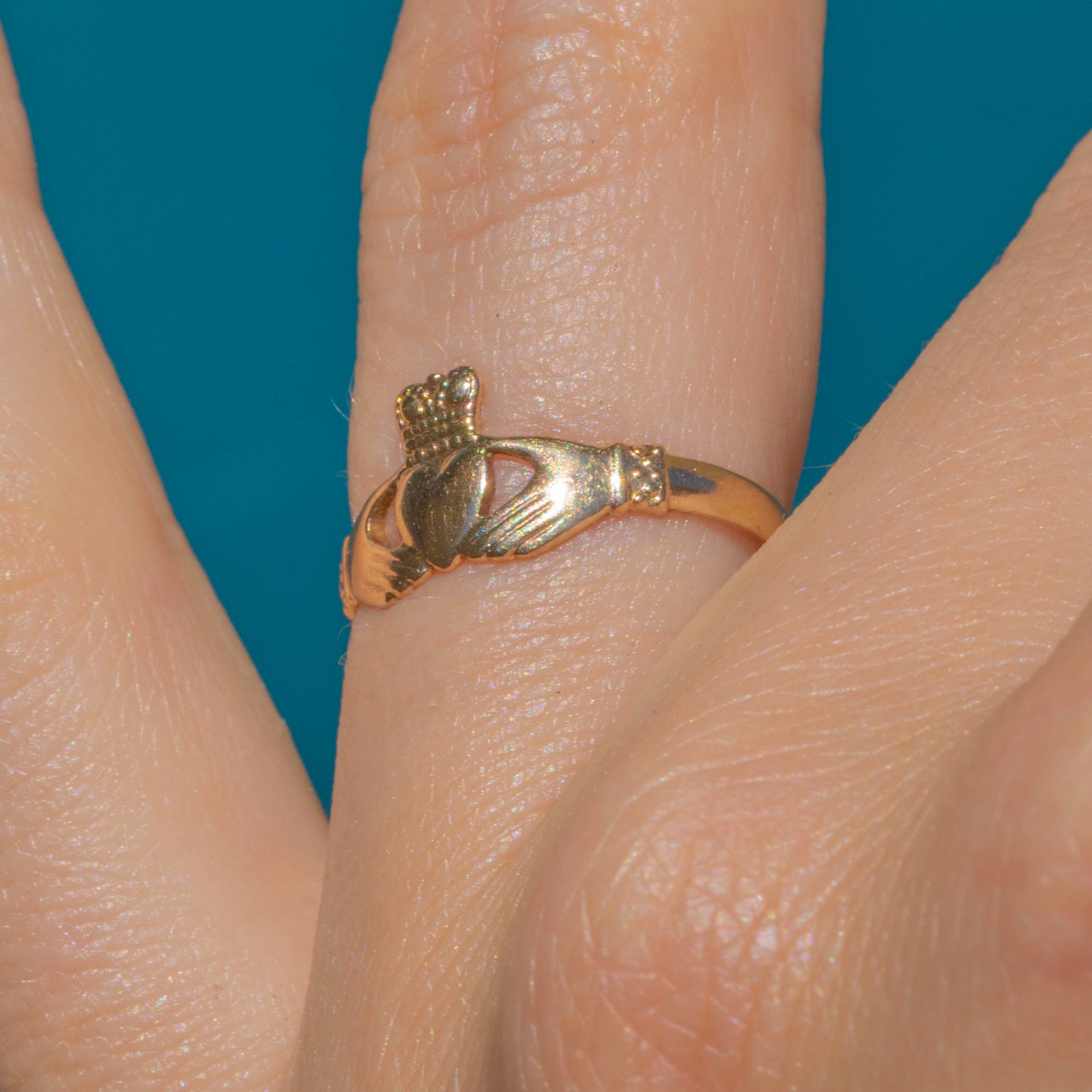 VERY GOOD-EXCELLENT: The Gold is bright and has retained a nice sheen, with only minimal signs of wear. The band is not perfectly round, but it remains comfortable to wear. With little else to note, this Claddagh ring is ready to be worn and enjoyed!