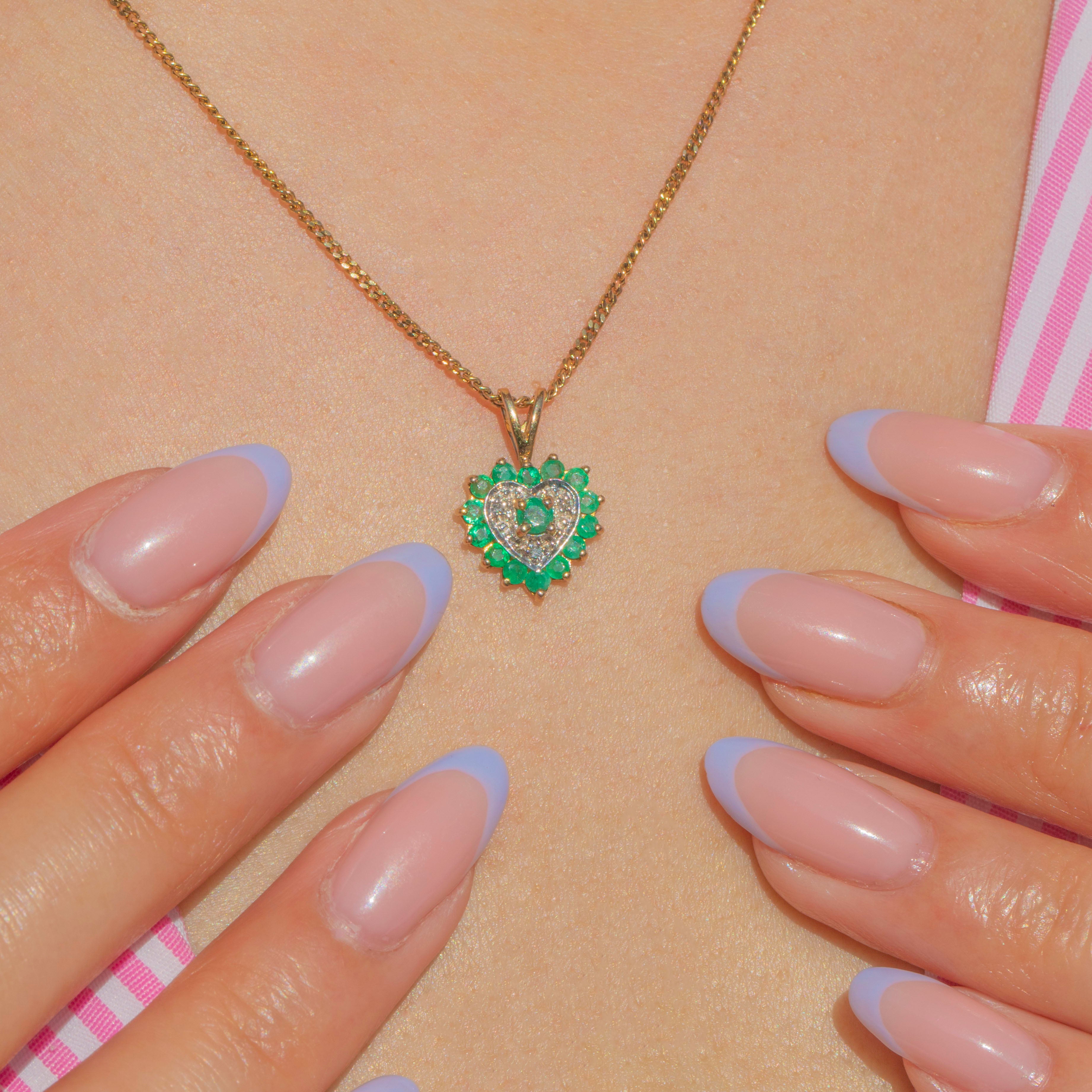 Elegant and stylish, the Emeralds are accompanied by twinkling Diamonds, all set in buttery 9ct Gold, making this the most luxurious vintage heart pendant!