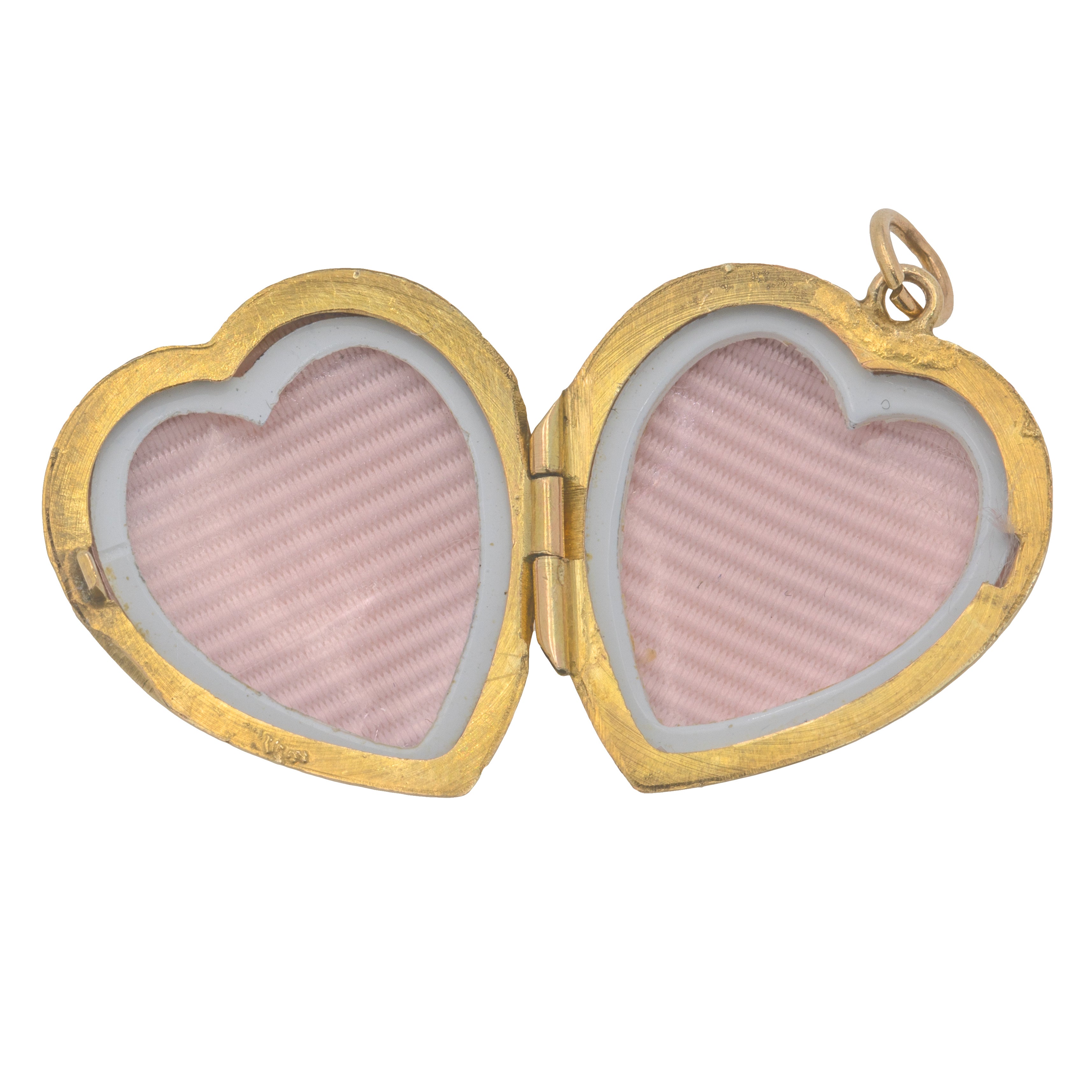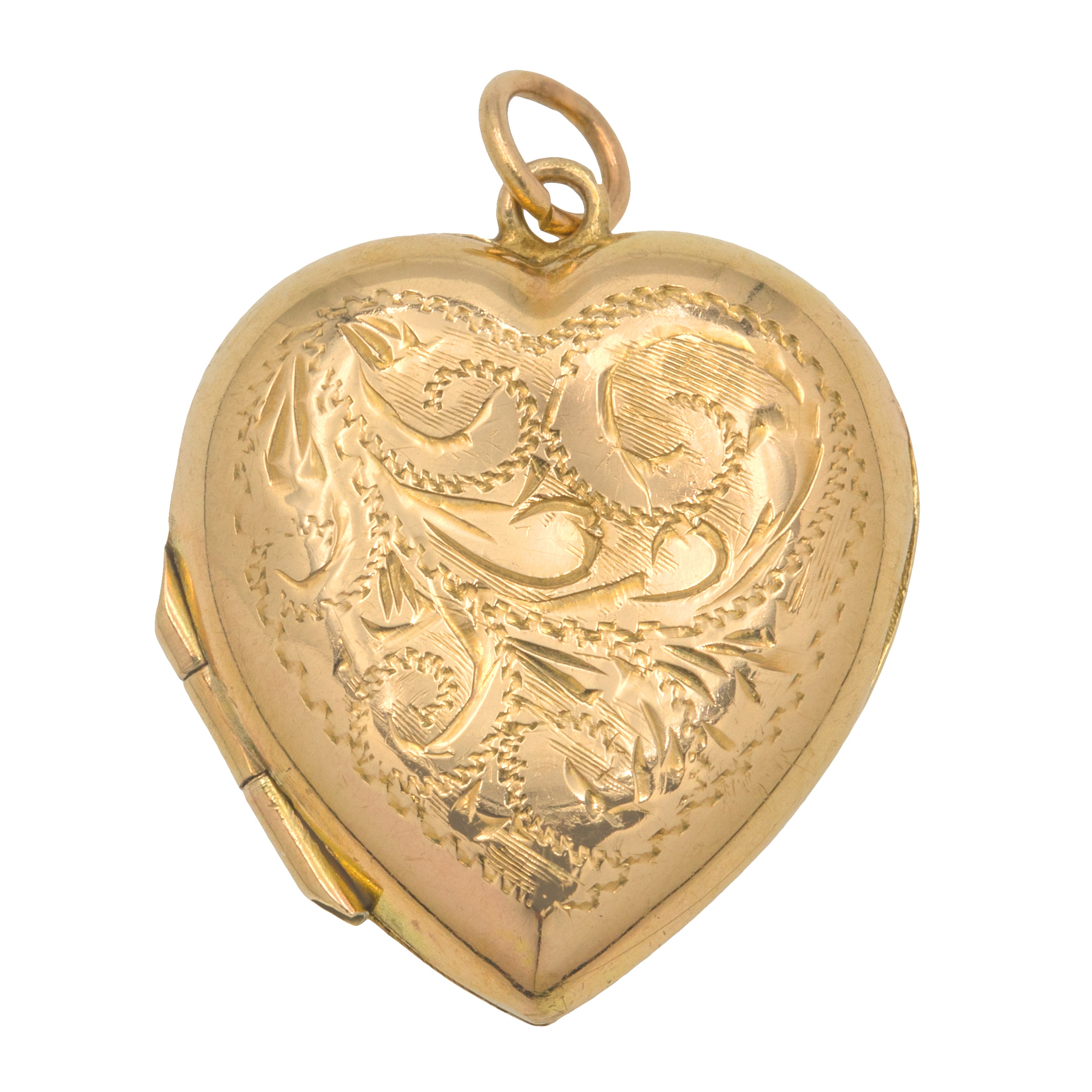VERY GOOD. This 9ct Gold engraved heart locket is in very good condition. The Gold is buttery and smooth and the engraved details have remained crisp. There is some general wear on the locket including some light scuffs, and the photo frames are not original to the piece, but the locket closes with a "click" giving you peace of mind that your photographs will be held safely inside. With a full set of hallmarks, this is a collectible vintage locket ready to be suspended from your favorite Gold chain!