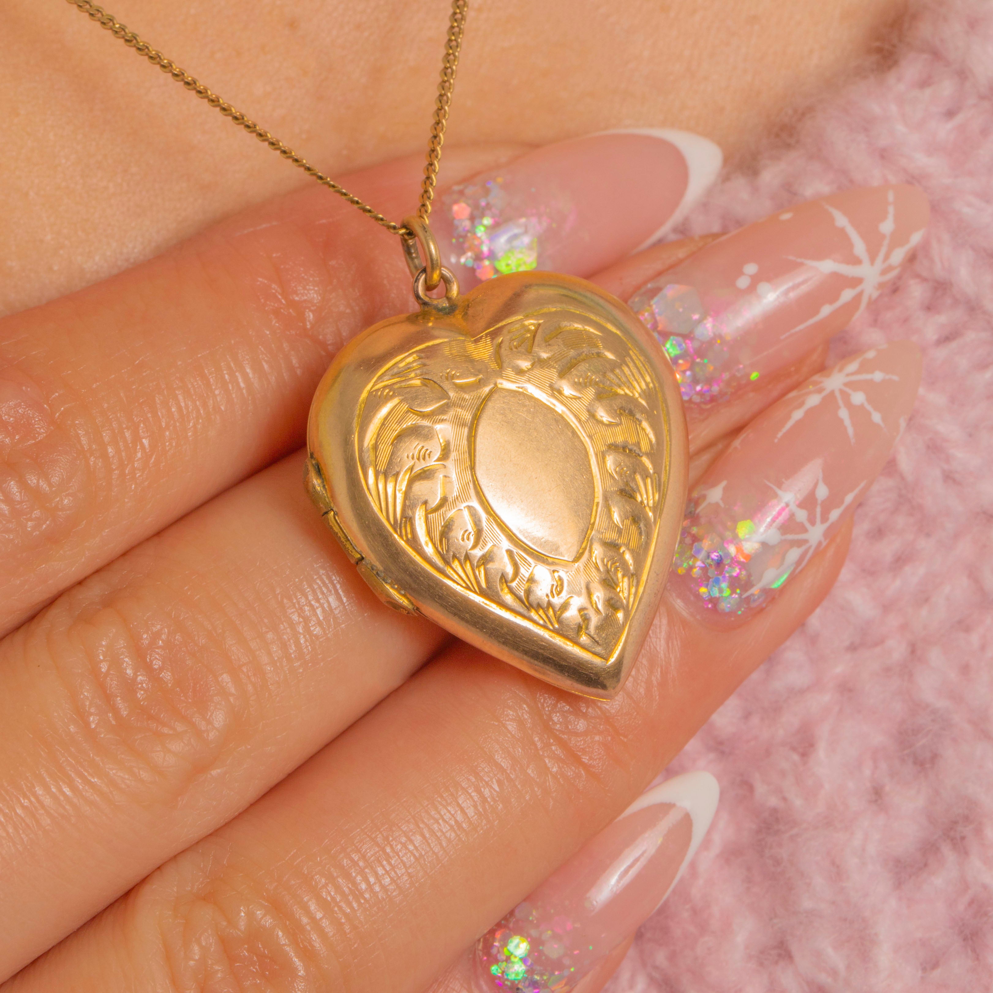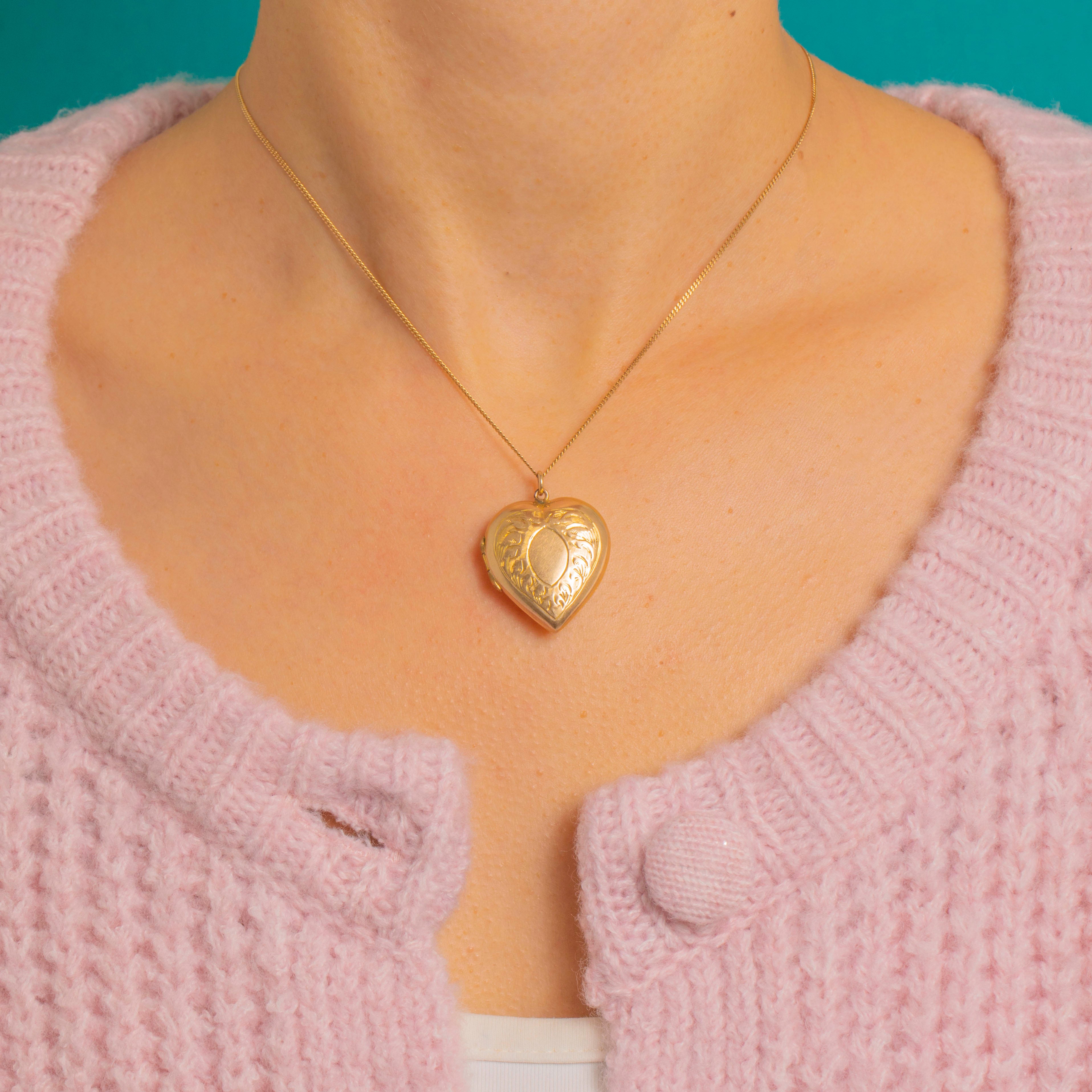 Romance in miniature, this Victorian heart locket is crafted in warm 9ct Gold with a delicately raised foliate and scrollwork border framing a smooth, blank central cartouche. Its gently domed heart silhouette and polished back give a timeless, elegant feel that wears beautifully every day.