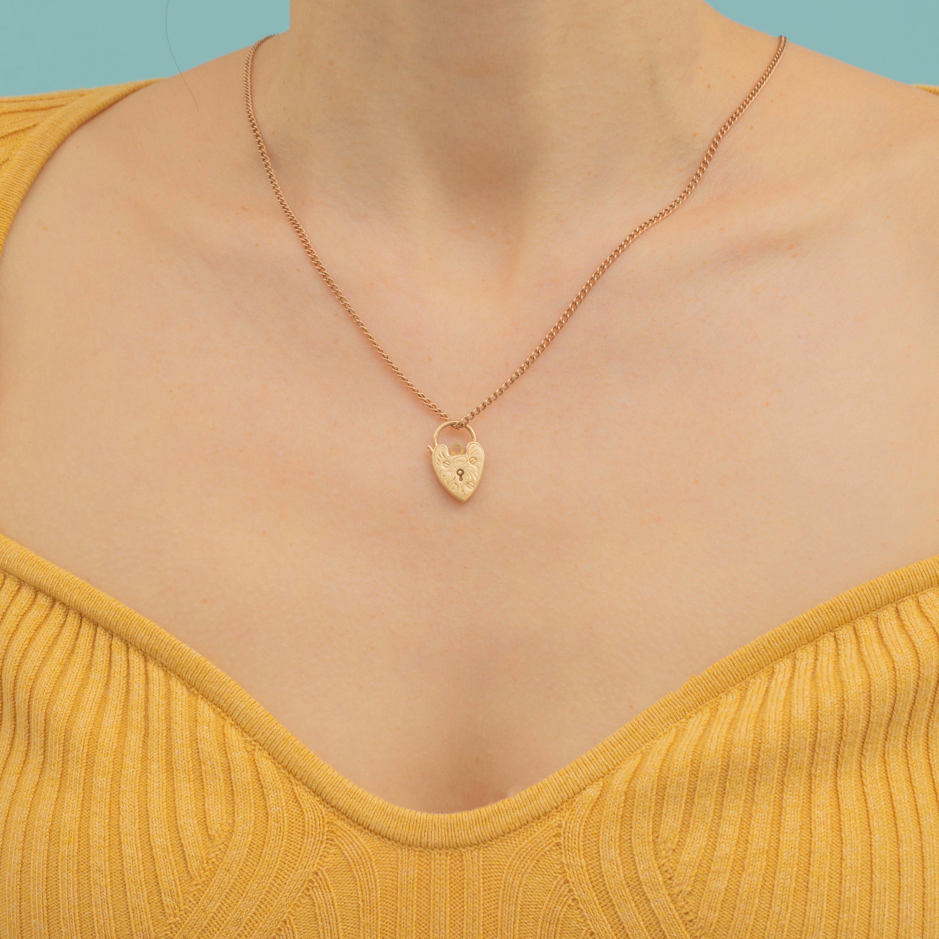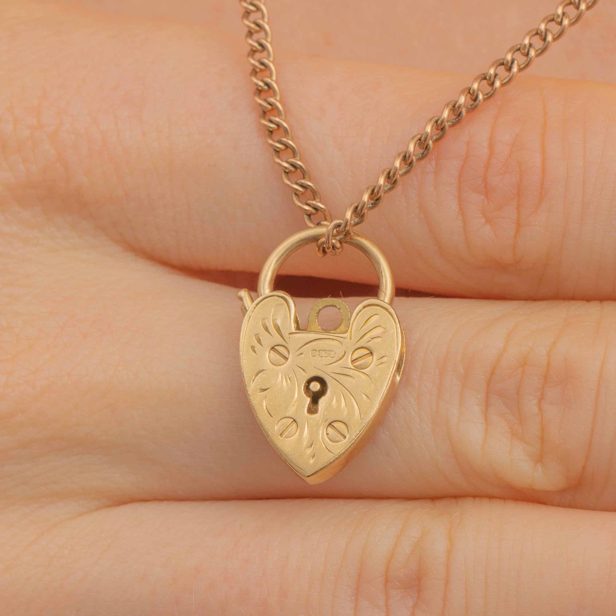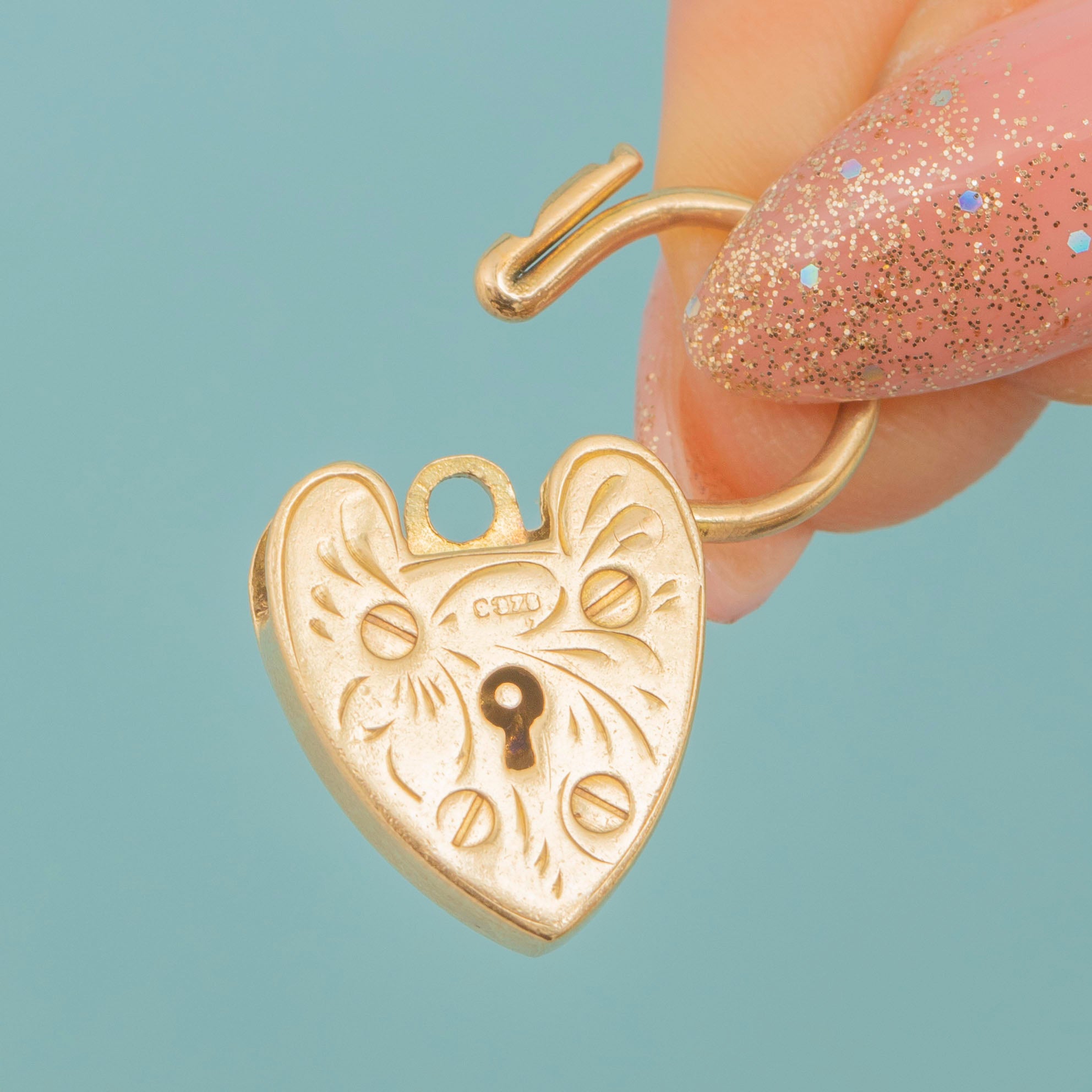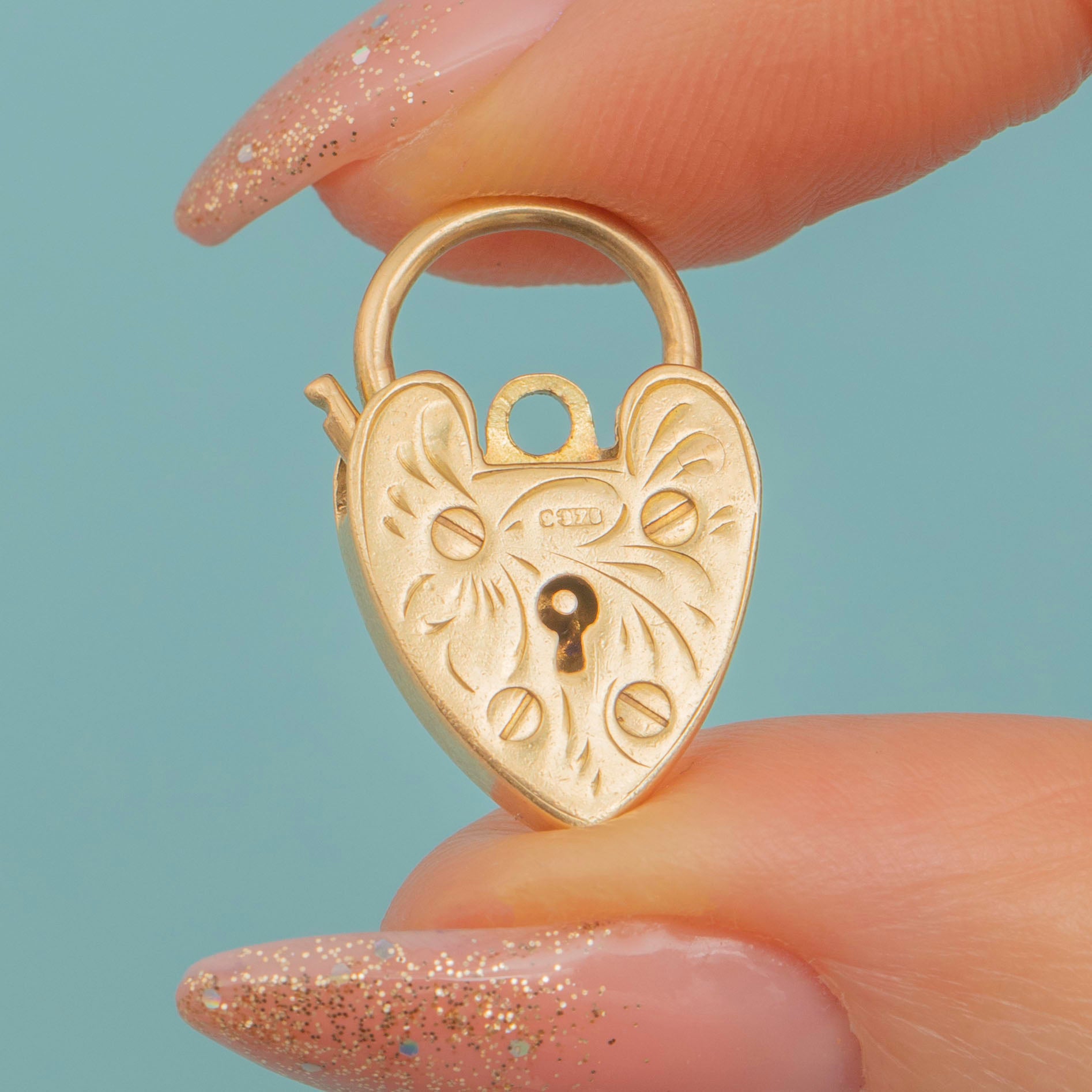 EXCELLENT With little to report, this antique 9ct Gold engraved heart padlock is in excellent condition. The engravings on the front are crisp and clear, oozing a romantic allure. The structural integrity of the padlock has kept well over the course of her lifetime. With her hasp closing with a 'click', she can be worn with absolute confidence!