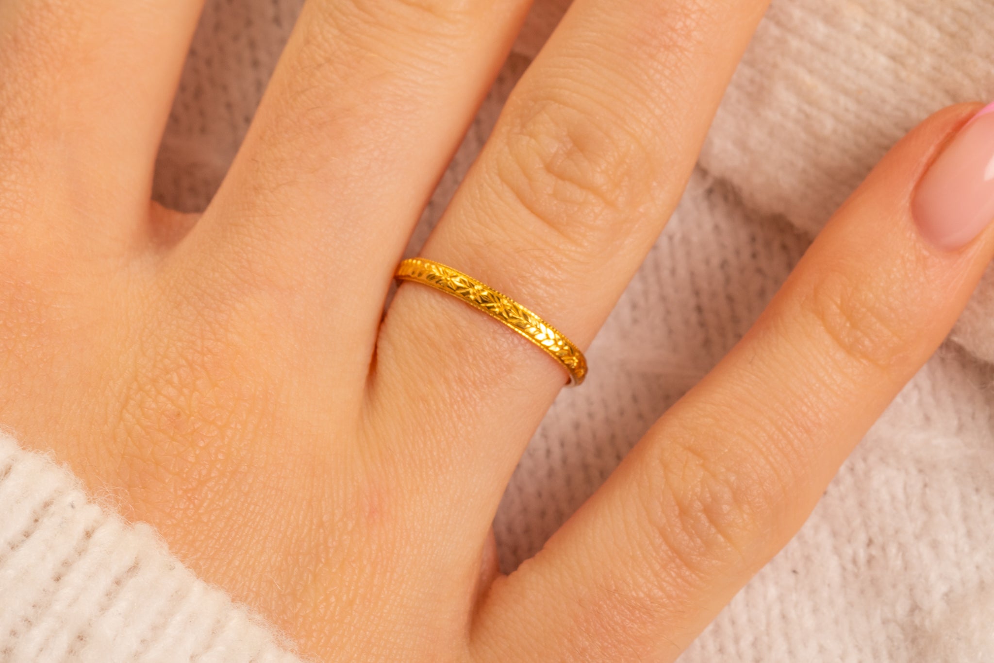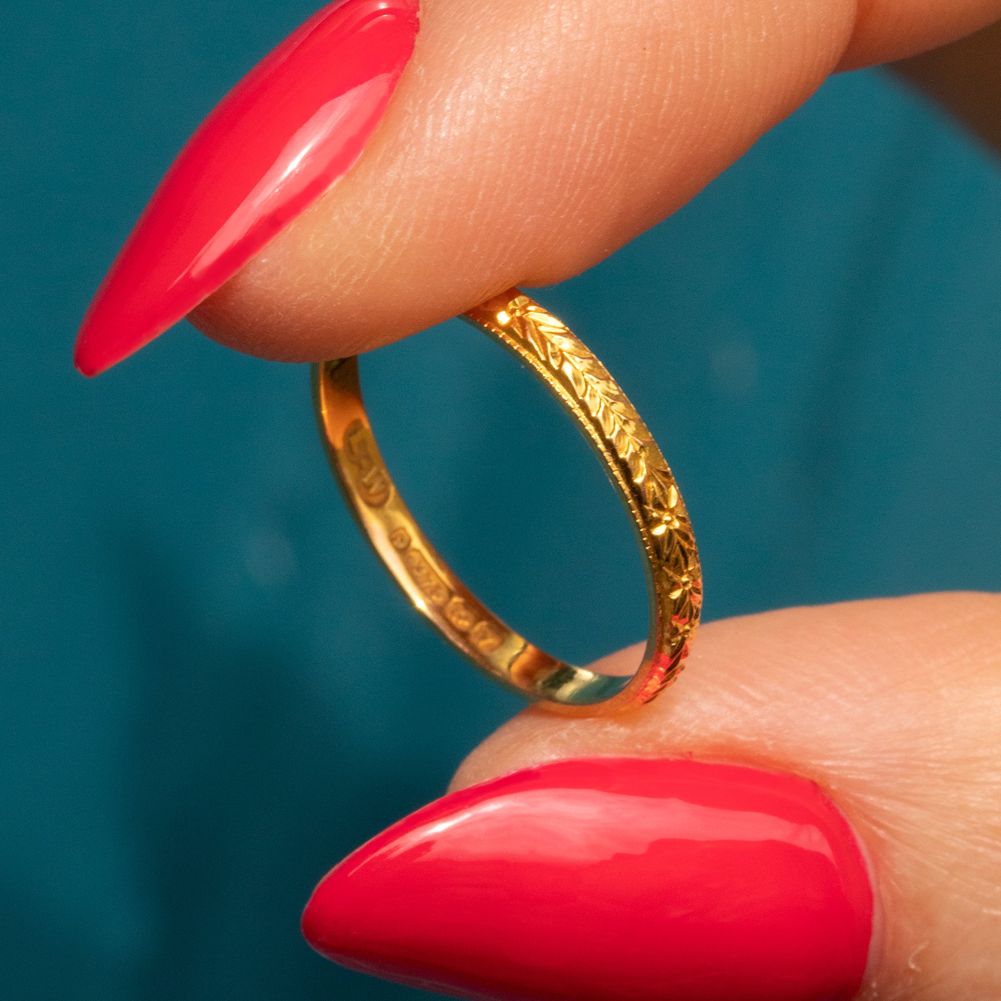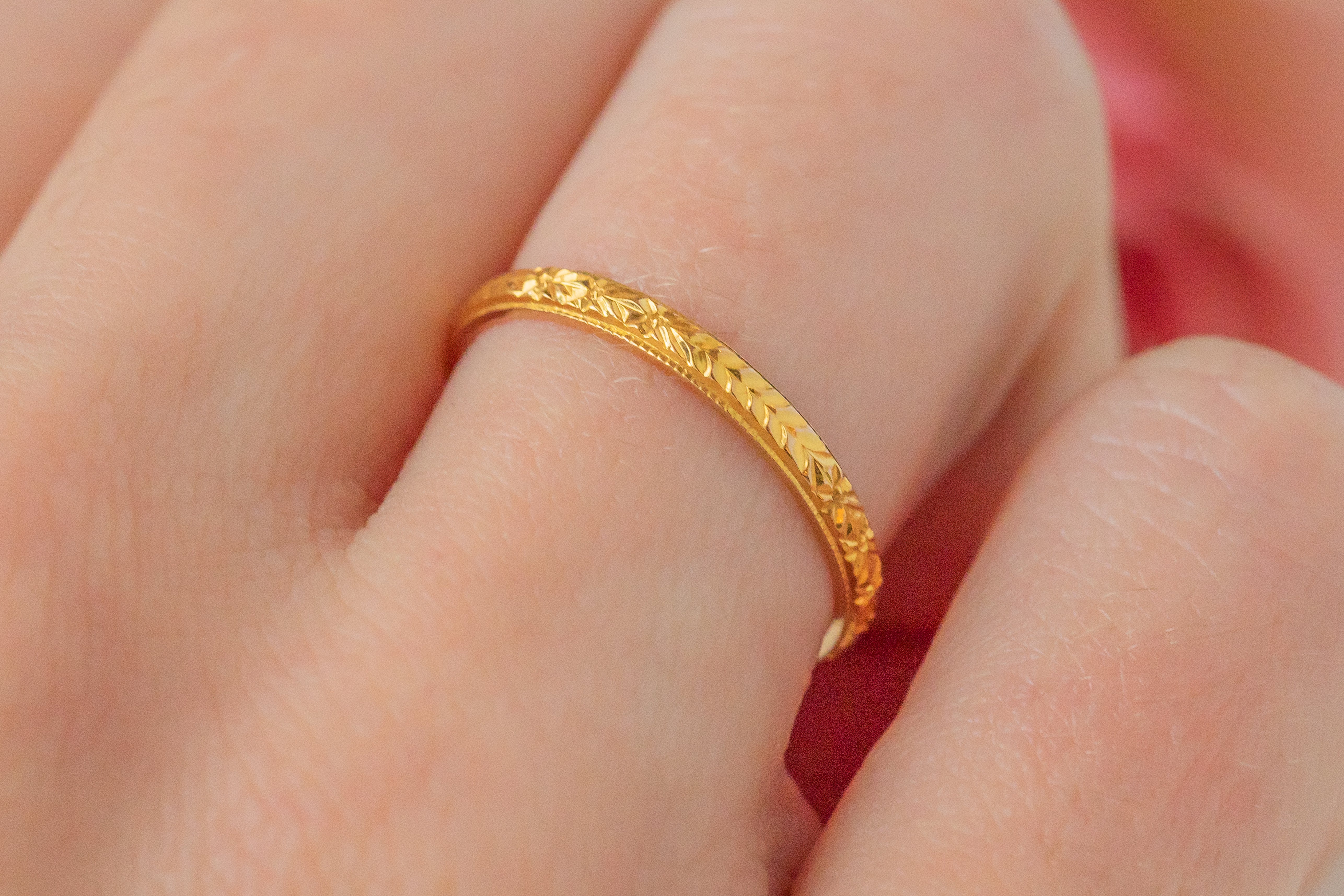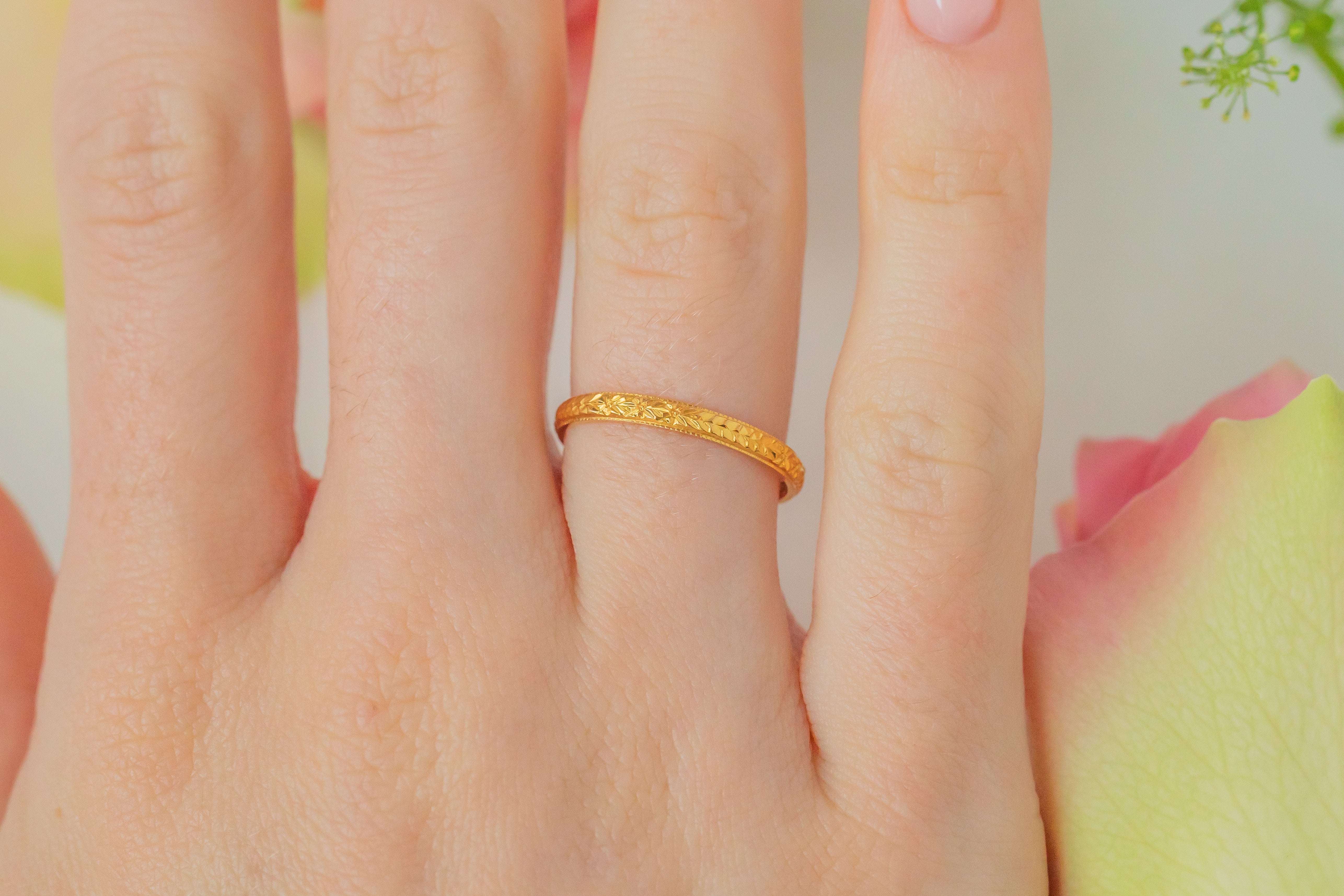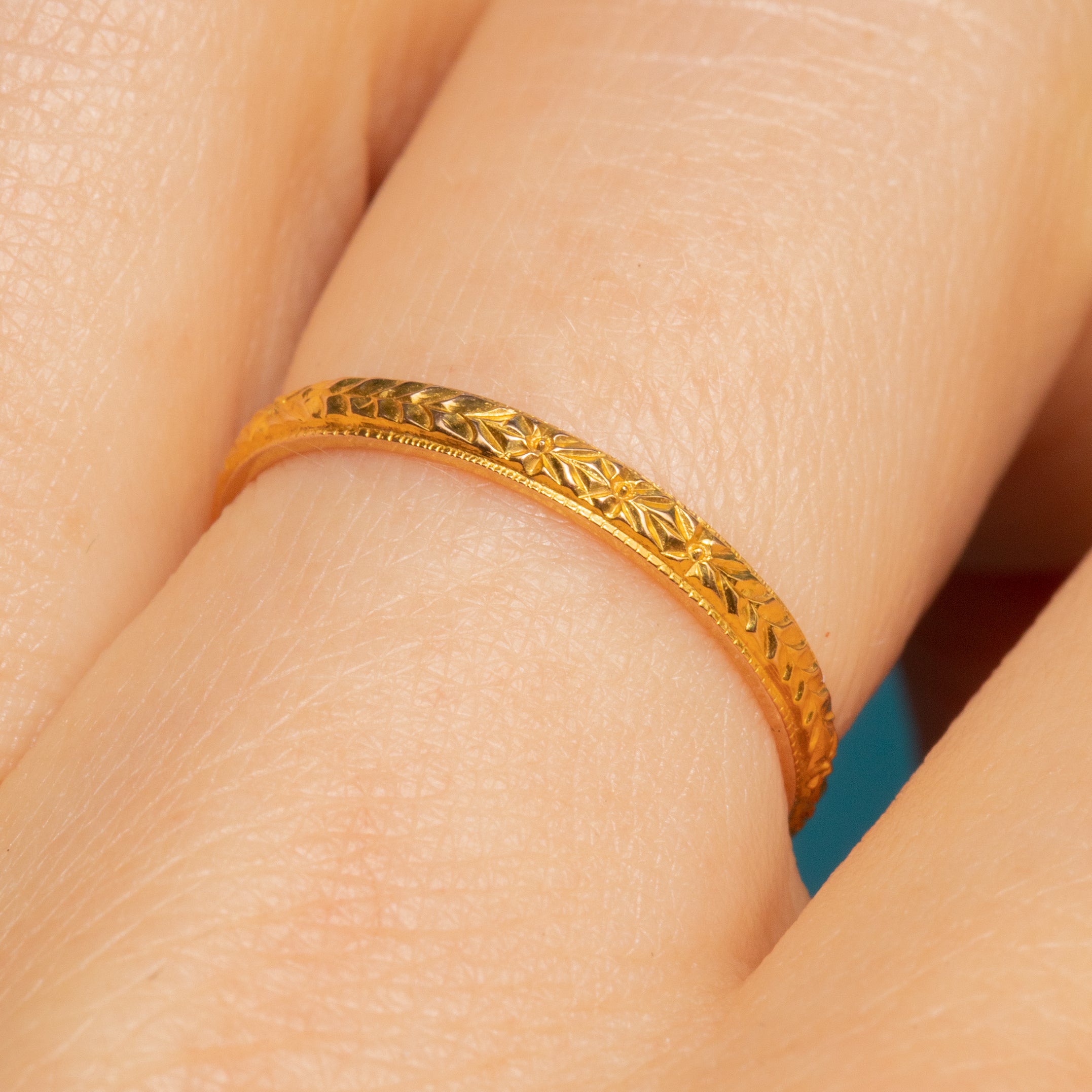 The orange blossom design has been repeatedly used throughout history on wedding bands as it's both visually beautiful and carries symbolic meaning as a representation of purity and new beginnings!