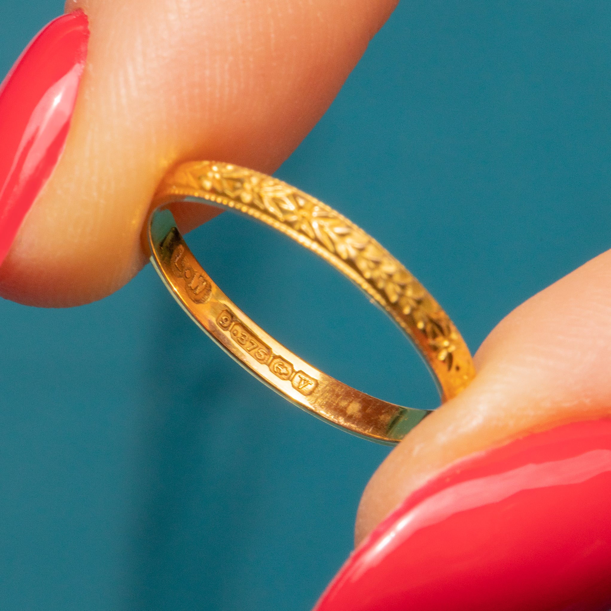 EXCELLENT. A gorgeous choice, this 9ct Gold engraved orange blossom wedding band is in excellent condition. The ring takes an antique form, but is fully hallmarked to the year 1945. This ring is beautifully detailed all over, making it a fab choice for your collection.
