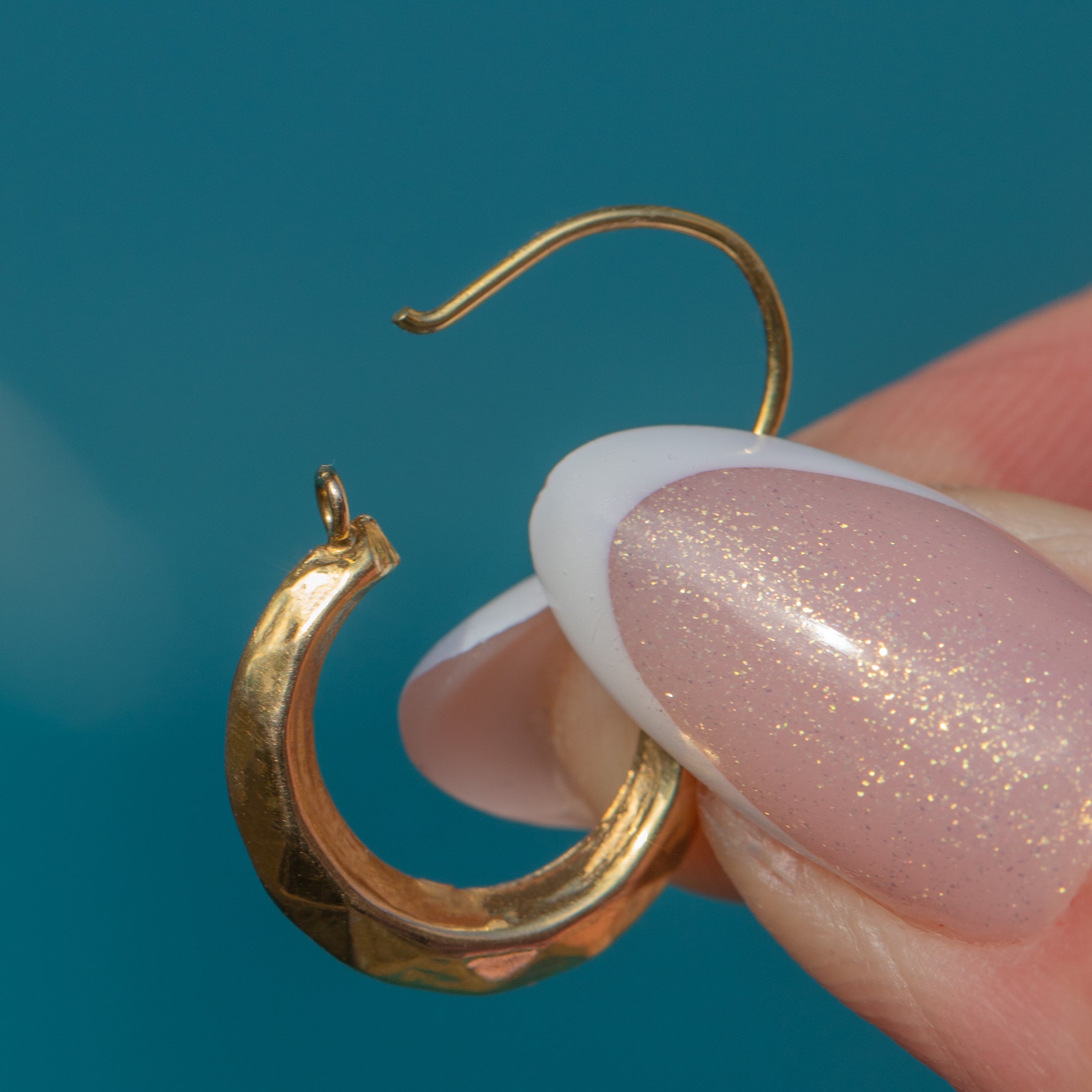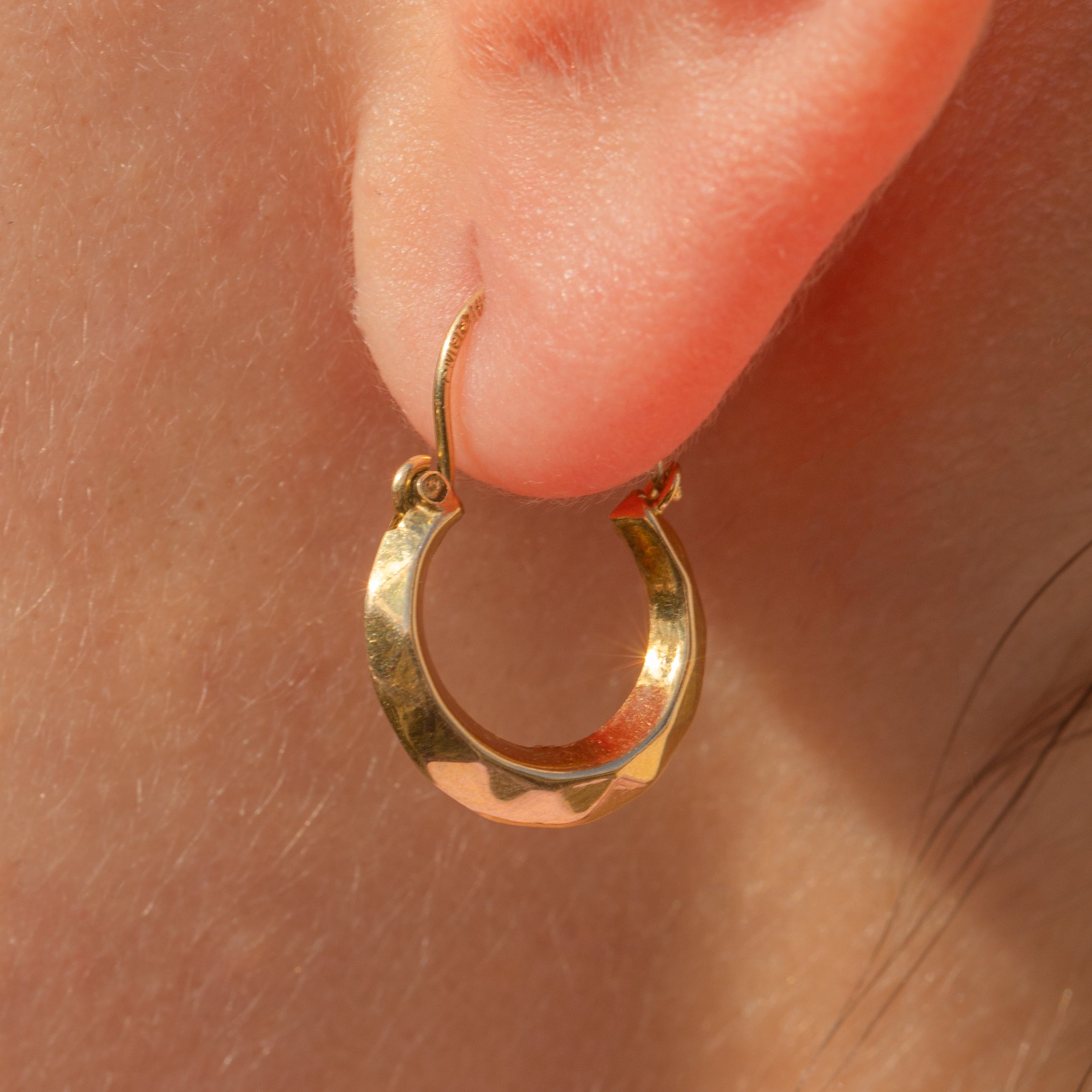 If you are looking for a pair of everyday earrings, these 9ct Gold faceted huggie hoop earrings would make a wonderful choice! Crafted from buttery yellow Gold, these vintage hoops have striking faceted forms that catch the light beautifully.