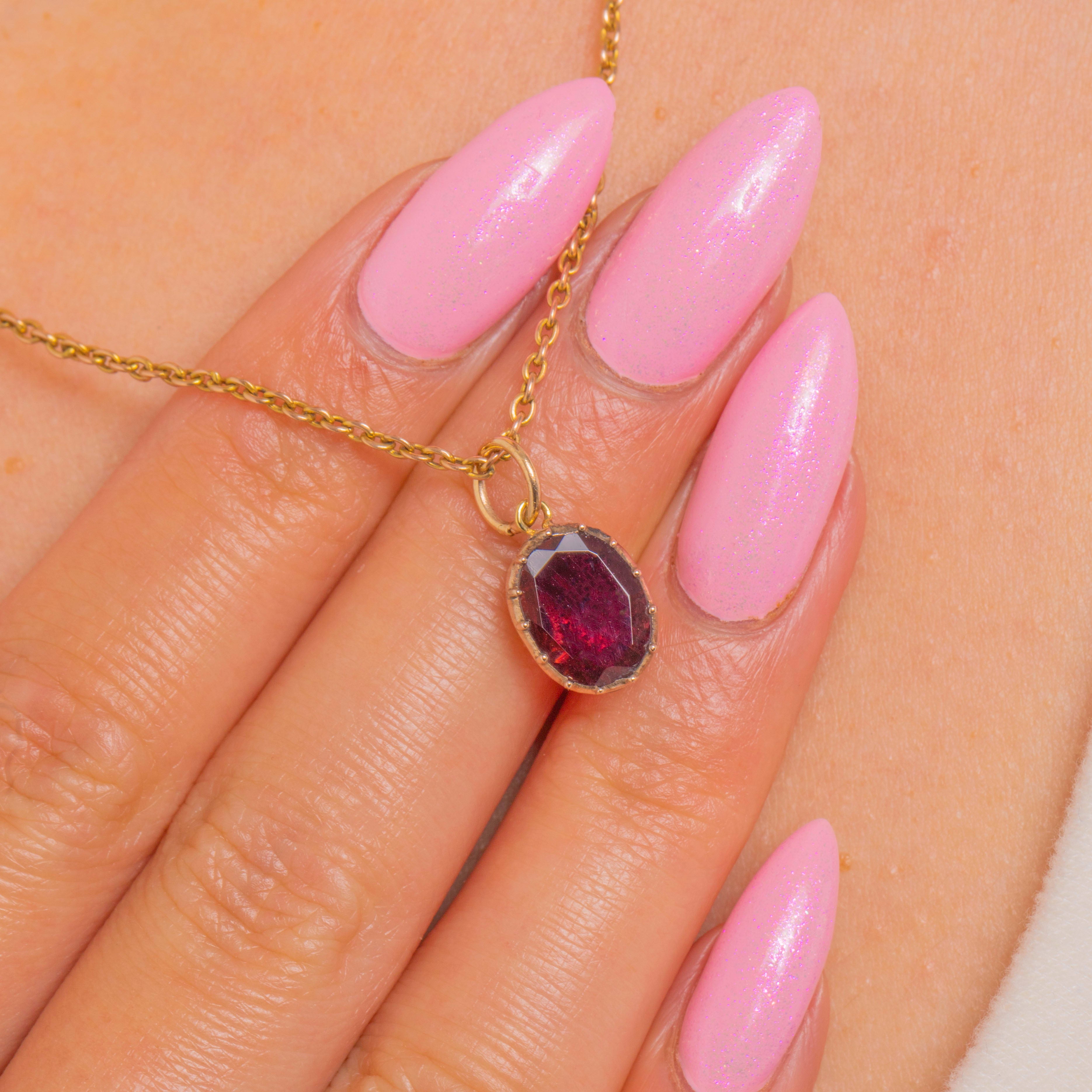 Glowing with a deep, wine-red hue, this Georgian foiled flat-cut Garnet charm is a petite beauty in warm 9ct Gold. The oval Garnet sits in a closed-back collet, lending a softly antique silhouette and a delicious richness of colour.