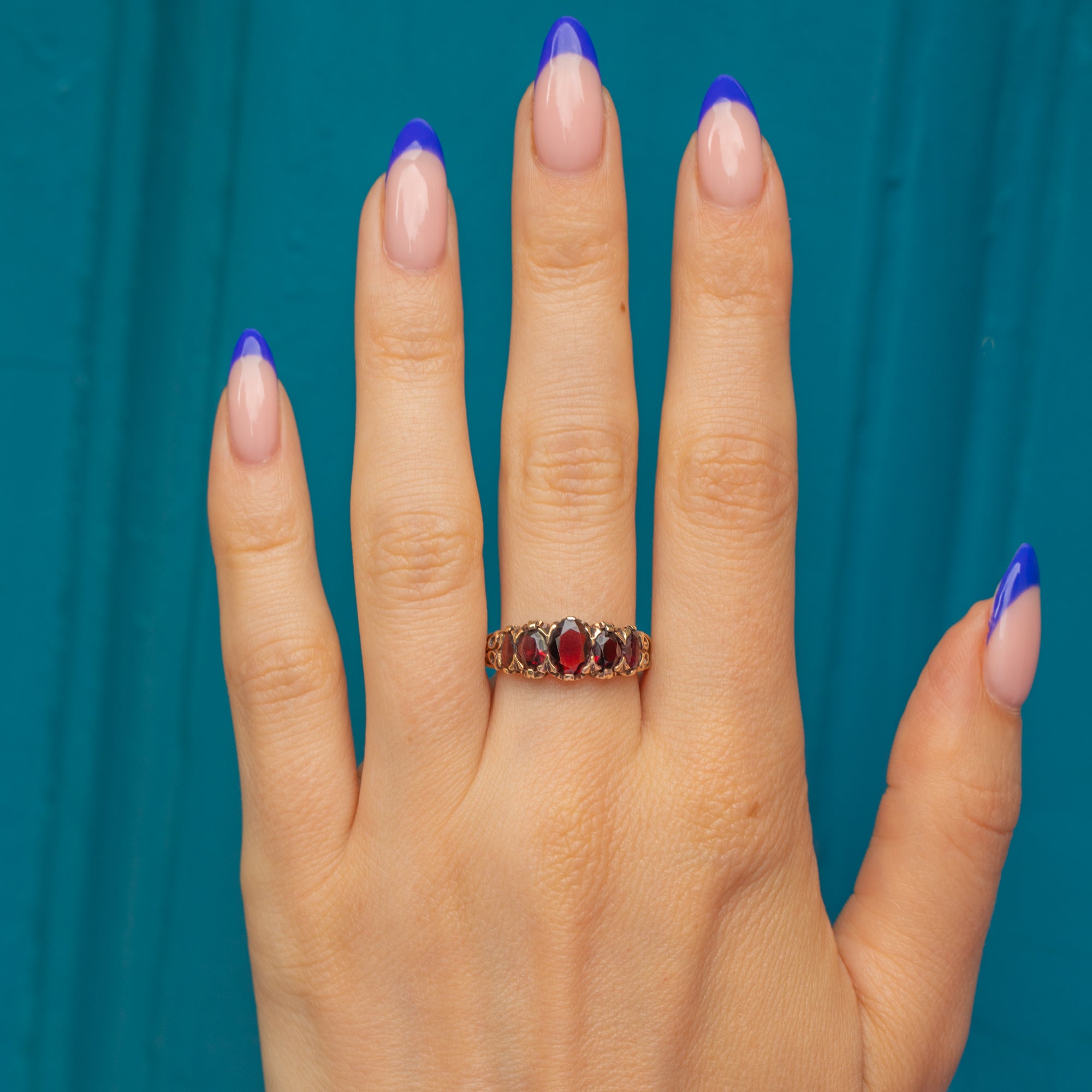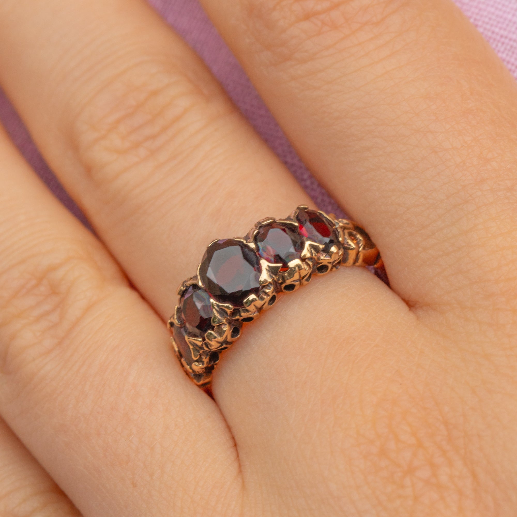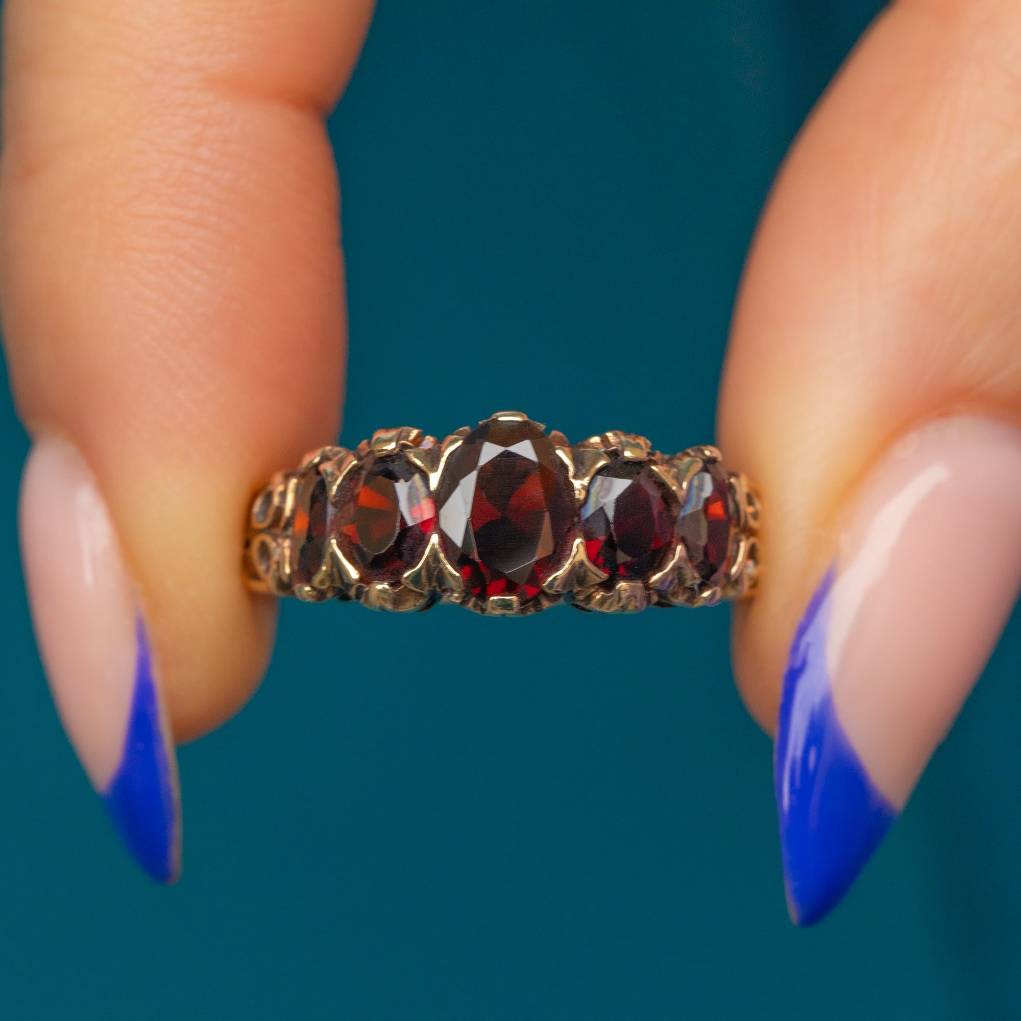 We love this 9ct Gold Garnet five stone ring! The Garnet gems boast a beautiful deep red with hints of sepia, and come encased in 9ct Gold with whimsical ornate detailing bordering their settings.