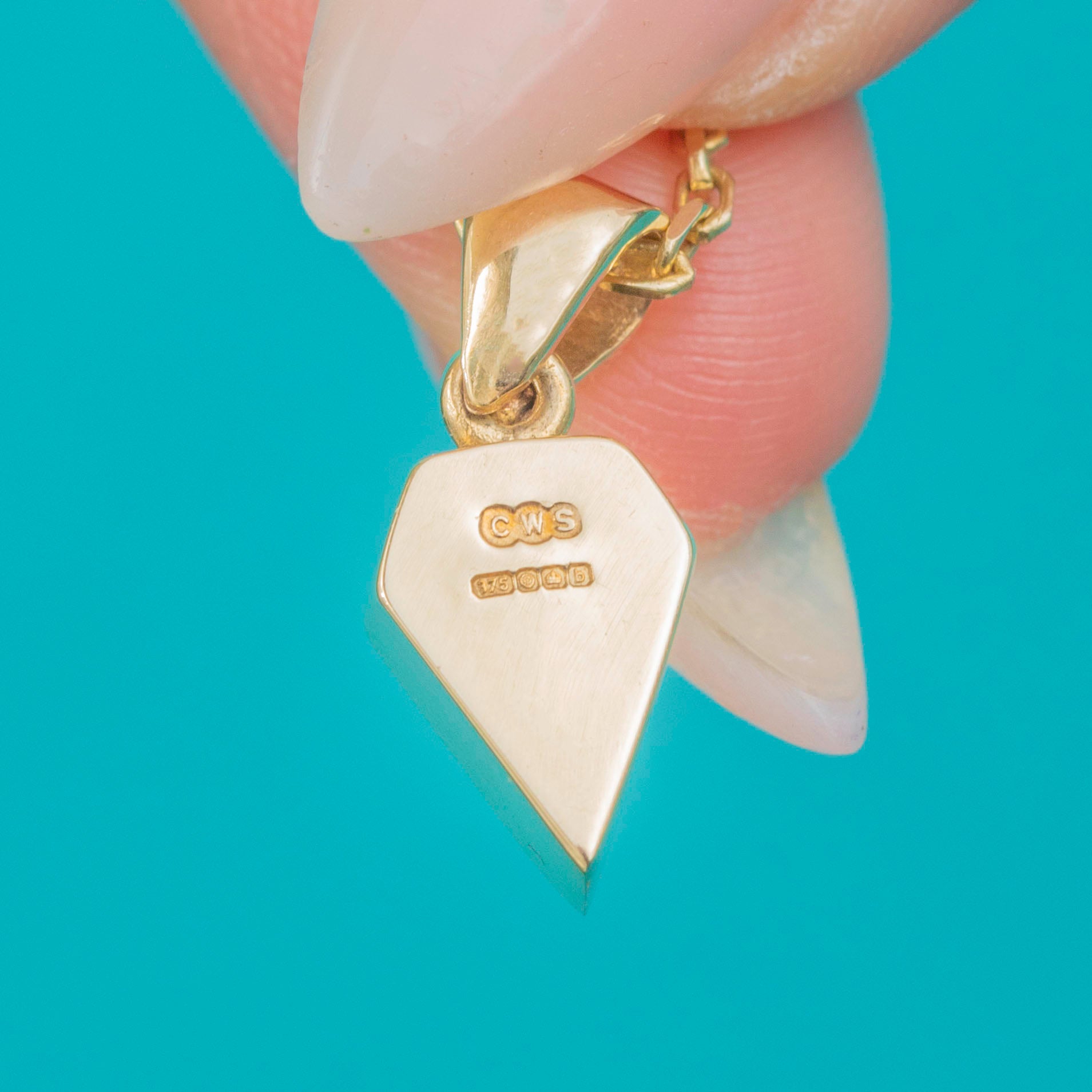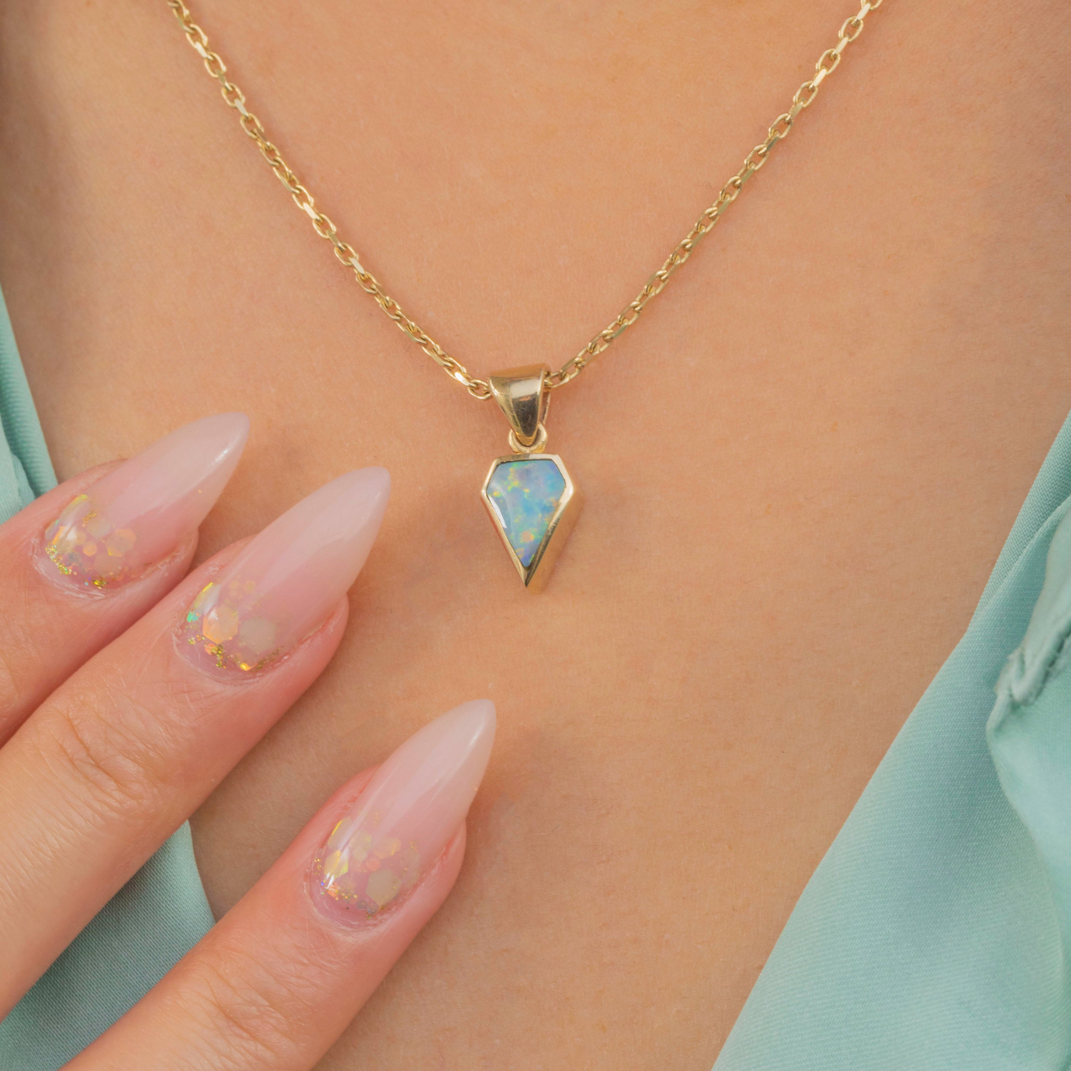 This eye-catching geometric Opal pendant showcases a mesmerising natural, solid Opal with a striking triangular shape! And a chunky bezel of solid 9ct Gold. The pendant is accompanied by an 18" Gold chain, making it ready to wear straight away.