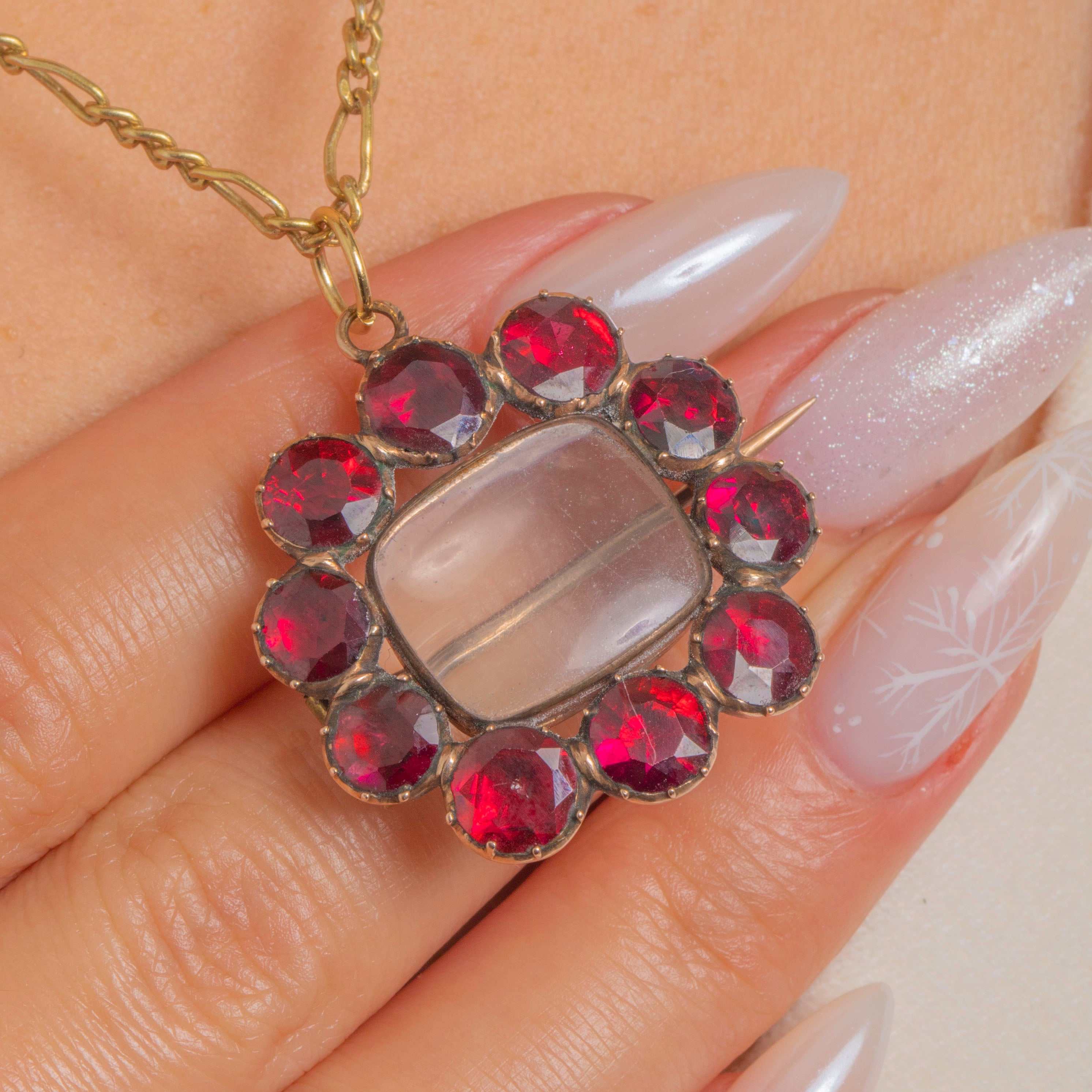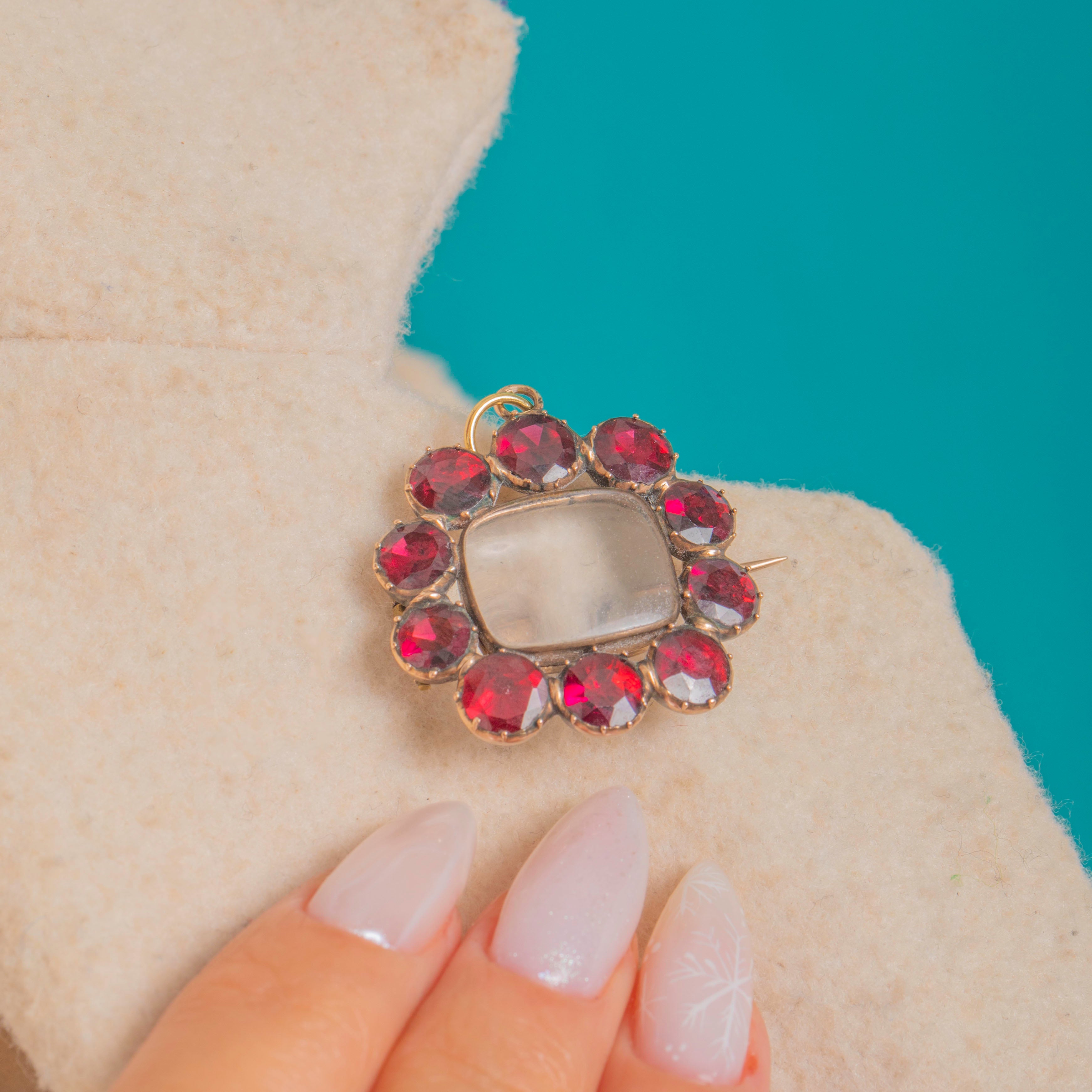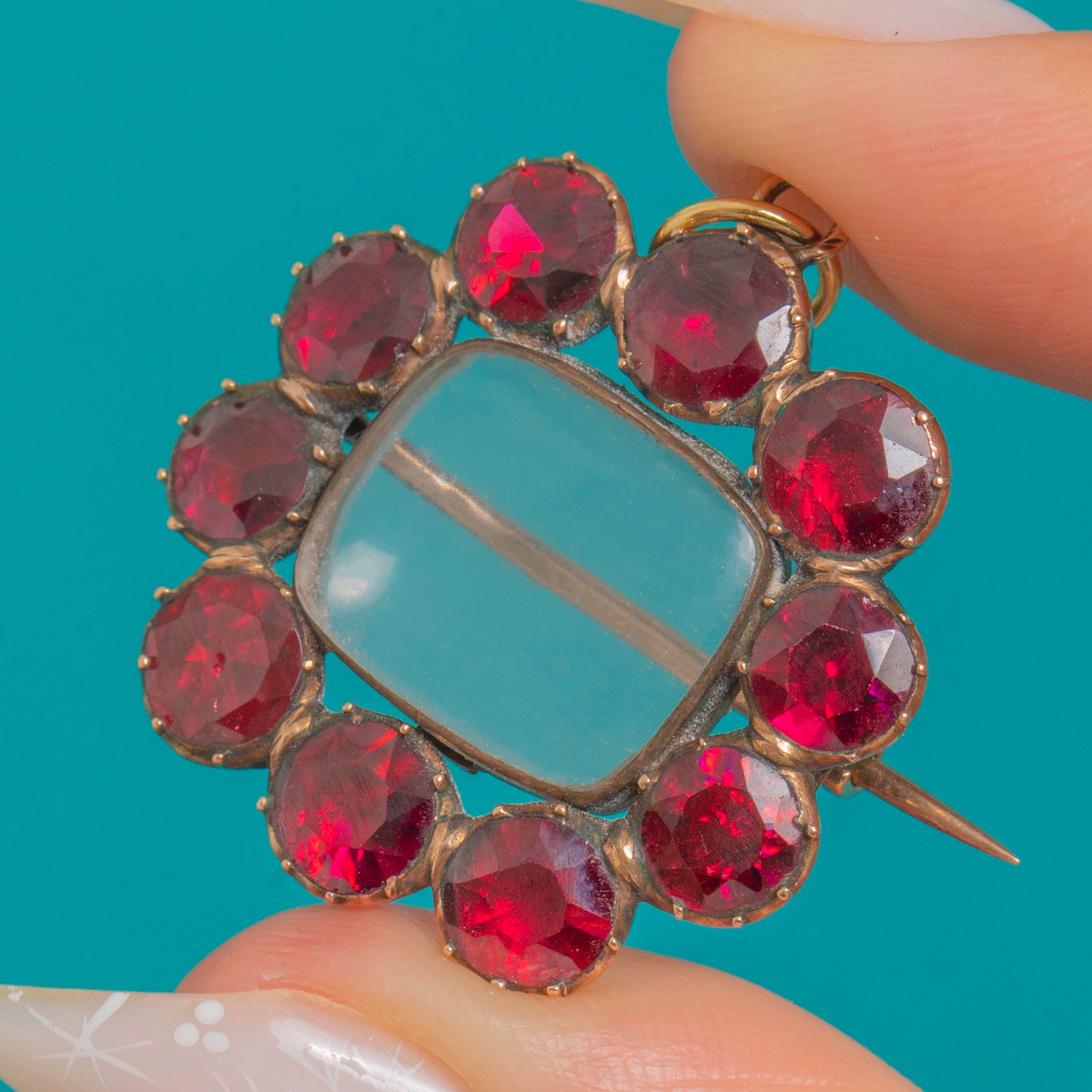 A classically romantic 9ct Gold Georgian Garnet locket pendant with brooch fittings. A halo of glittering, foiled Garnets encircles the central glass locket, which remains fully functional.