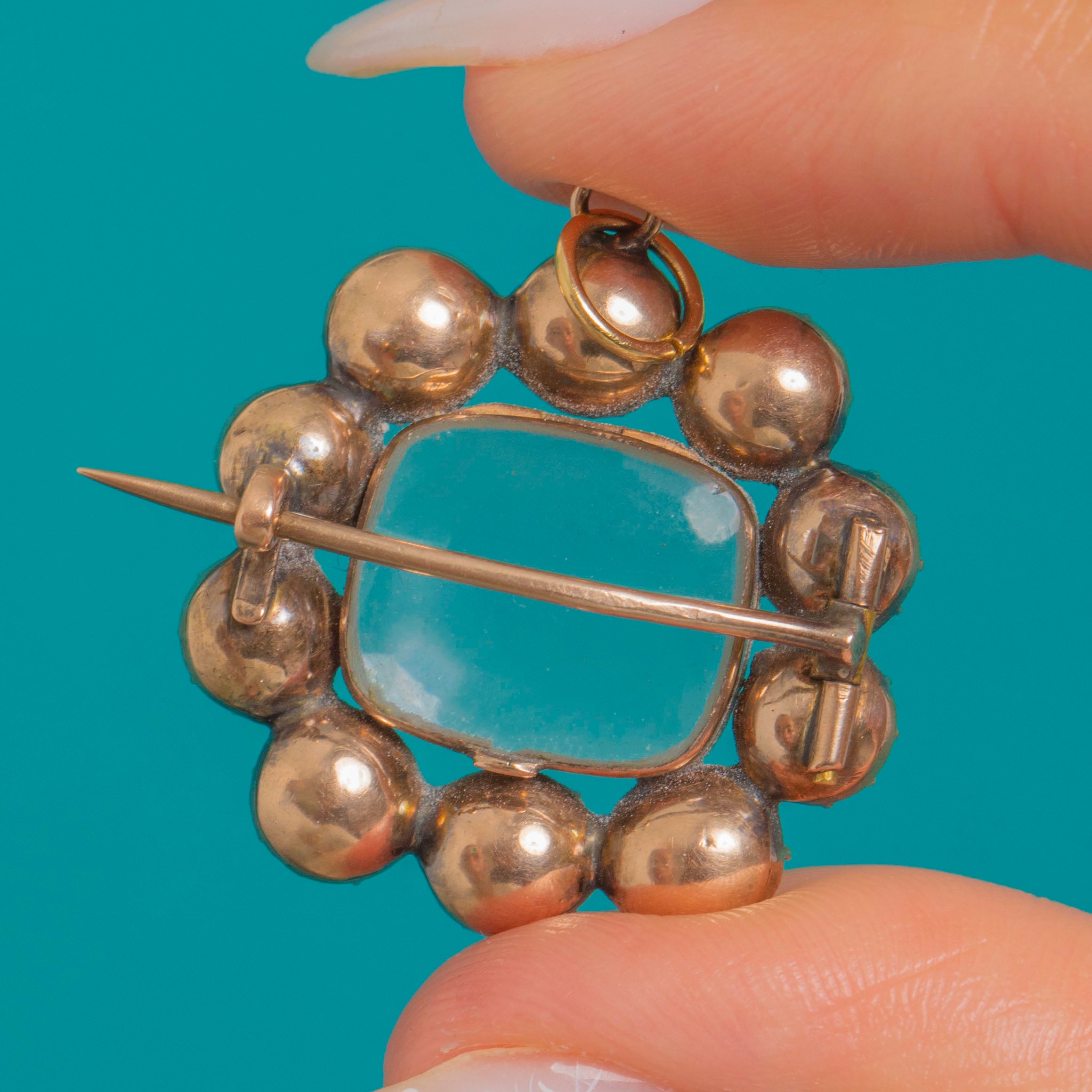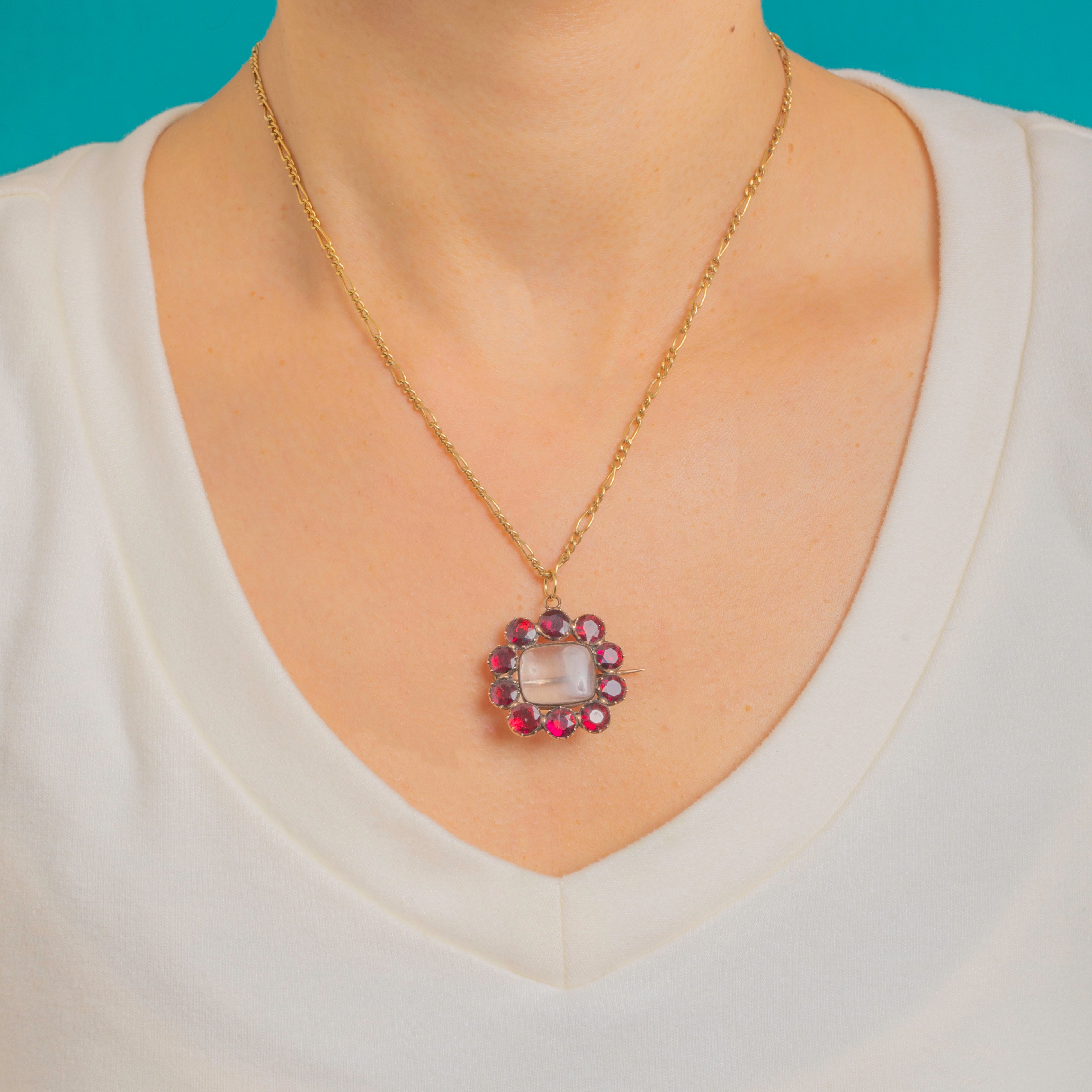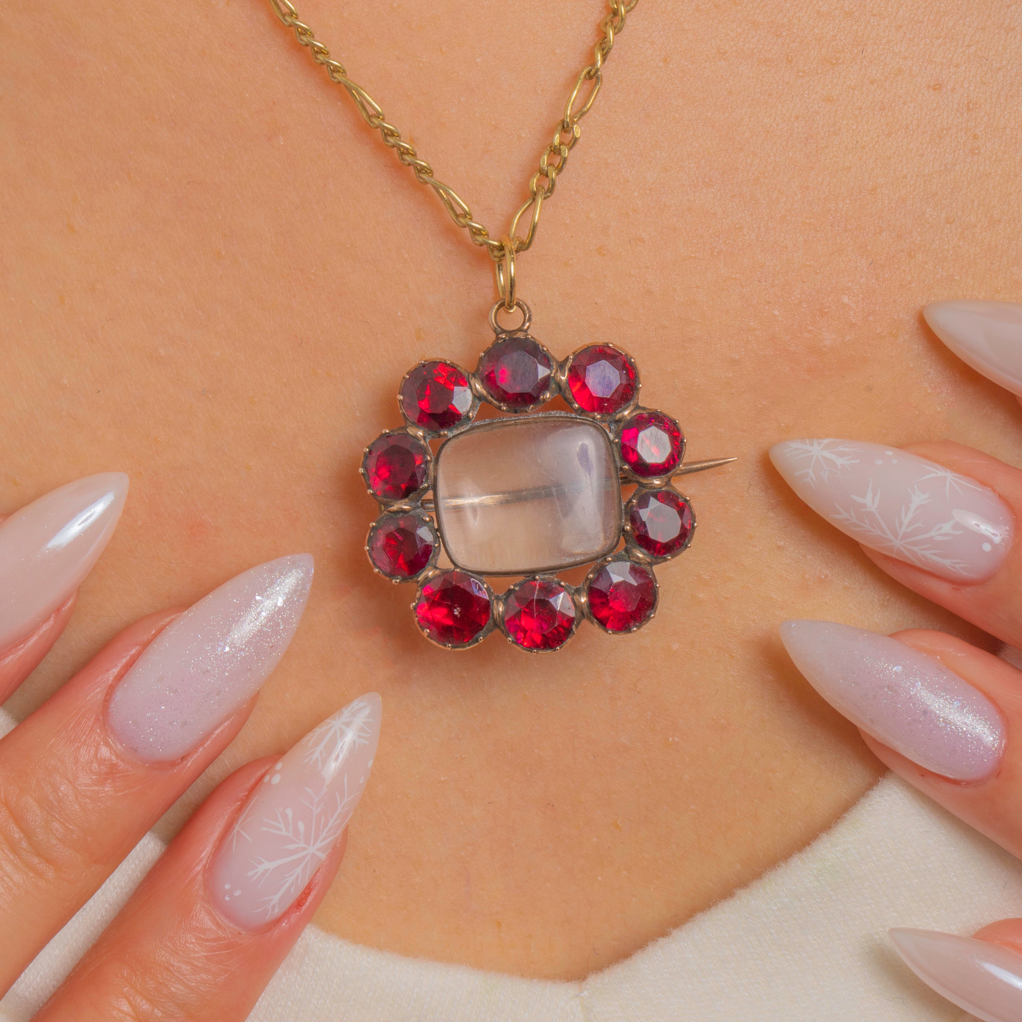 A classically romantic 9ct Gold Georgian Garnet locket pendant with brooch fittings. A halo of glittering, foiled Garnets encircles the central glass locket, which remains fully functional.
