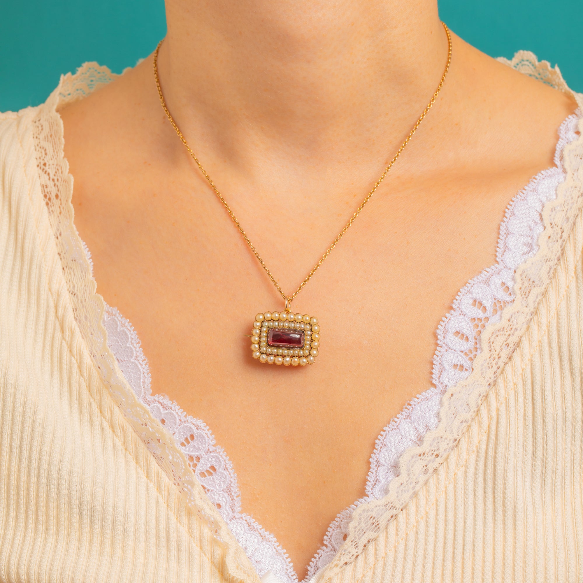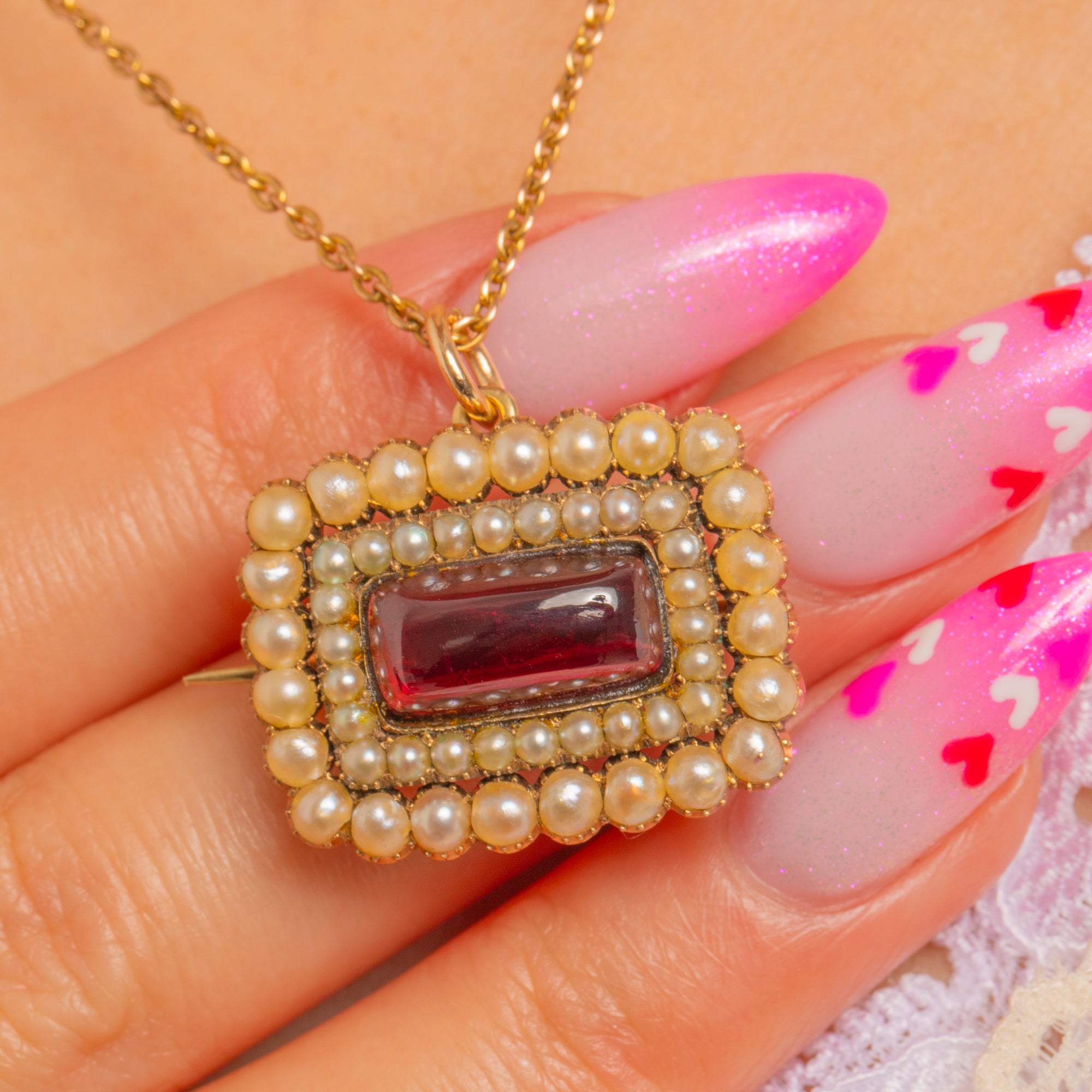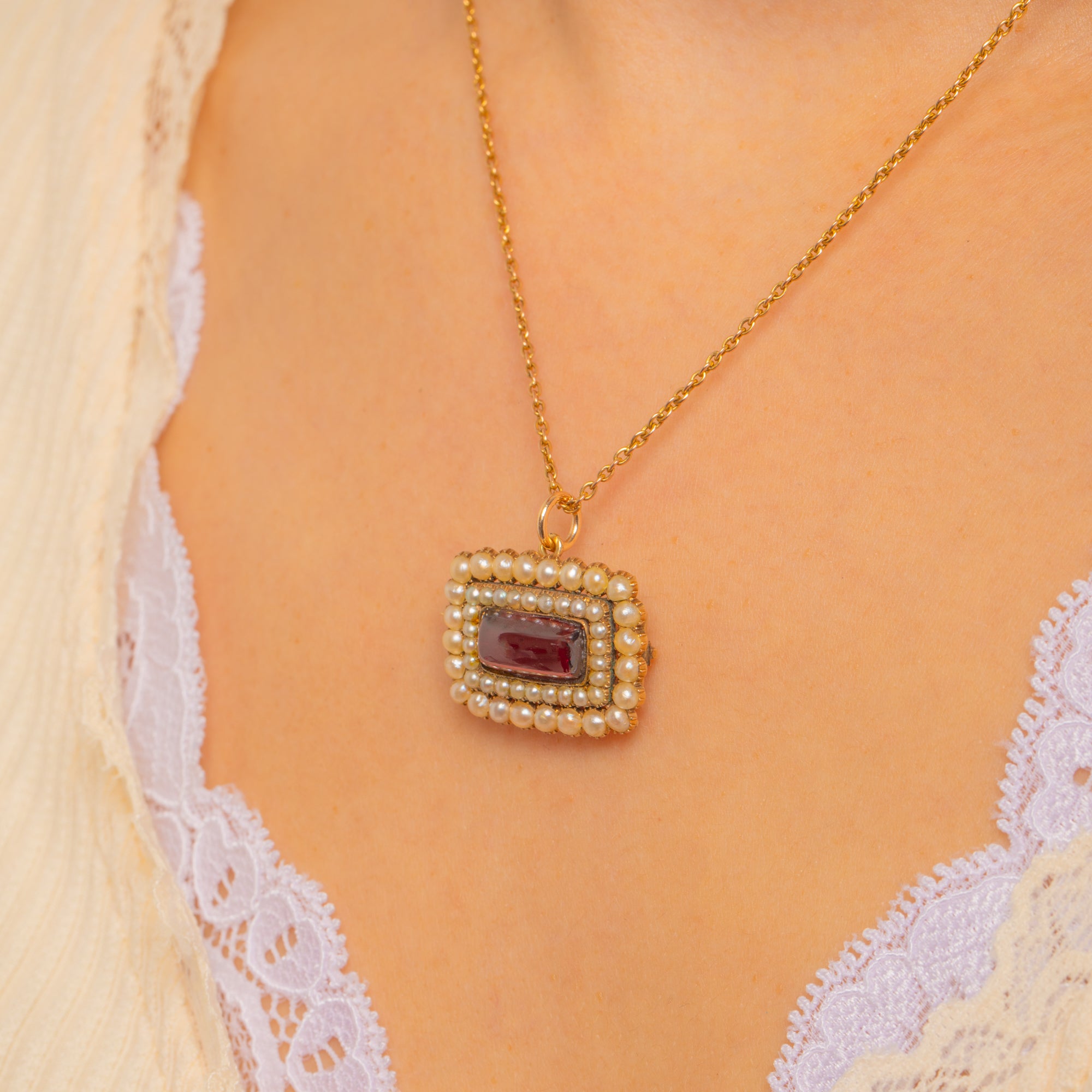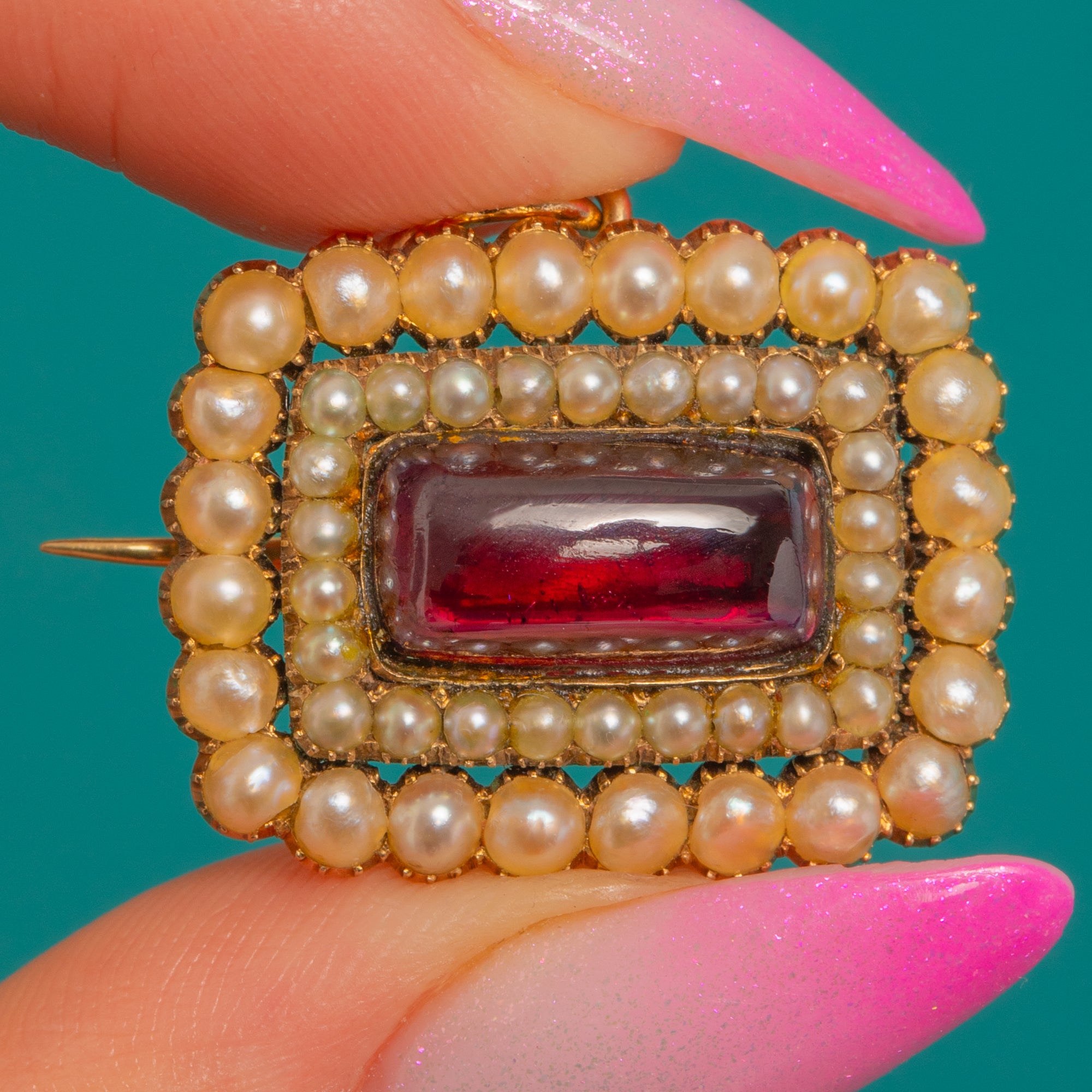 A jewel of Georgian romance, this locket-back pendant centres a richly saturated Sugarloaf Garnet, its high dome glowing against a halo of creamy Natural Pearls. Hand-crafted in warm 9ct Gold, the rectangular silhouette and closely set Pearls create a beautiful play of light and texture, epitomising the refined elegance of early 19th-century design.