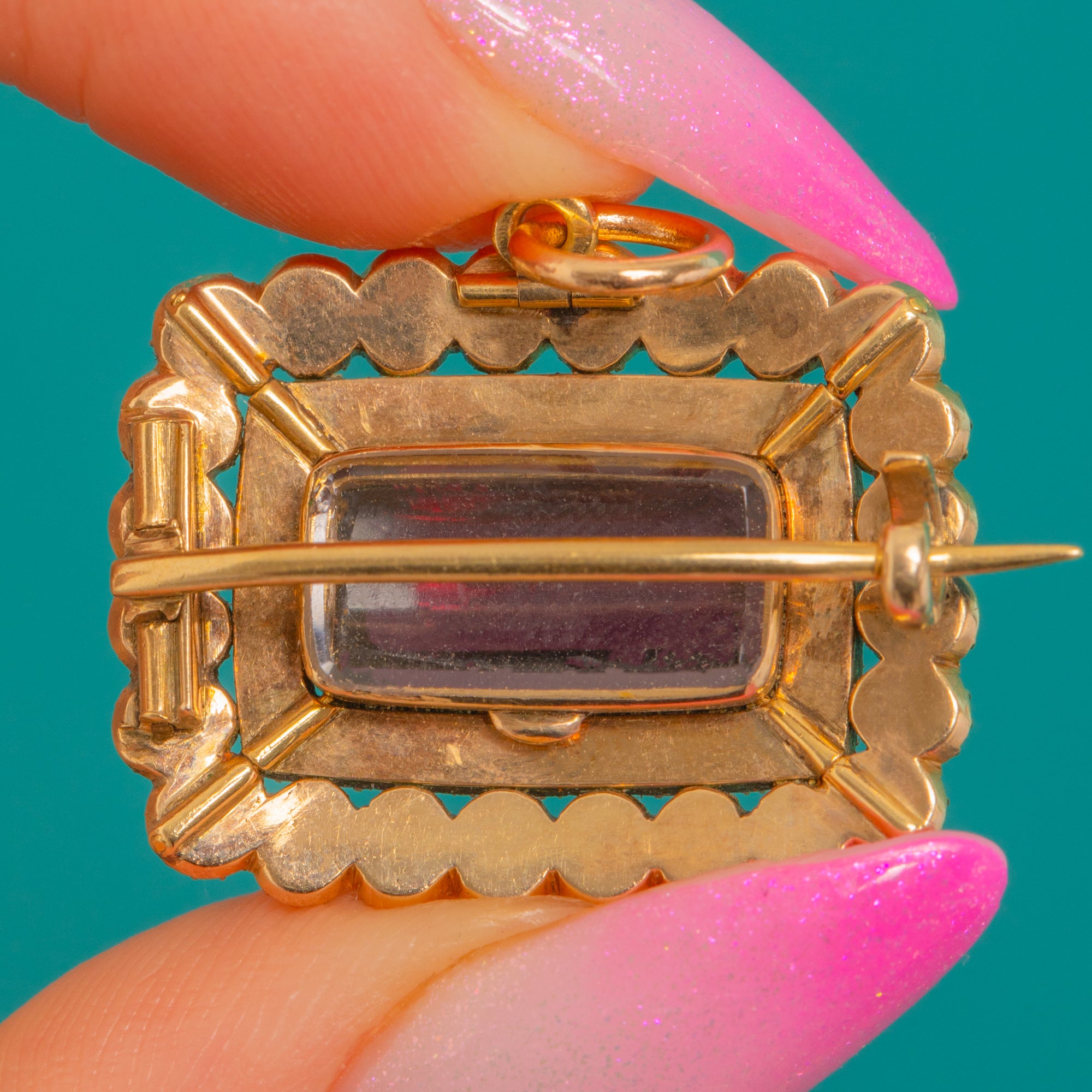 Turn it over to reveal the crisp locket back—perfect for a tiny keepsake—while the front’s gemmy Garnet and lustrous Pearls offer timeless allure. Petite yet striking, it’s a wonderfully wearable piece, offering both a jump ring and brooch pin for versatility.