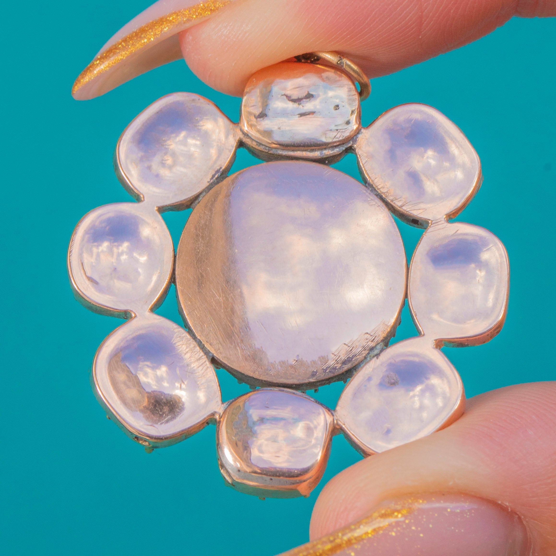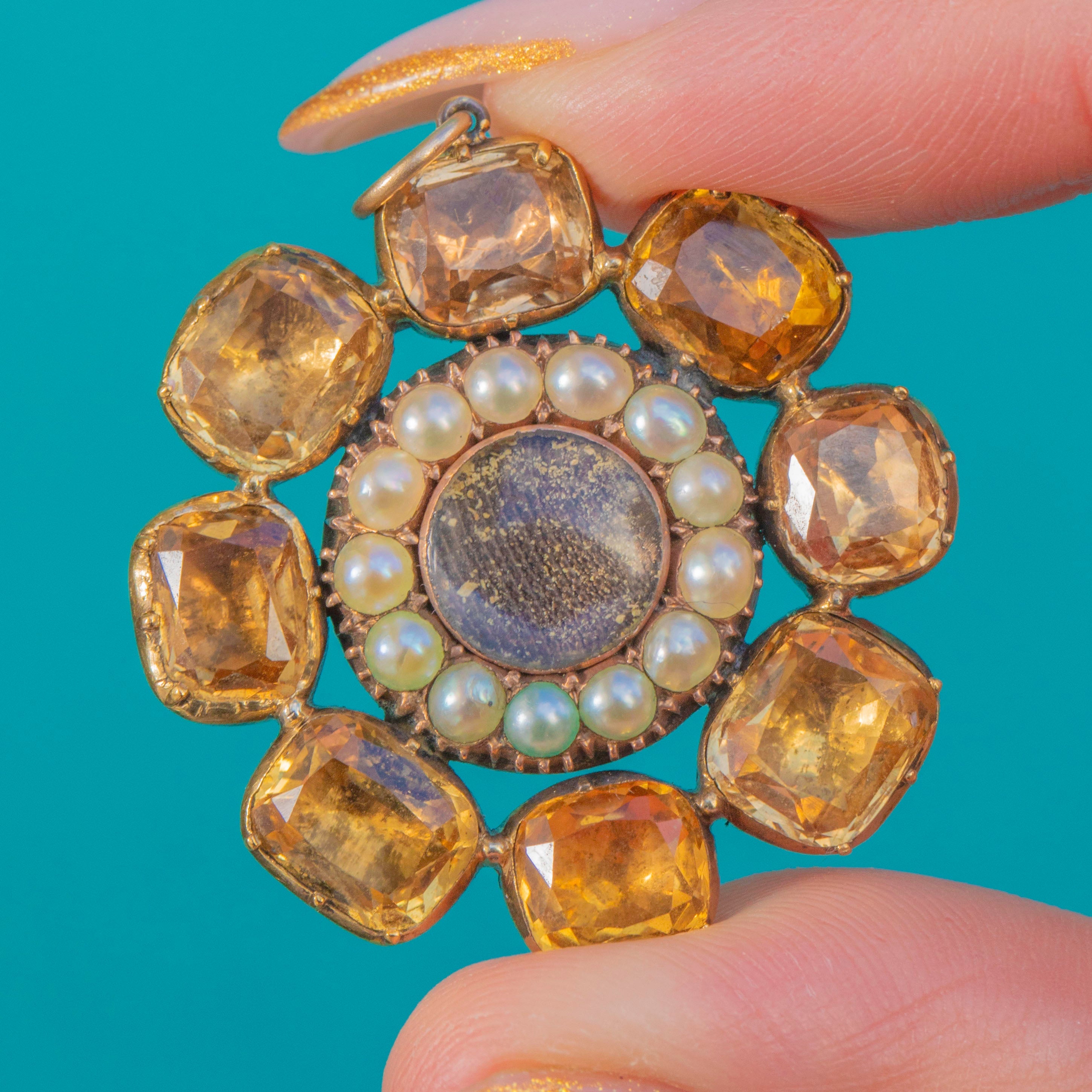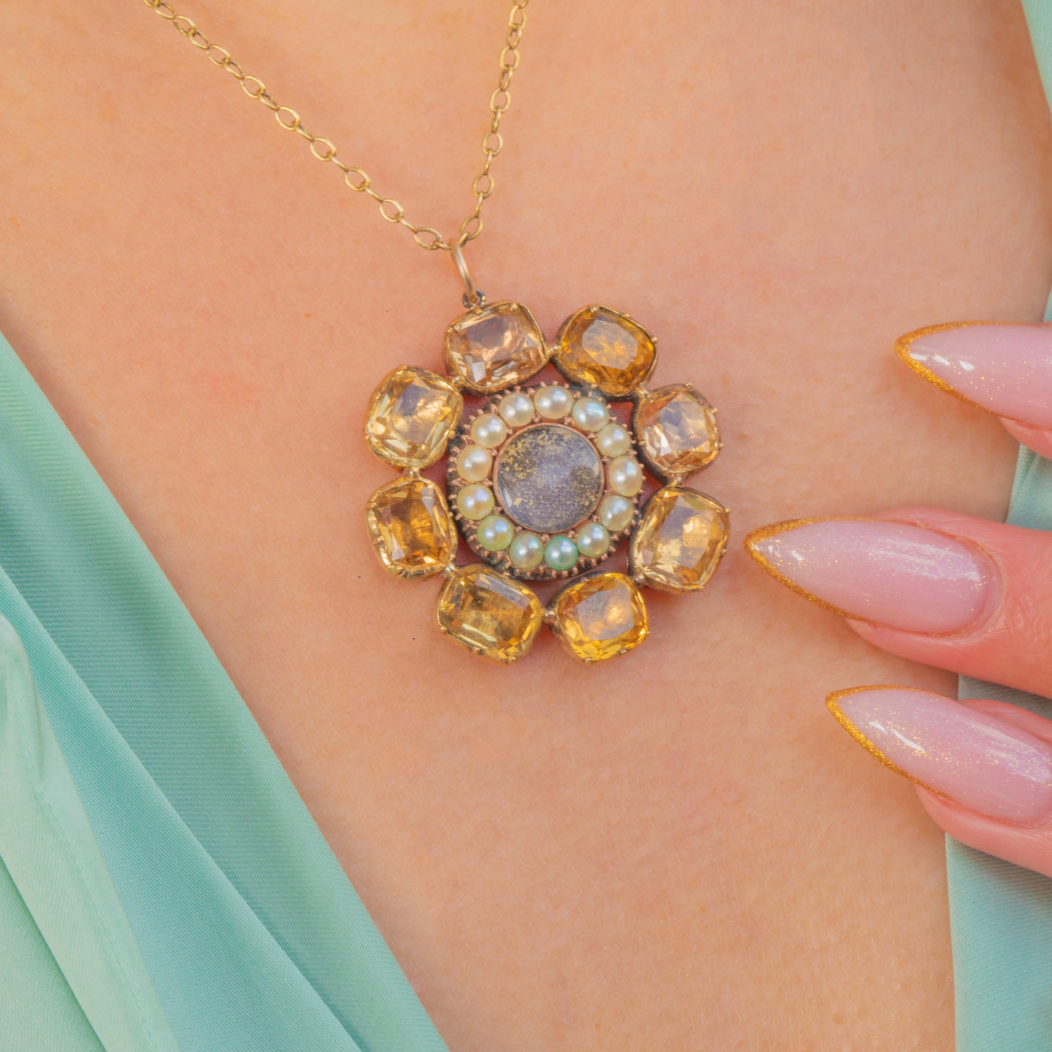 A magnificent late Georgian cluster pendant set with richly coloured foiled Imperial Topaz and luminous Natural Pearls. The honeyed glow of the foiled Topaz paired with the soft lustre of the Pearls creates that quintessential early 19th-century romance, opulent, feminine, and utterly breathtaking on the neckline.