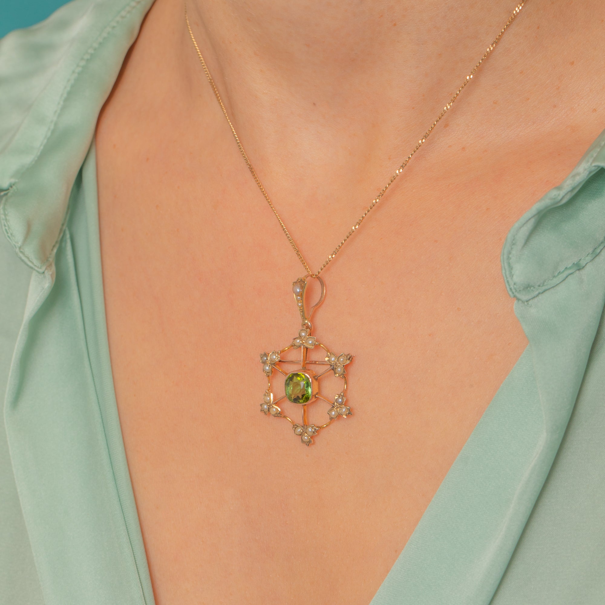 This exquisite piece of Edwardian jewellery showcases a rich green Tourmaline framed by natural Pearls, creating a piece full of luminous contrast and early 20th-century elegance.