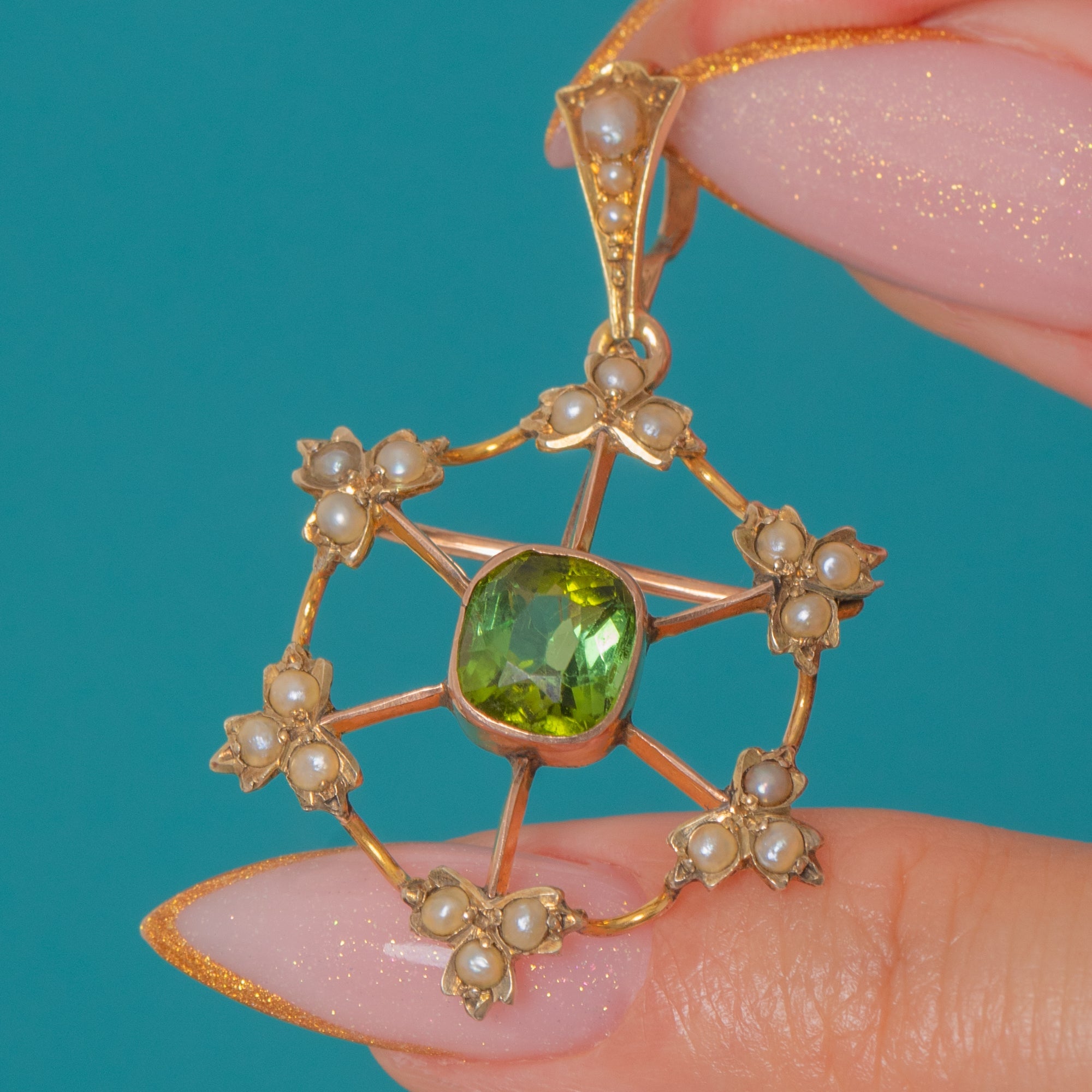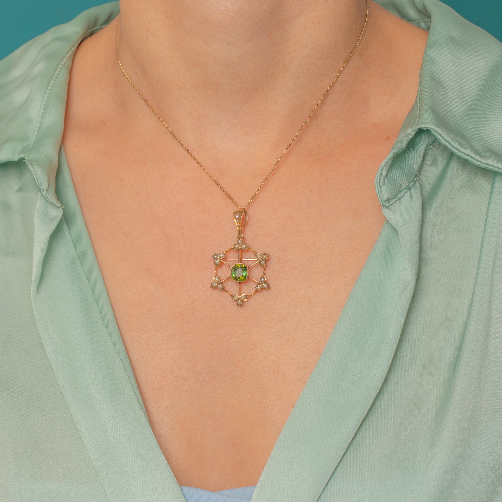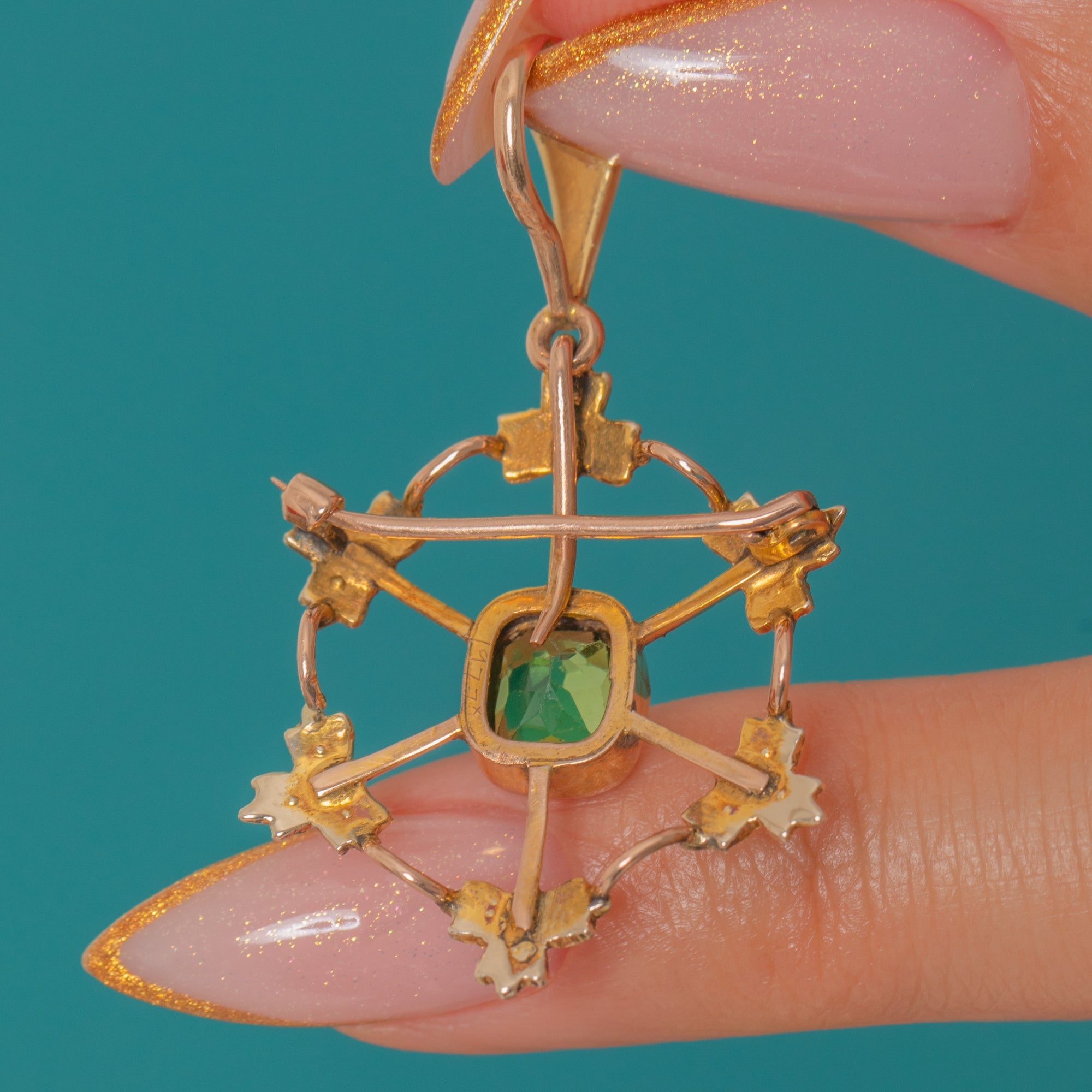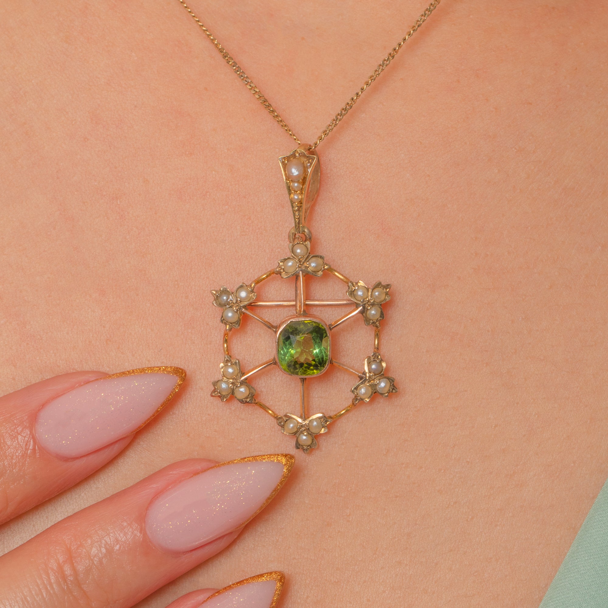 The Tourmaline’s deep verdant hue is beautifully complemented by the creamy glow of the Pearls, all set in warm 9ct Gold. Designed to be worn either as a pendant or a brooch, it’s a versatile jewel with timeless charm and a romantic antique feel.