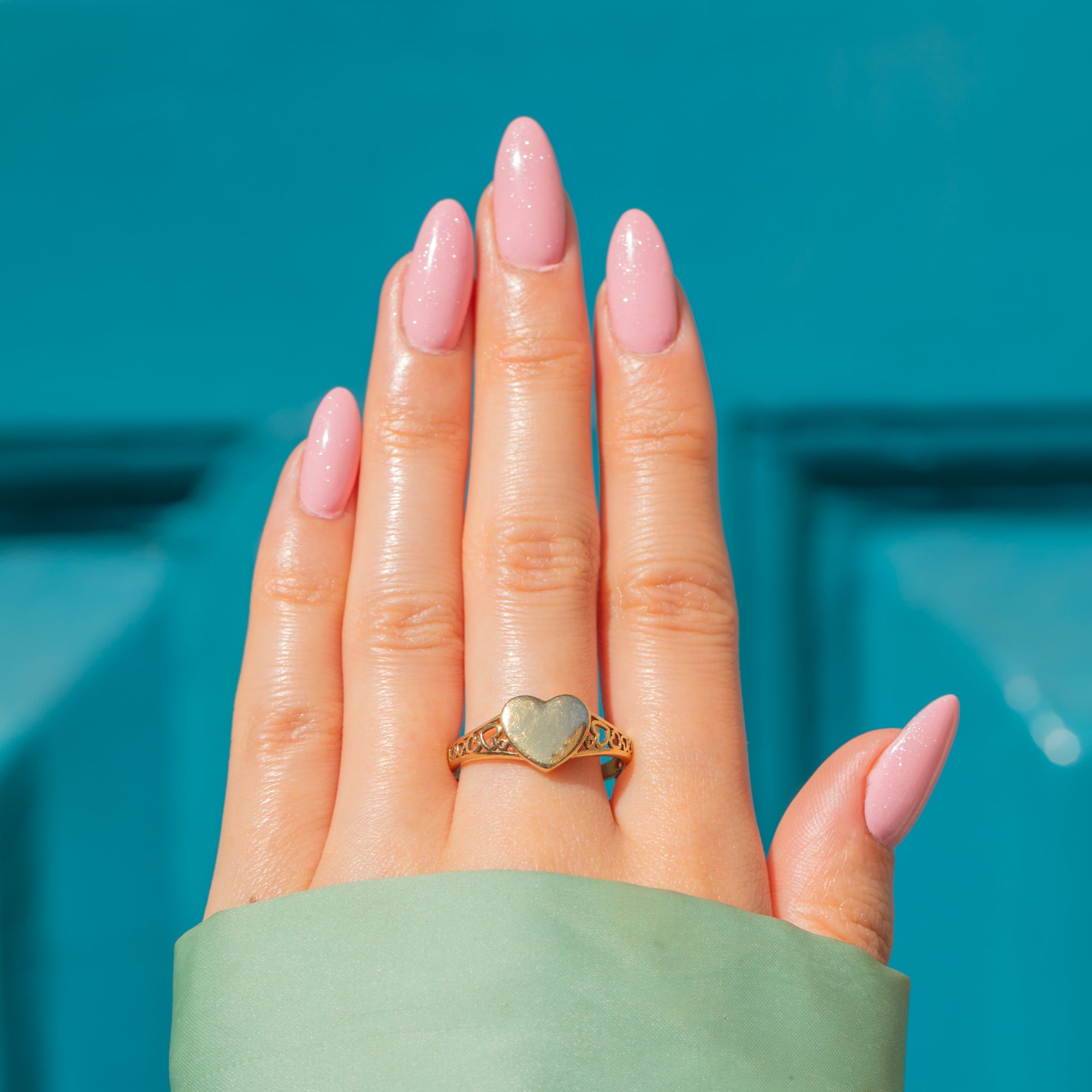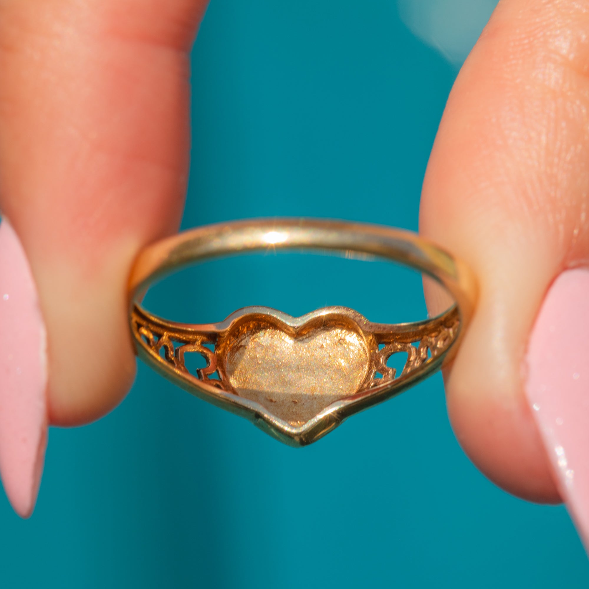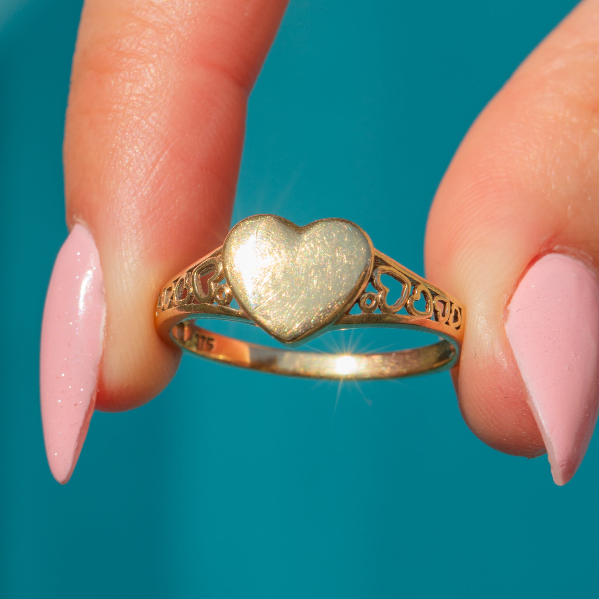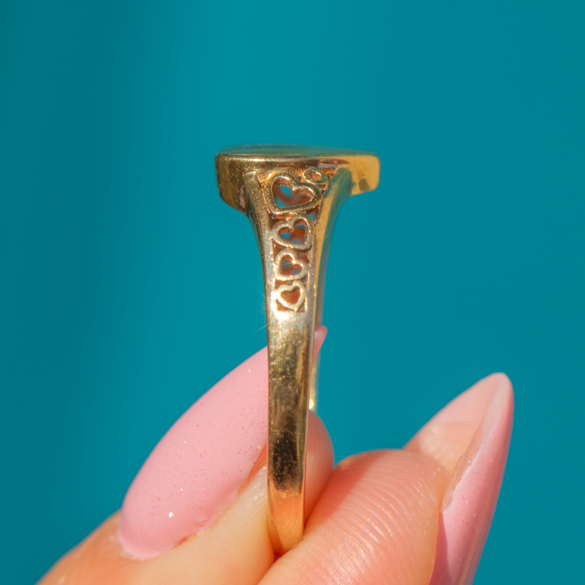 This 9ct Gold heart signet ring will make a sweet addition to your collection! Crafted from buttery 9ct Gold, this mid-century vintage ring displays a distinct heart-shaped signet face flanked by dainty heart cut-outs decorating the shoulders.