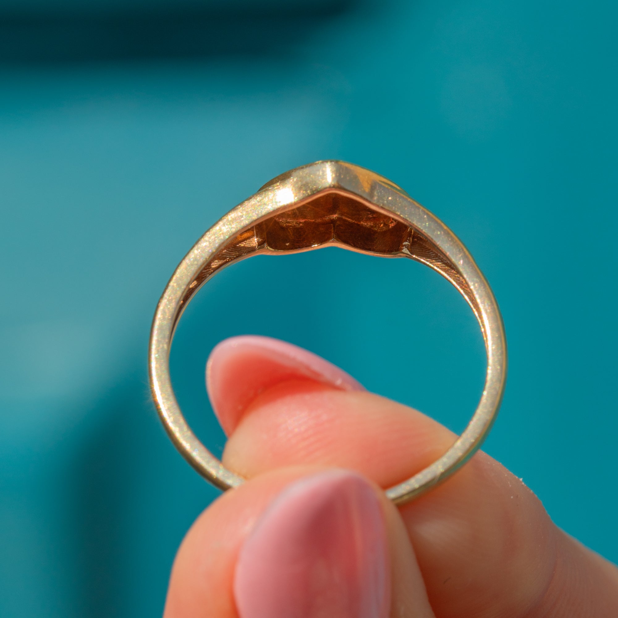 VERY GOOD-EXCELLENT: This 9ct Gold heart signet ring is in wonderful condition. The Gold is buttery with a high-shine polish and only mild surface wear, expected with age. The band has held its form well, with no dings or dents, and is smooth and comfortable to wear!