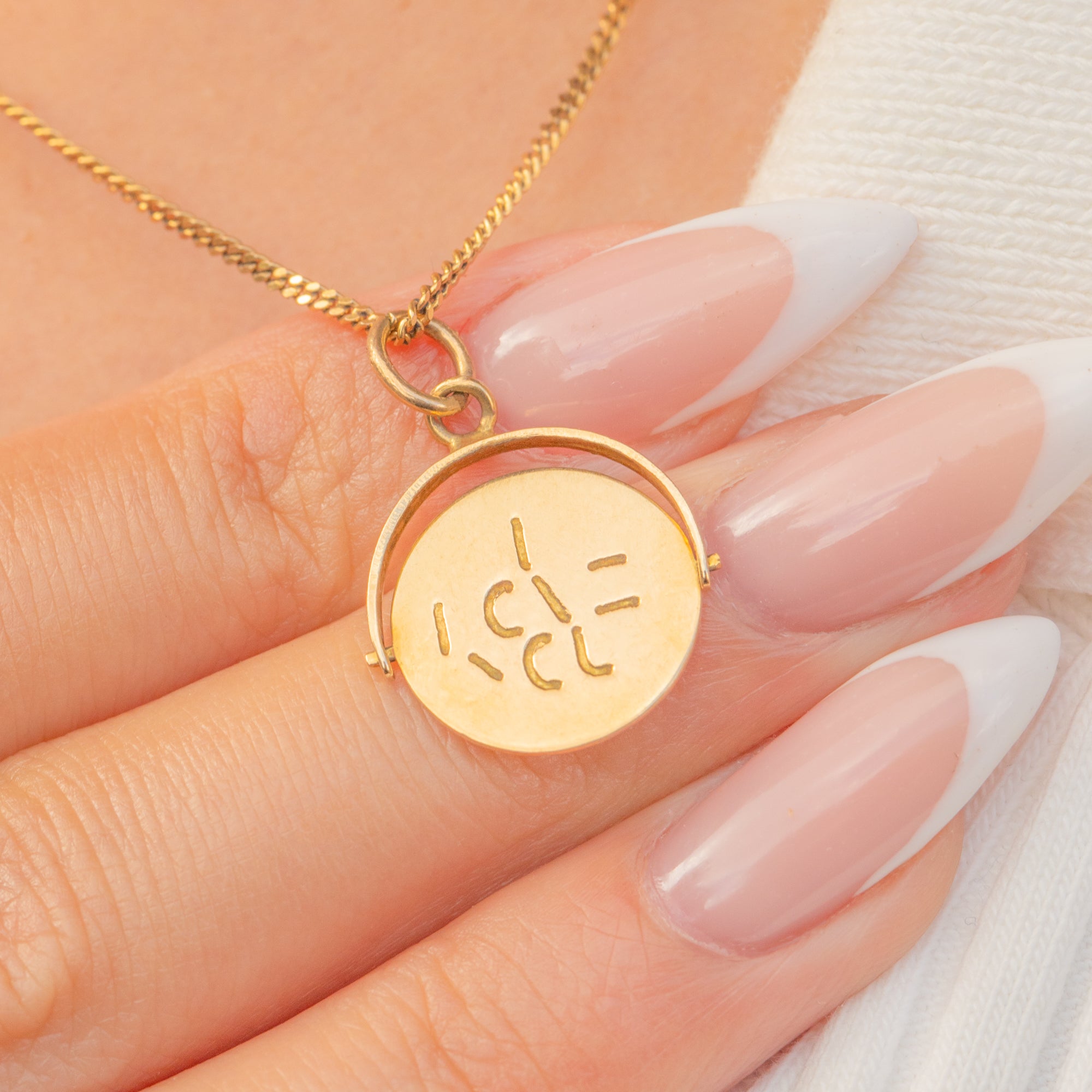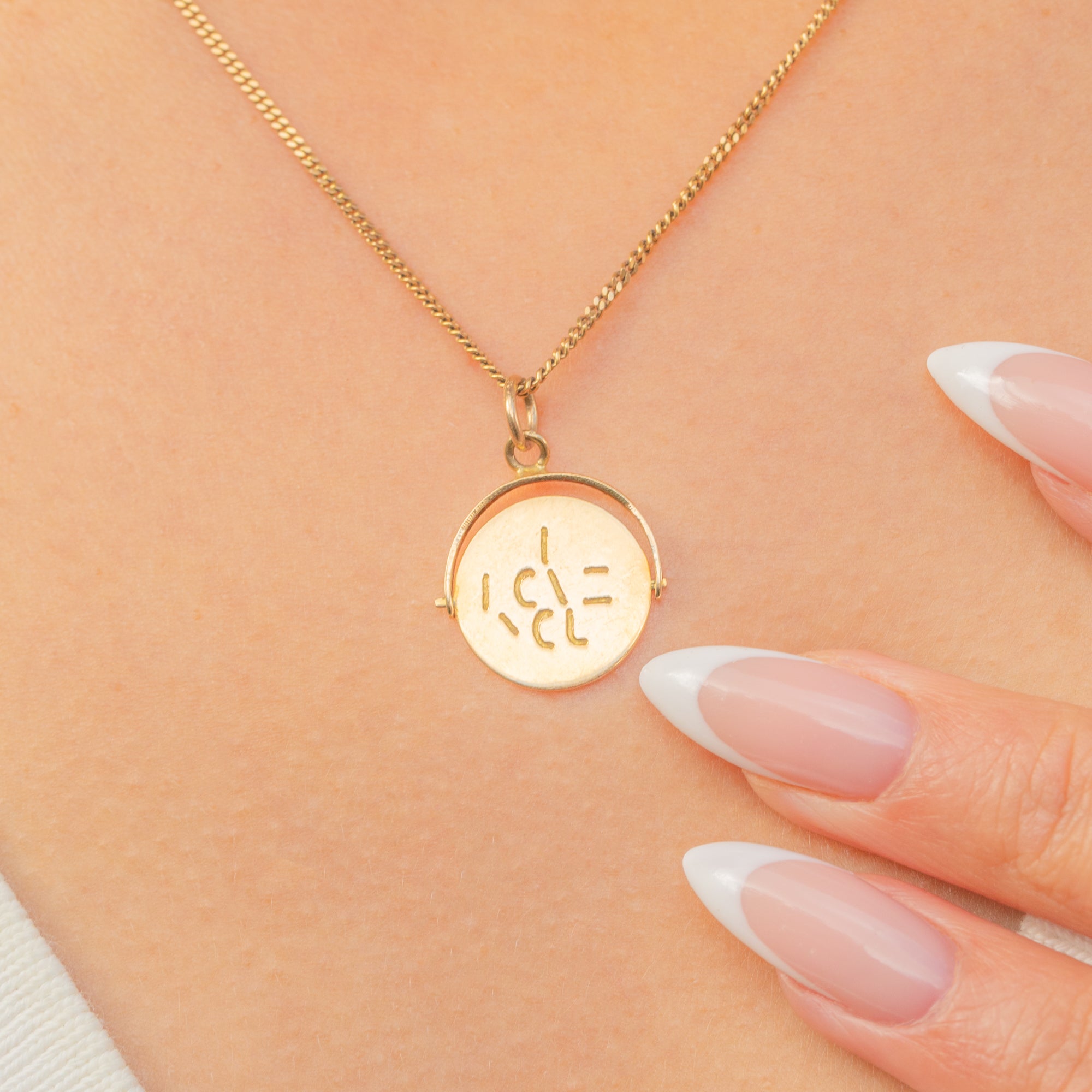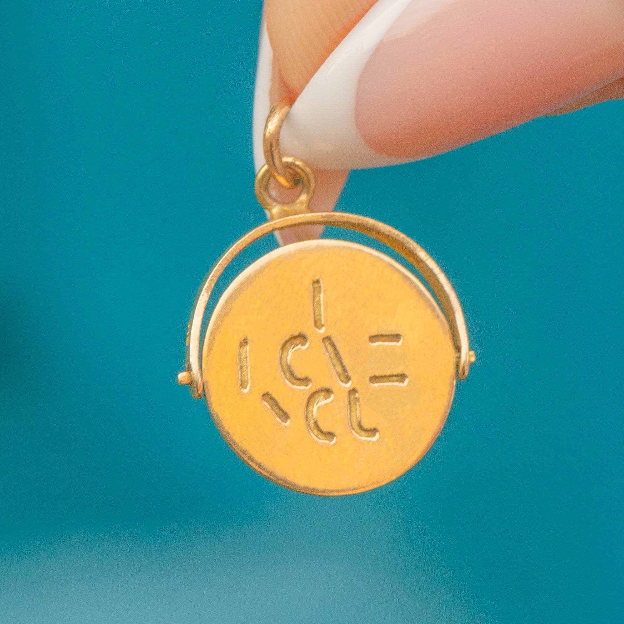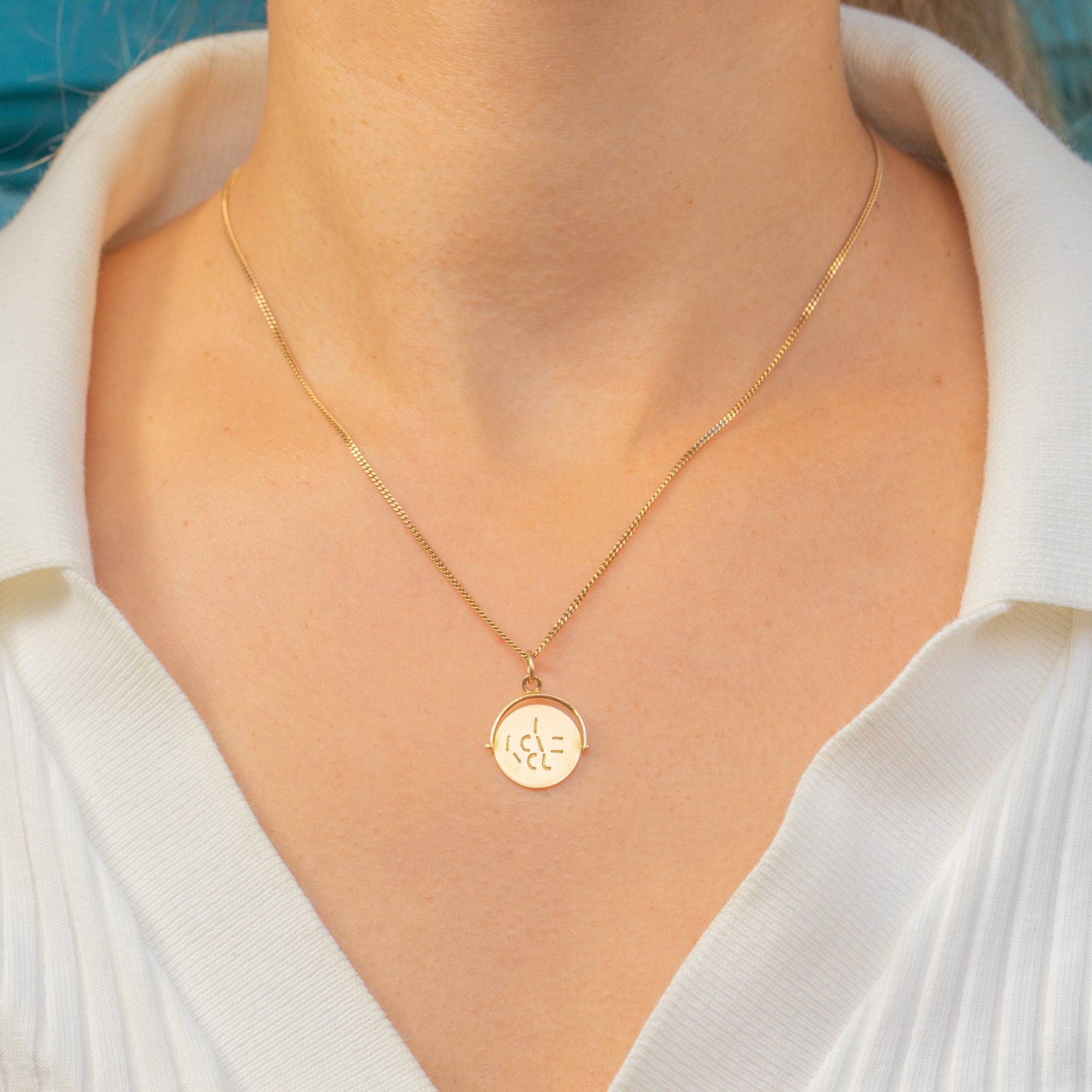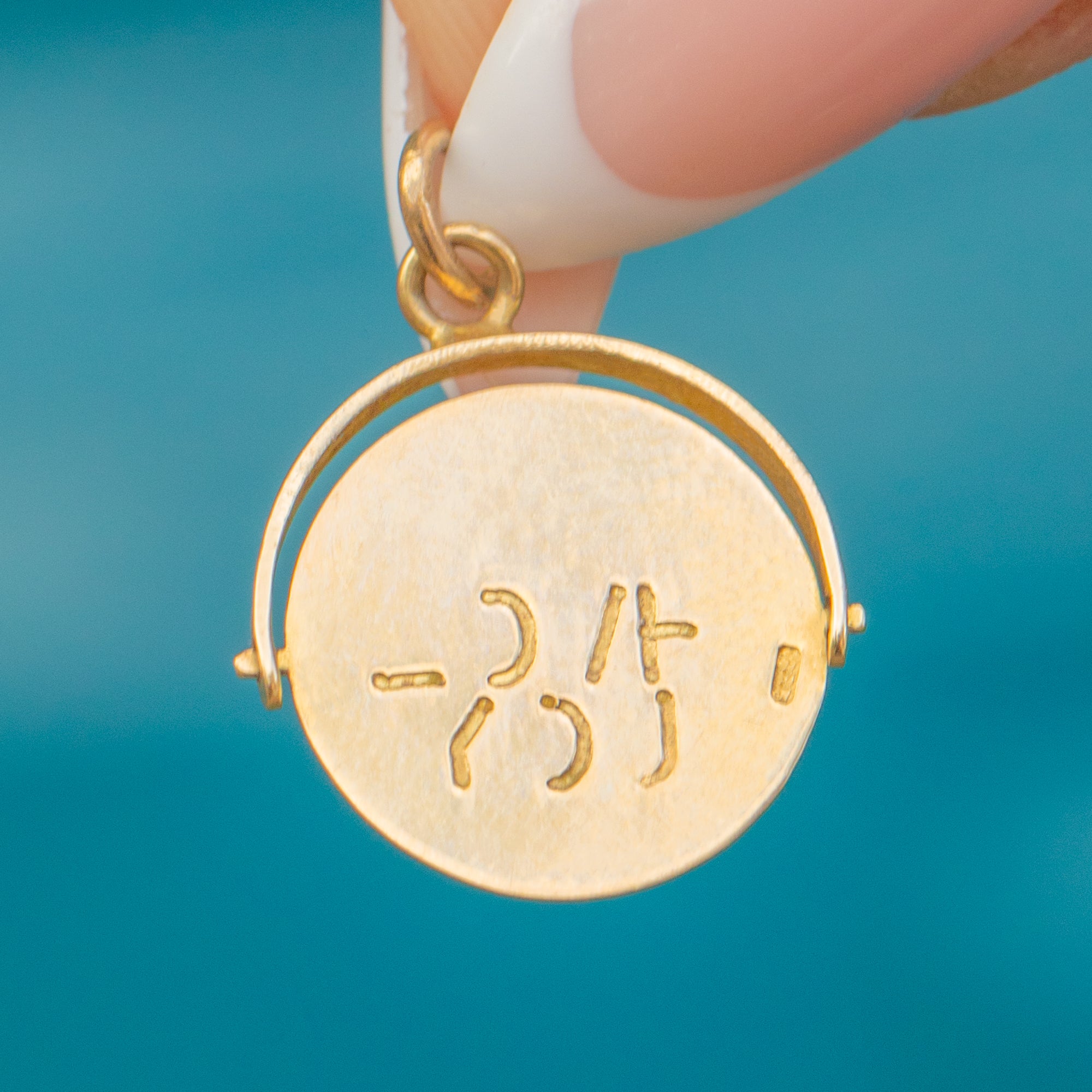 This charming Mid-Century spinning pendant is a sweet token of love, crafted in 9ct Gold. On one side the words “I Love You” are cut into the Gold, while the reverse spins to reveal a blank side, giving a playful and tactile element to the design.