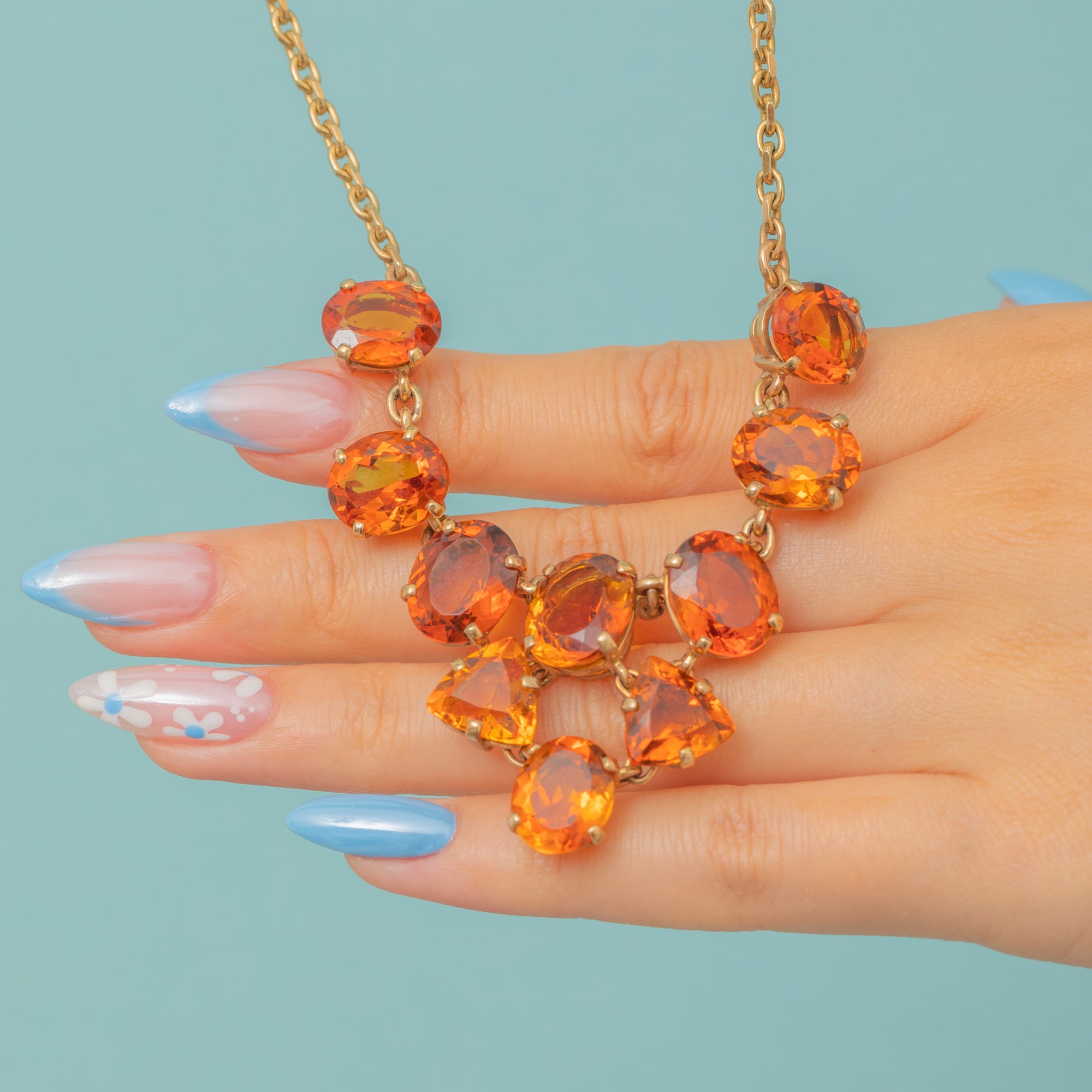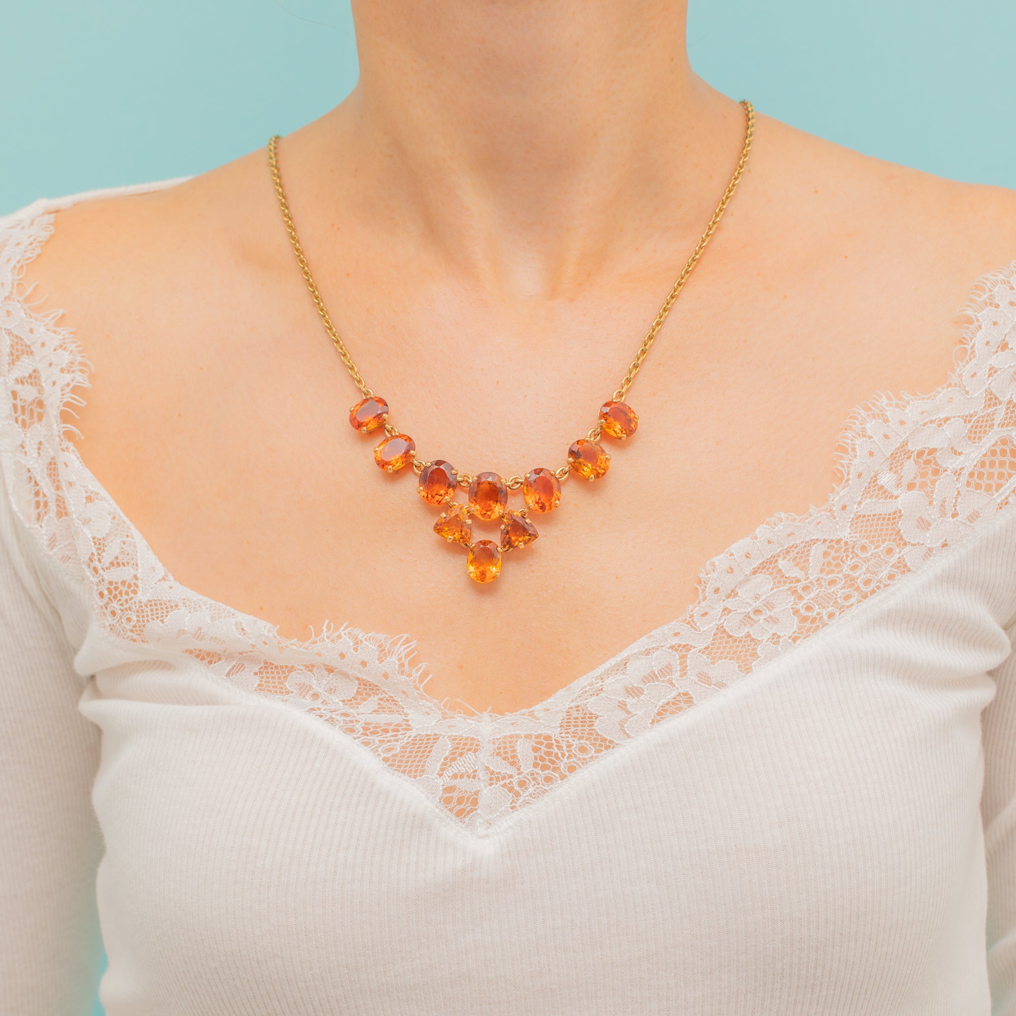EXCELLENT: Each Madeira Citrine is radiant, free from any notable chips or nibbles, and set securely in its claws. The chain links are uniform and secure, and the bolt ring is in perfect working order. With the smooth setting backs providing comfortable wear and little else to note, this necklace can be worn with utmost confidence.