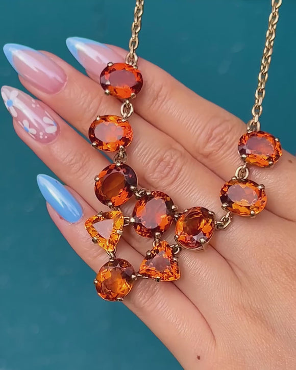 Crafted from glossy 9ct Gold, this stunning vintage necklace flaunts ten plump Madeira Citrines, faceted beautifully and boasting 27.20 carats combined. Madeira Citrines are distinguishable by their vibrant, fiery hues, and these saturated gemstones are no exception, with each one boasting a deep caramel hue.