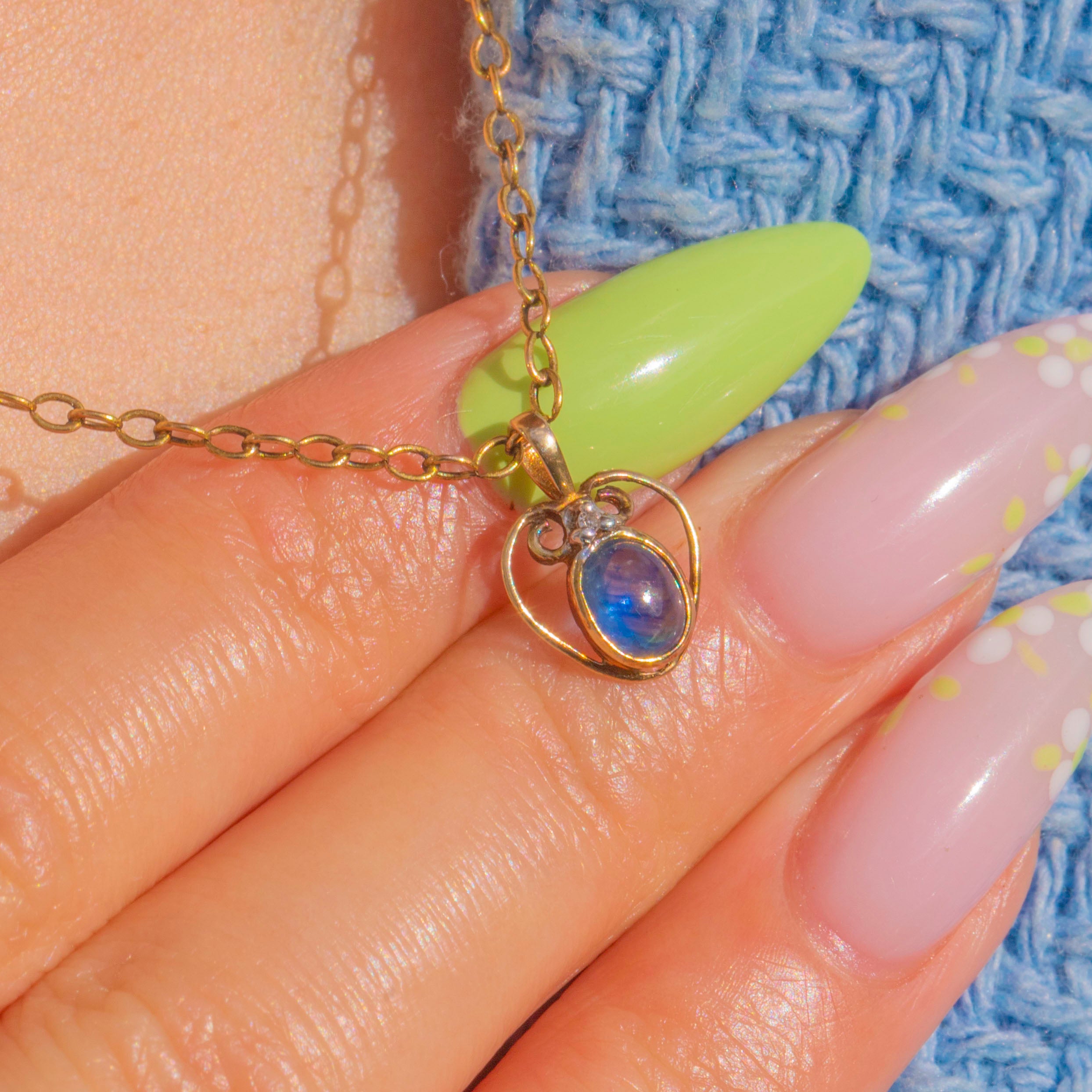 EXCELLENT: The Sapphire cabochon is smooth and lustrous with only the most minimal surface wear observed under magnification; the tiny Diamond accent is bright and secure. The openwork heart-and-scroll setting remains crisp with a lovely antique patina, and the bezel and bail are in excellent order. No visible repairs or alterations; this piece has been very well cared for.