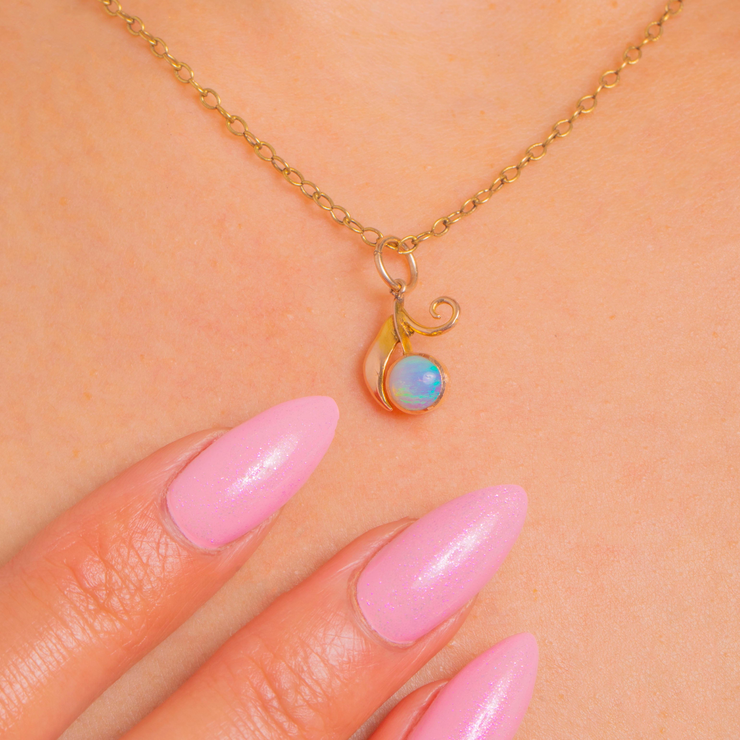 Sweet and sculptural, this petite “berry” charm pairs a luminous round Opal with a softly polished 9ct Gold leaf and a delicate curled tendril. The Opal’s blue-green play of colour glows against a smooth bezel, while the organic foliate detailing lends a romantic, Art Nouveau flourish.