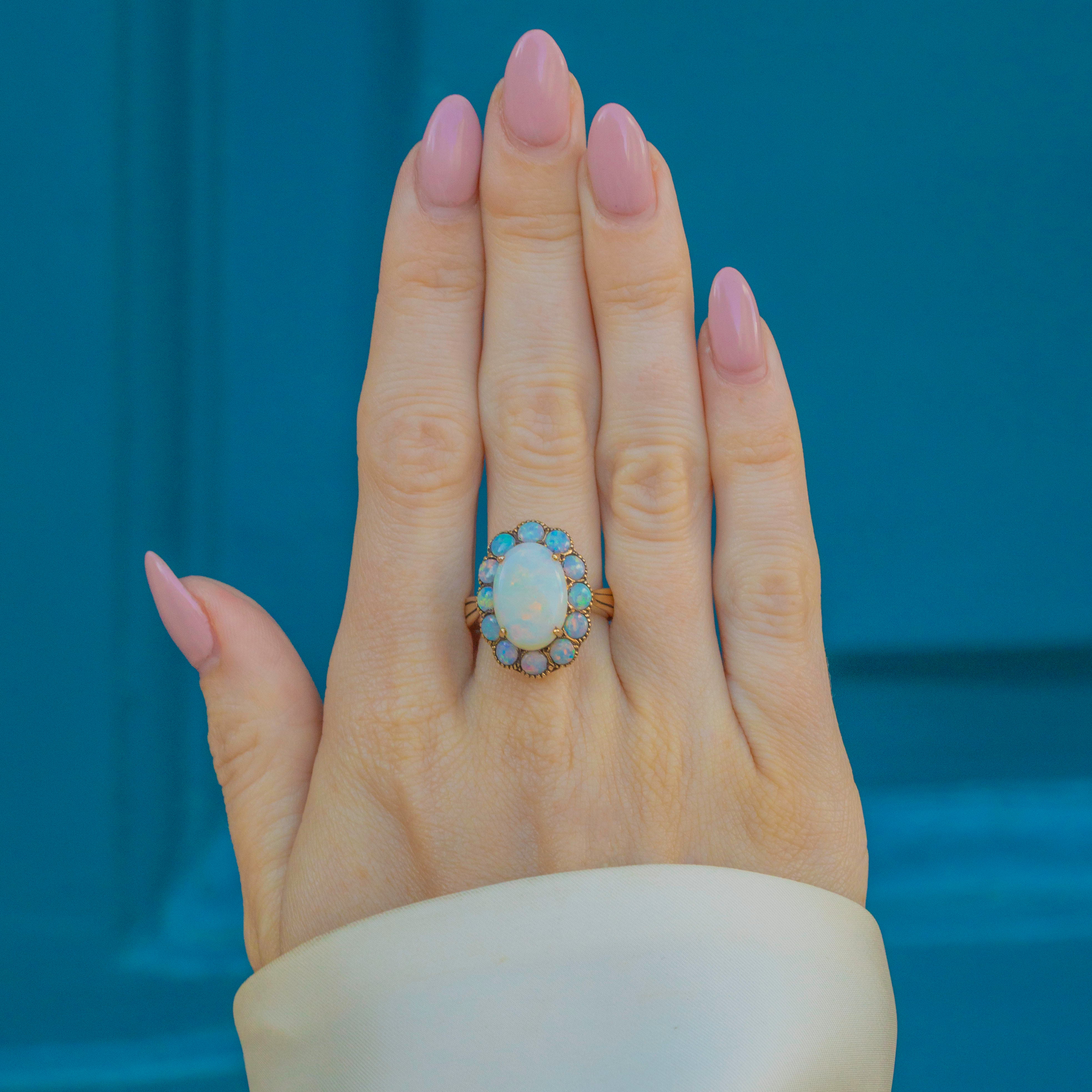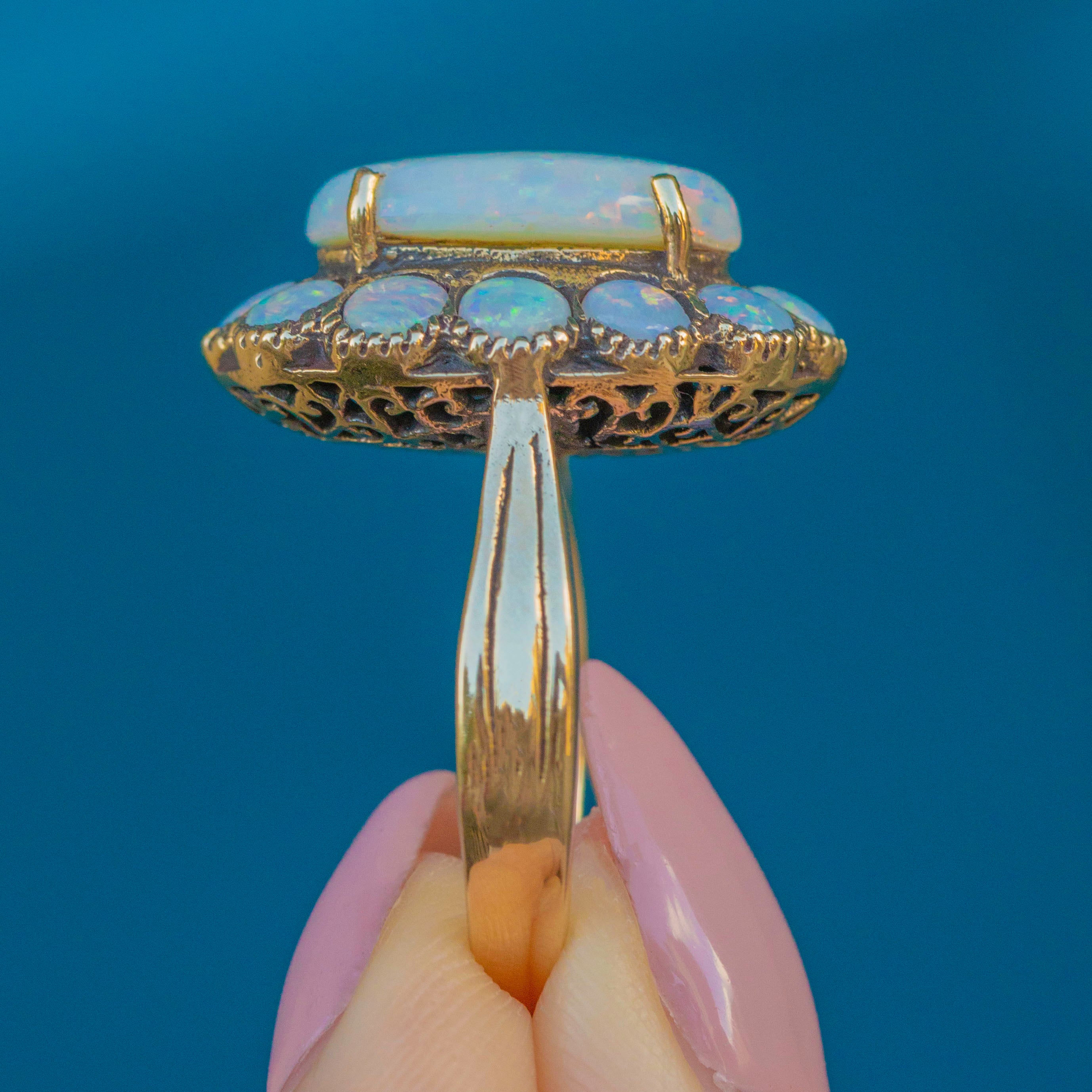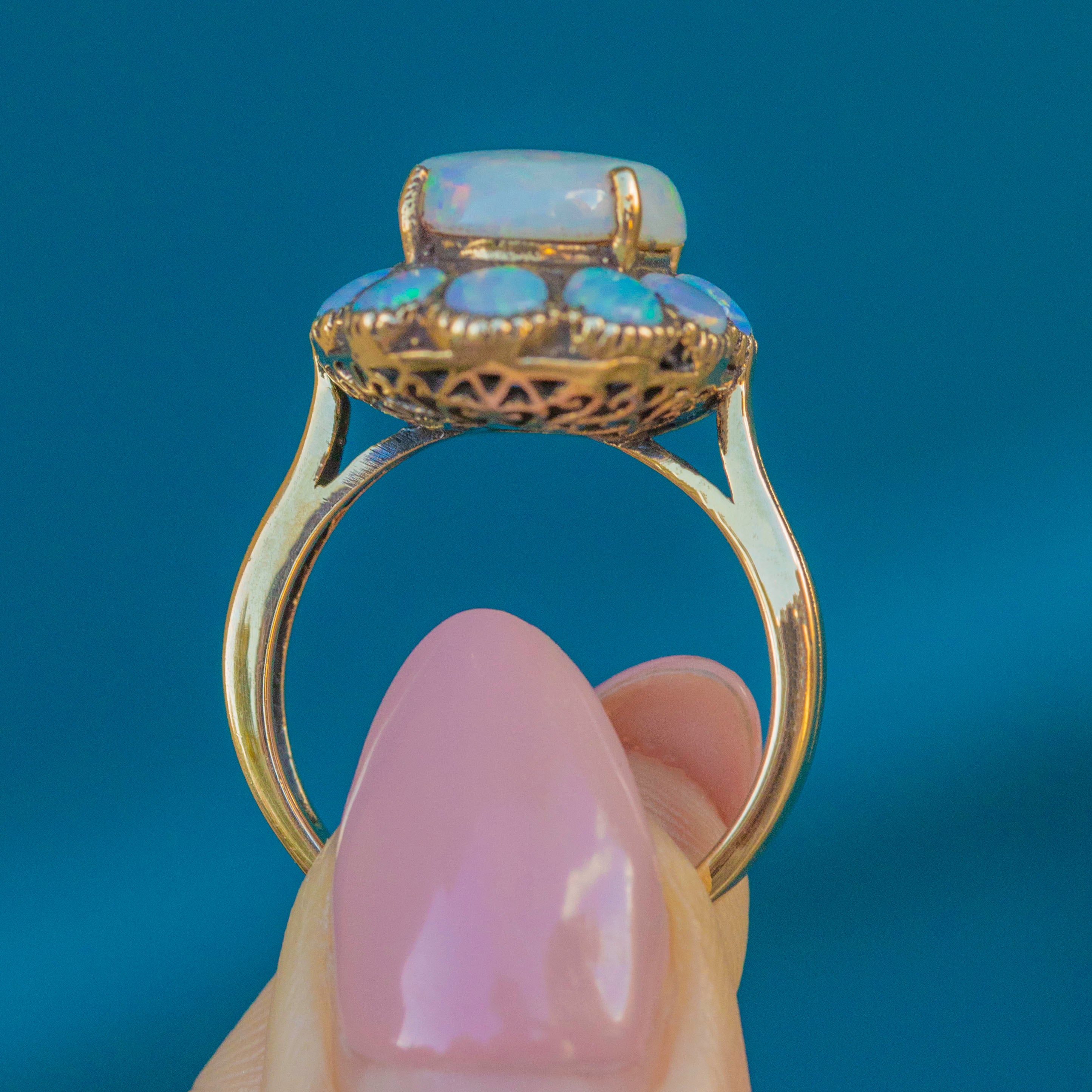 EXCELLENT. This 9ct Gold Opal flower cluster ring is in excellent condition, maintaining her original lustre. The Opals are secure in their setting with a glossy smooth finish. The Gold is buttery and has retained her form well, allowing you to wear it comfortably and securely all day long.