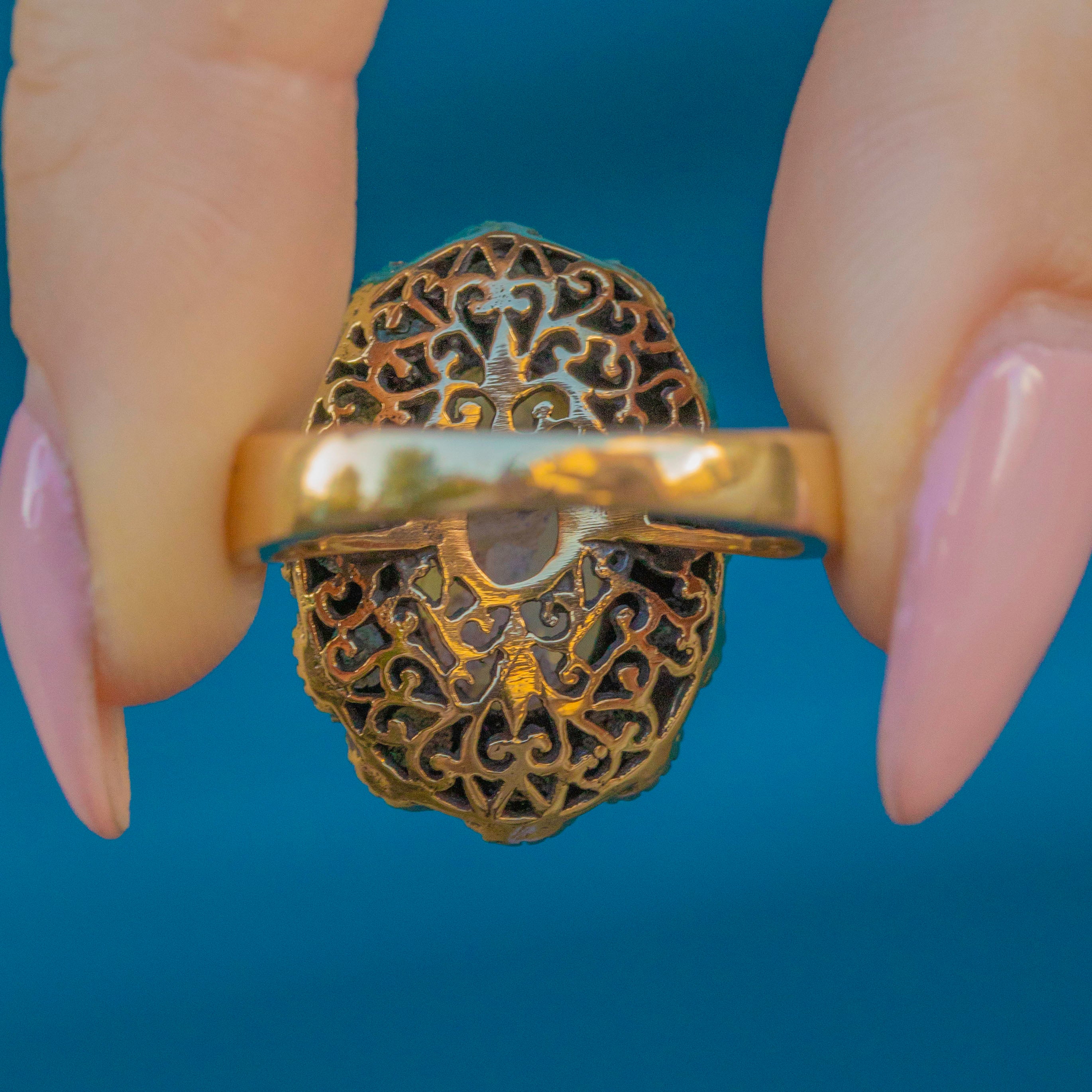 The vivacious glow of her Opals creates a striking contrast against the buttery glow of the 9ct Gold settings and band, making her a truly eye-catching ring. Perfect for adding a touch of glamour to any ensemble, this vintage ring will become a cherished favourite in your jewellery collection!