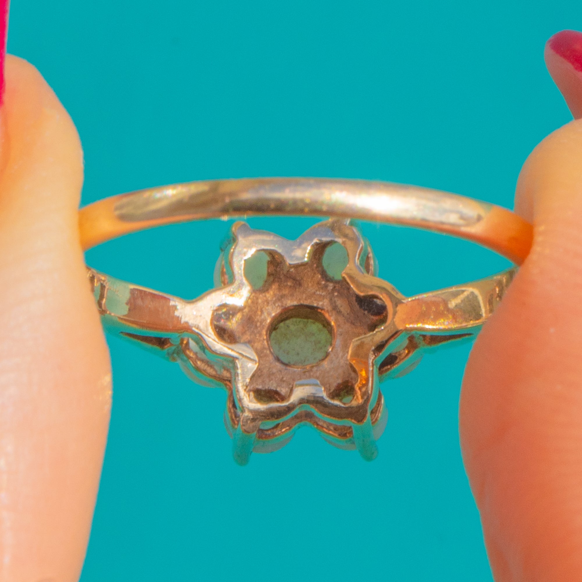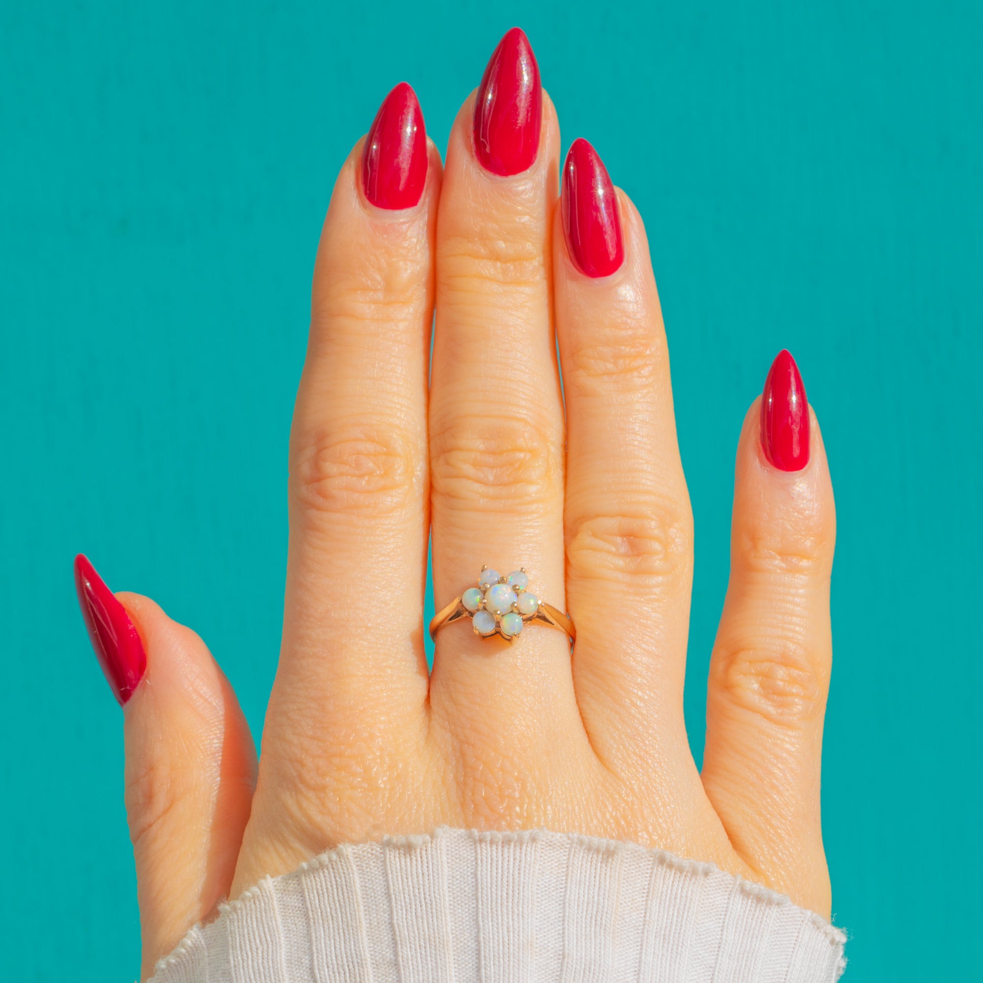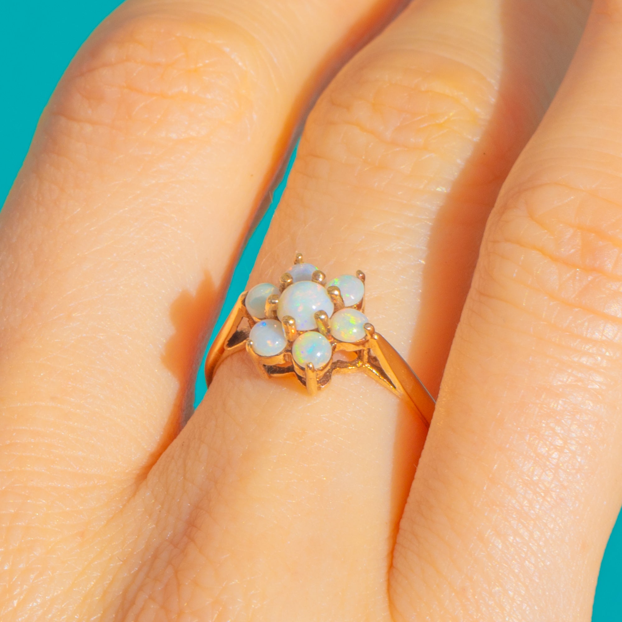 A dainty Vintage flower cluster ring in 9ct Gold, set with seven luminous Opal cabochons. Arranged as a classic rosette, the central Opal is encircled by six companions, each showing pretty flashes of green, blue and pink against a milky body for that unmistakable Opal glow.