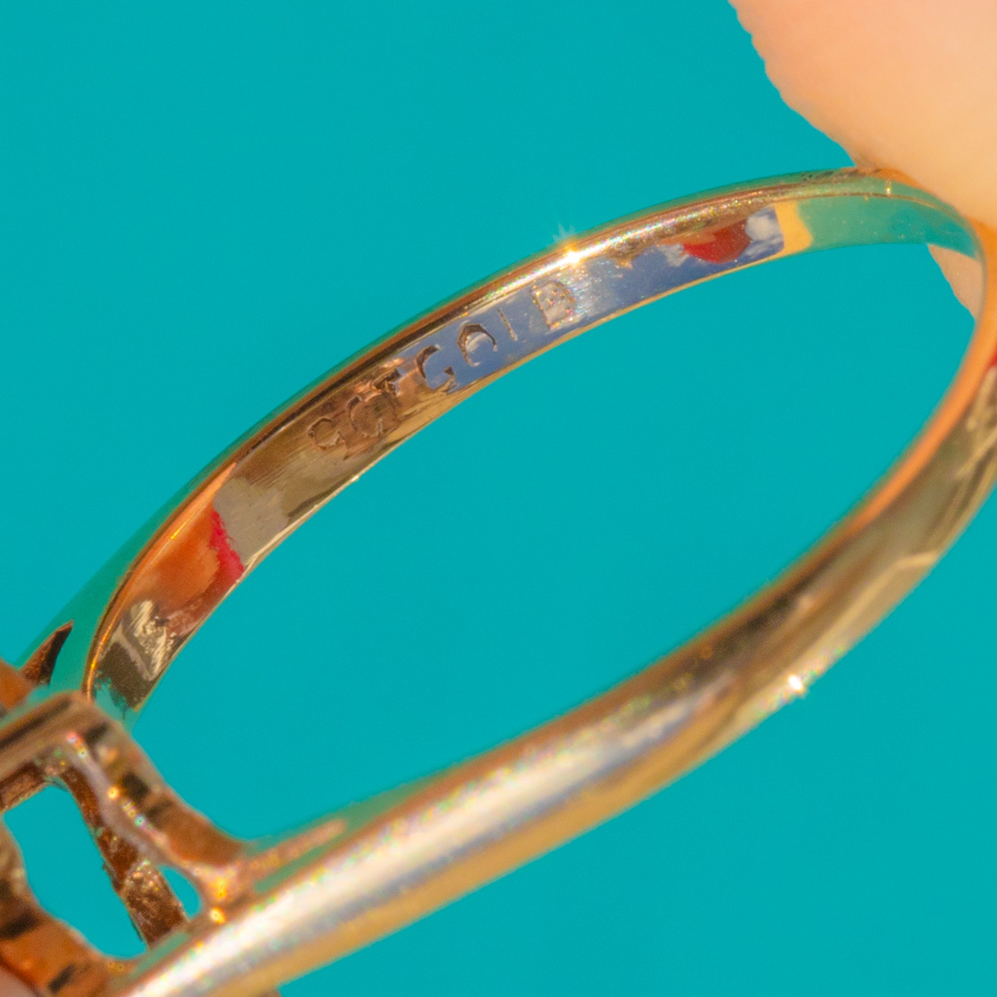 The raised, open basket and neat claws lend airy elegance, while the shoulders taper into a slim, polished shank for a refined finish. Stamped 9ct Gold inside the band, this is a sweet, feminine piece that stacks beautifully or charms all on its own.