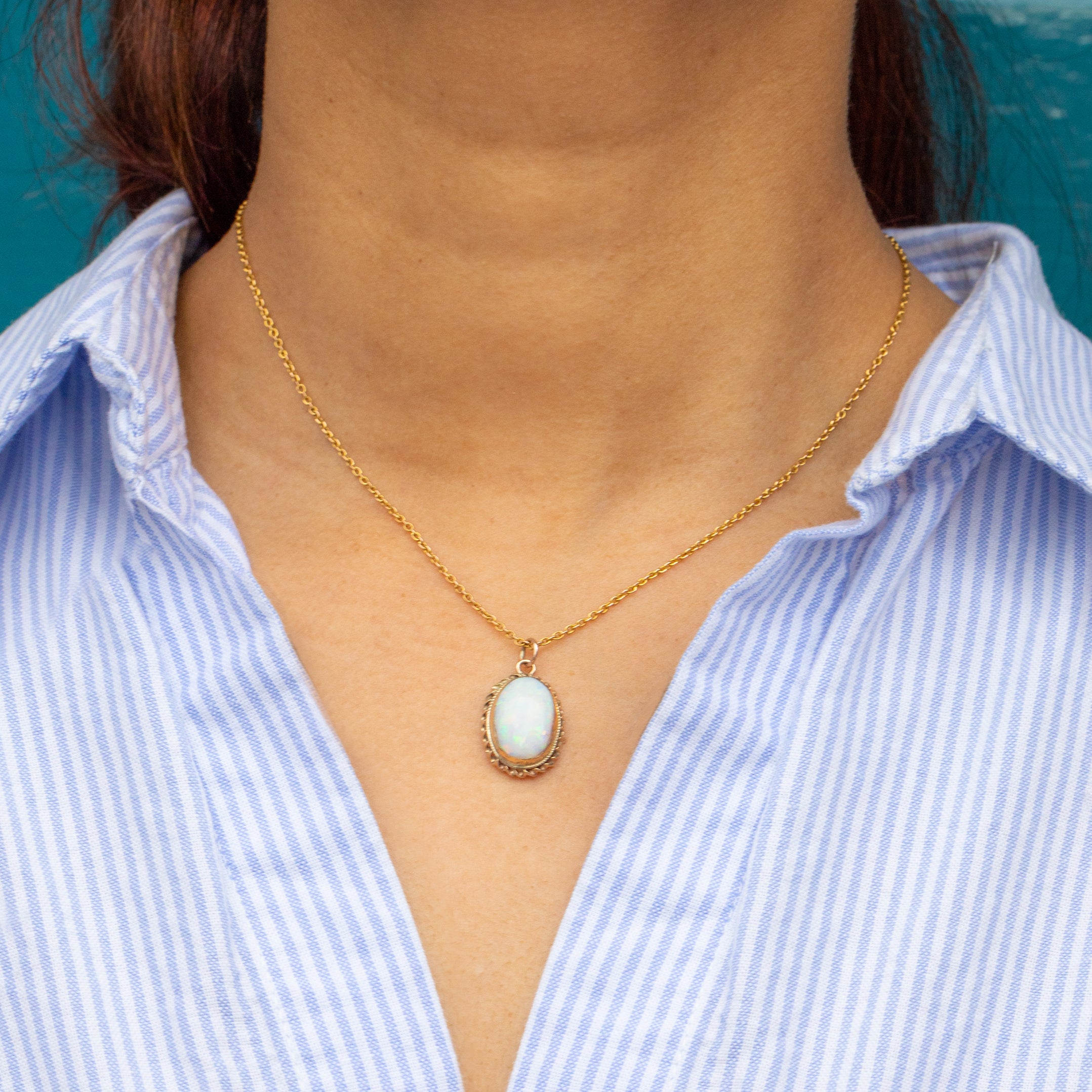 Crafted from buttery 9ct Gold, a striking rope border perfectly frames the vintage Opal cabochon. Opals are a symbol of hope, purity and truth, so this vintage Gold pendant would make a wonderfully thoughtful gift.