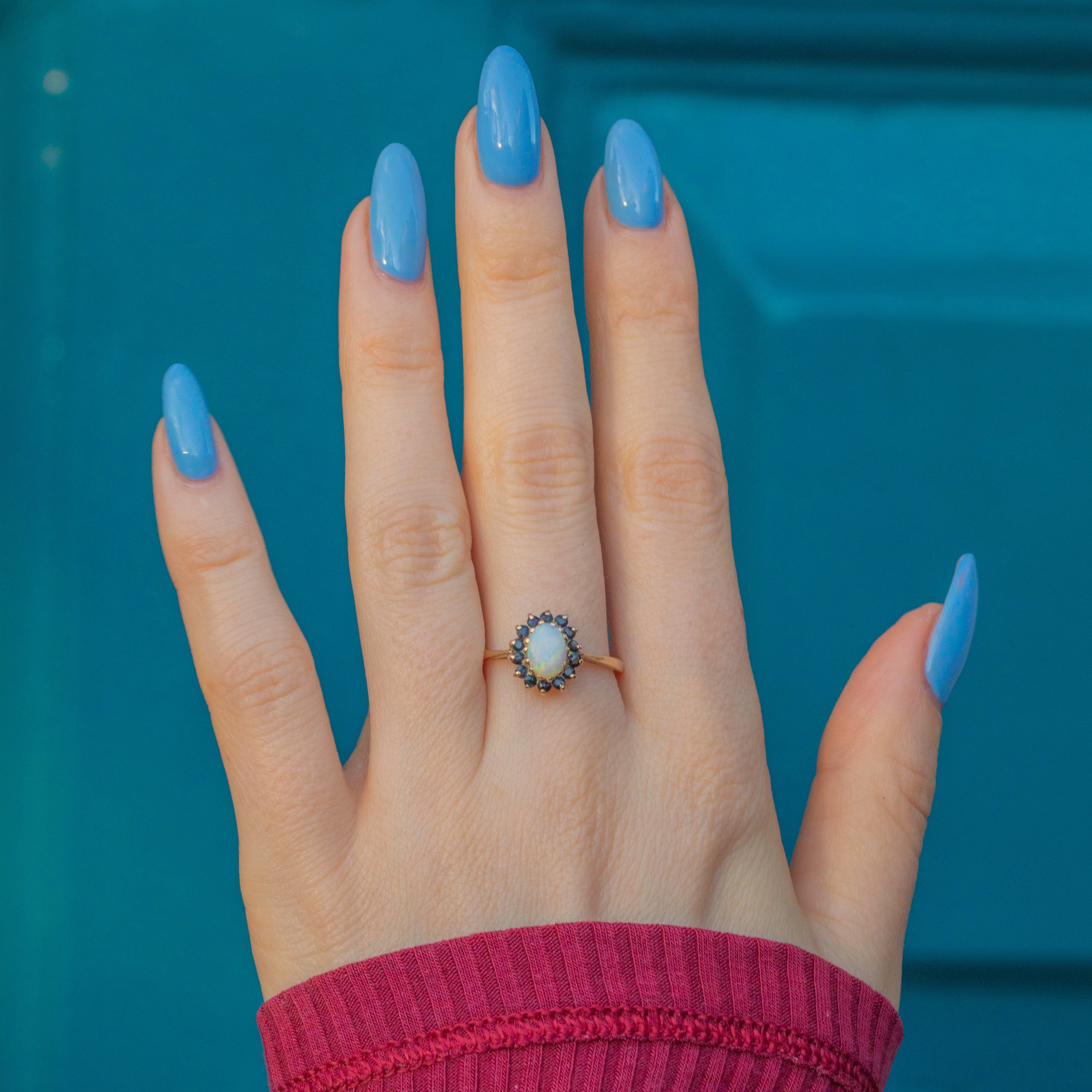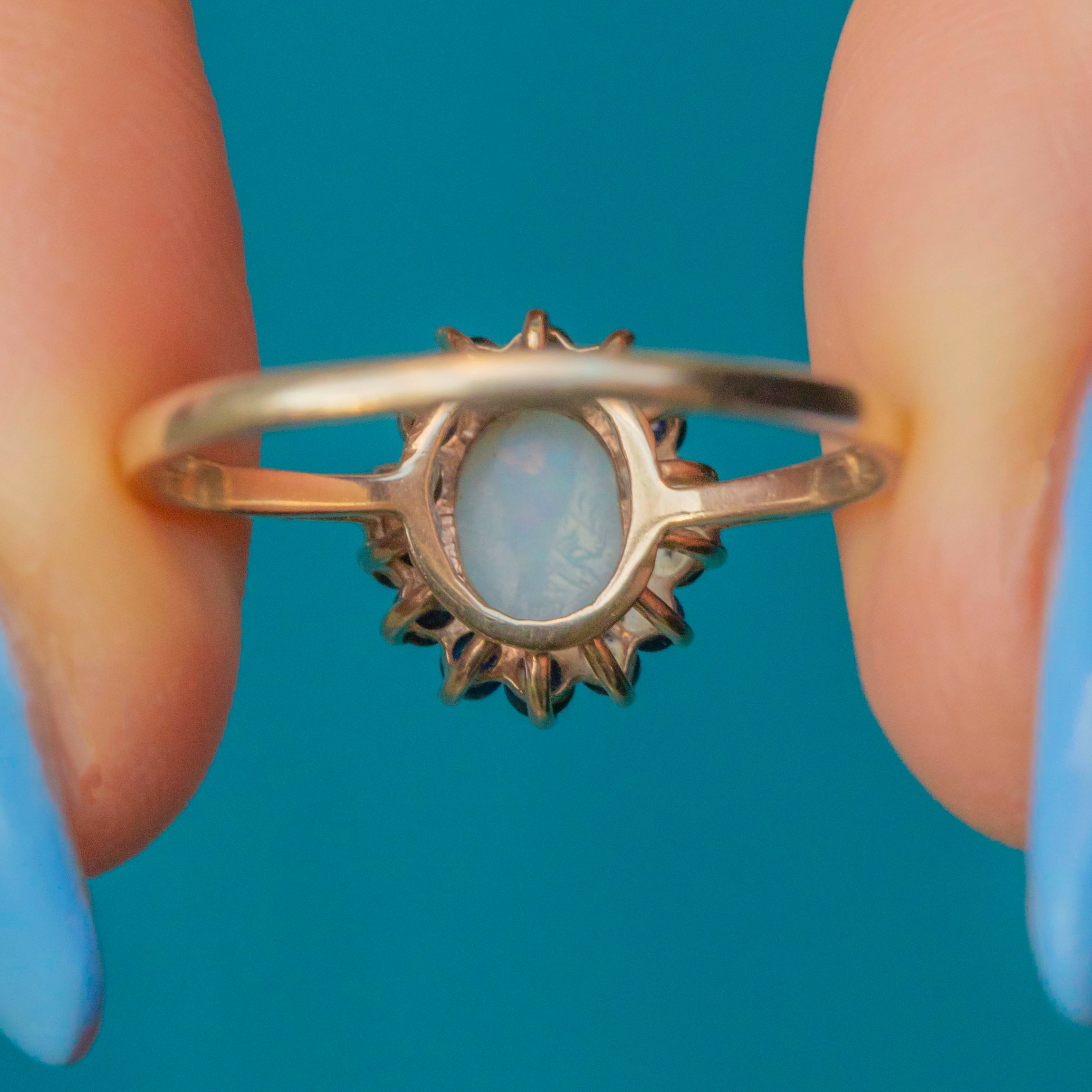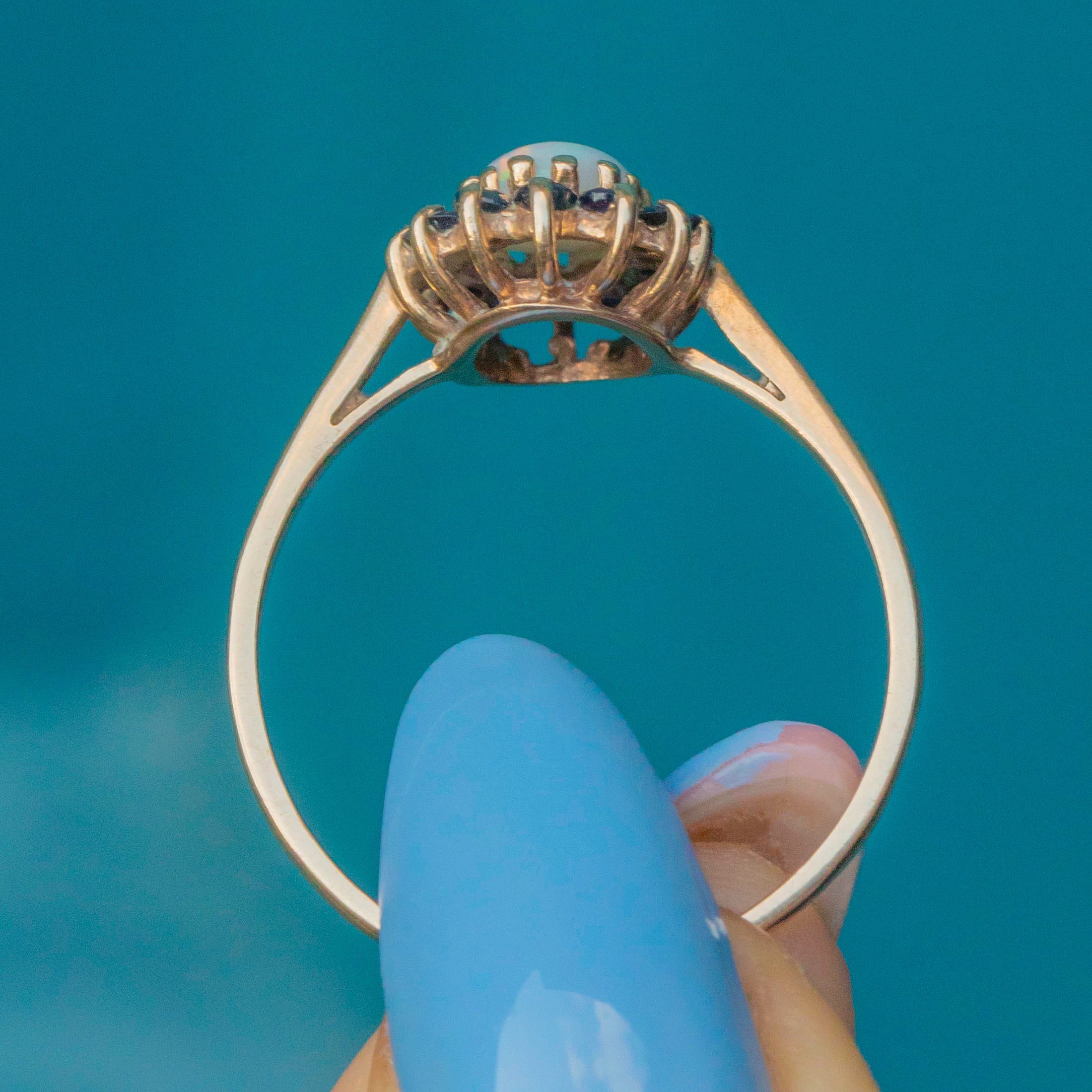 EXCELLENT. This 9ct Gold Opal Sapphire cluster ring is in excellent condition. The Gold is buttery and the band is smooth, with a full set of hallmarks dating to 1987 that have remained legible. The gemstones are free from surface wear and securely set, promising many more years of wear and enjoyment!