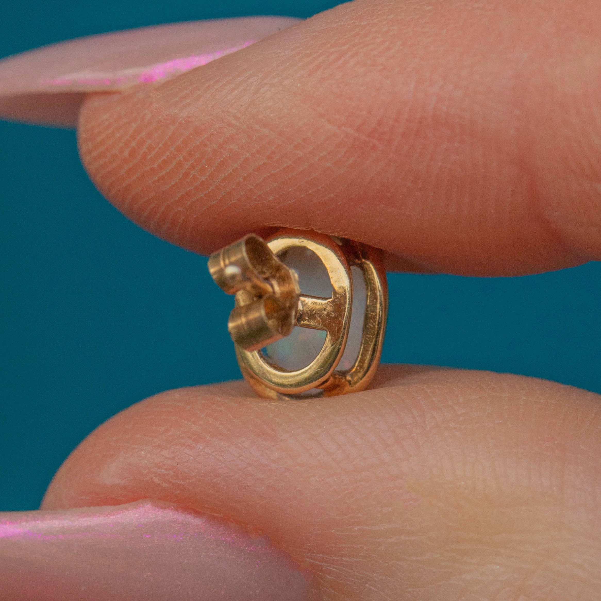 VERY GOOD. These 9ct Gold Opal stud earrings are in very good condition. The Opals are smooth to the touch and free from any visible signs or wear. The Gold is buttery and each component is securely soldered, with only minor wear to the settings, commensurate with age. The Opals have remained securely set with no signs of movement and the butterfly backs are snug-fitting providing secure wear.