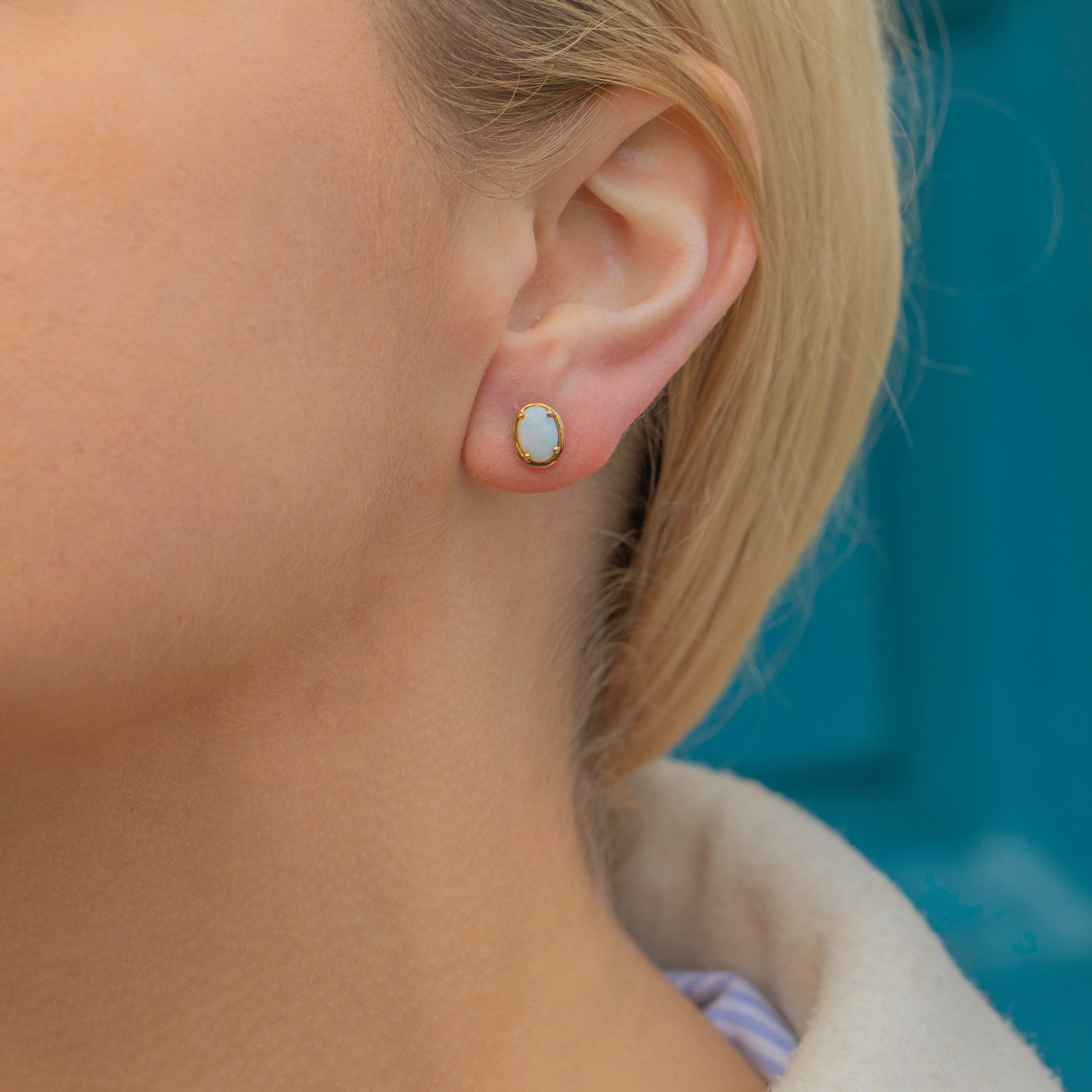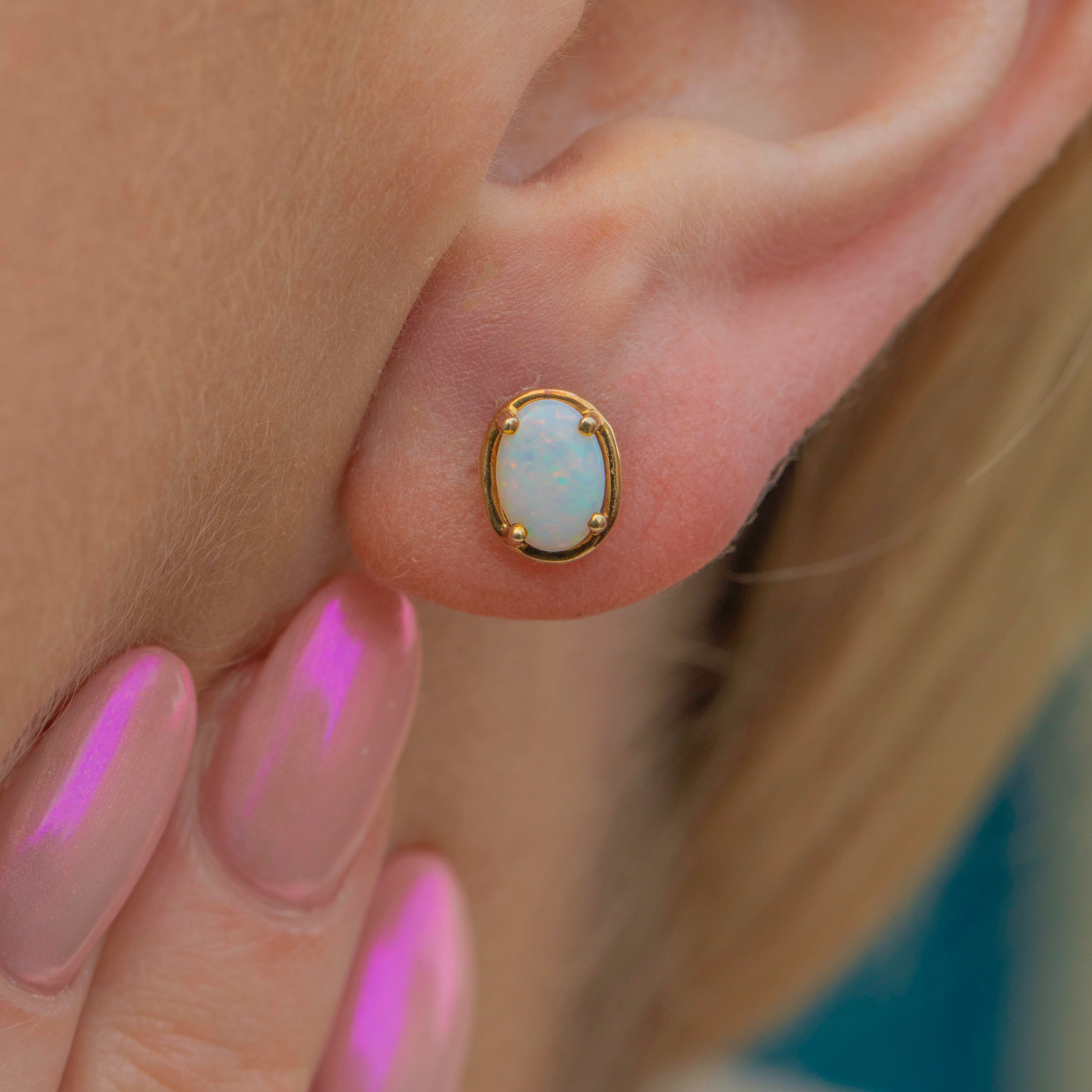 Undeniably elegant and perfect for daily wear, these 9ct Gold Opal stud earrings will make a lovely addition to your collection! Each earring boasts a milky Opal cabochon revealing bright pops of acid green and sky blue with hints of fluorescent pink and orange under the light.