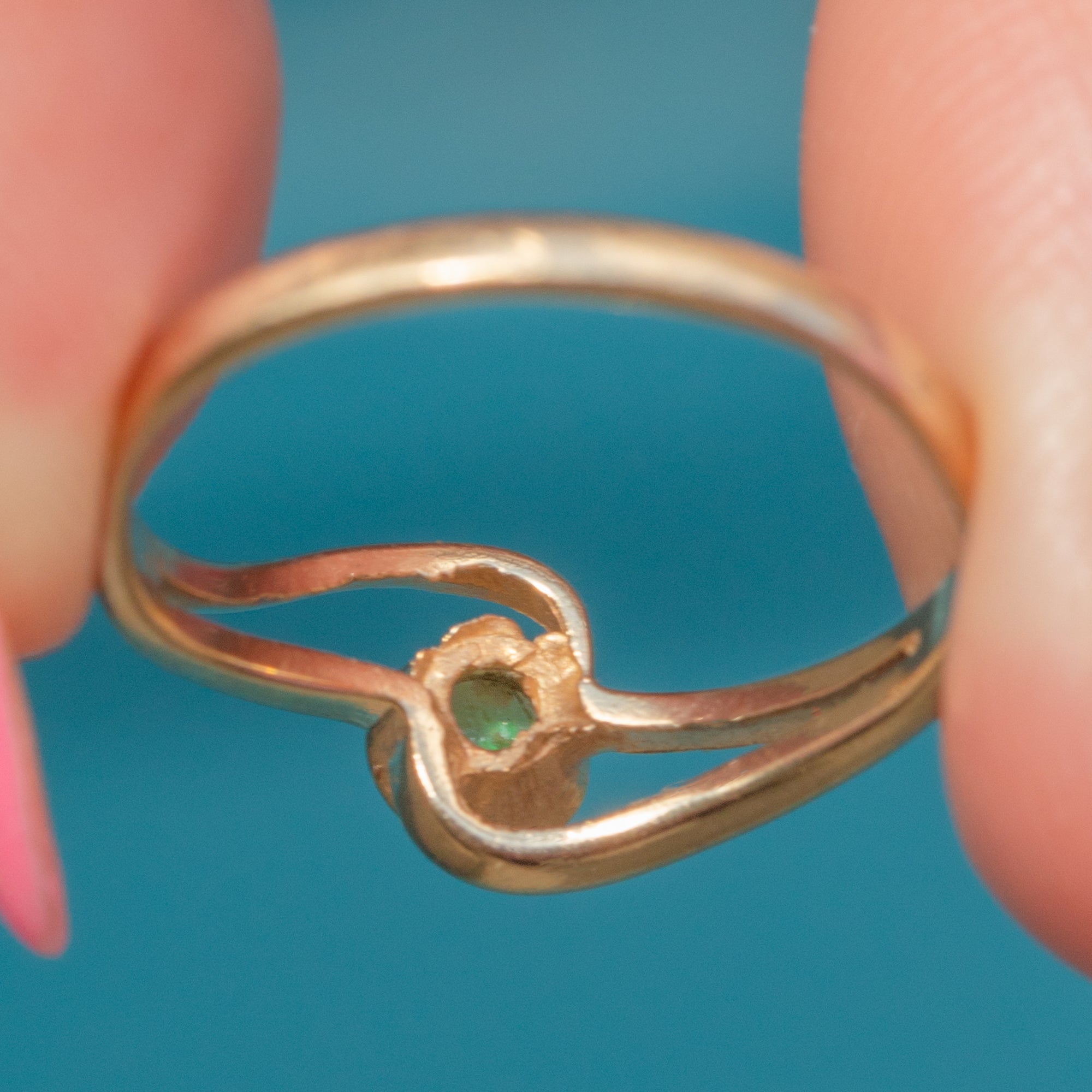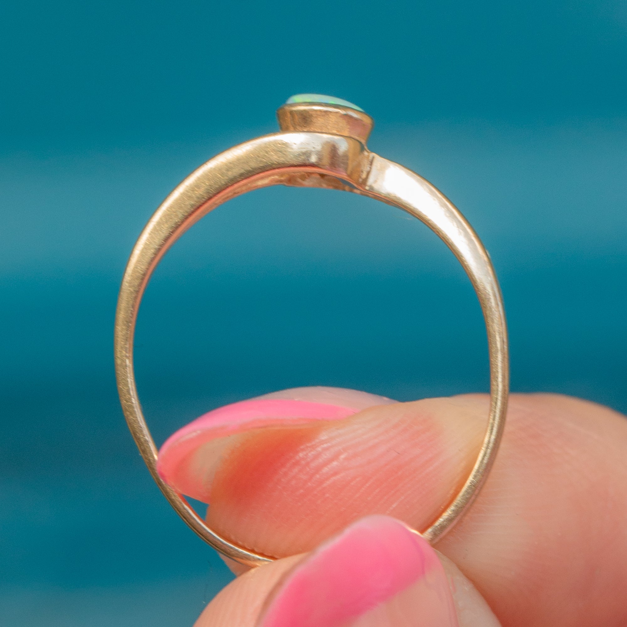Crafted from buttery 9ct Gold throughout, this vintage twist ring frames a gorgeous petite Opal in her centre, radiating soft azure and vibrant green hues. Her twist bezel feature adds a lovely, elegant texture and depth to this dainty ring, drawing your eyes towards the Opal and allowing the ring to embrace your finger effortlessly.