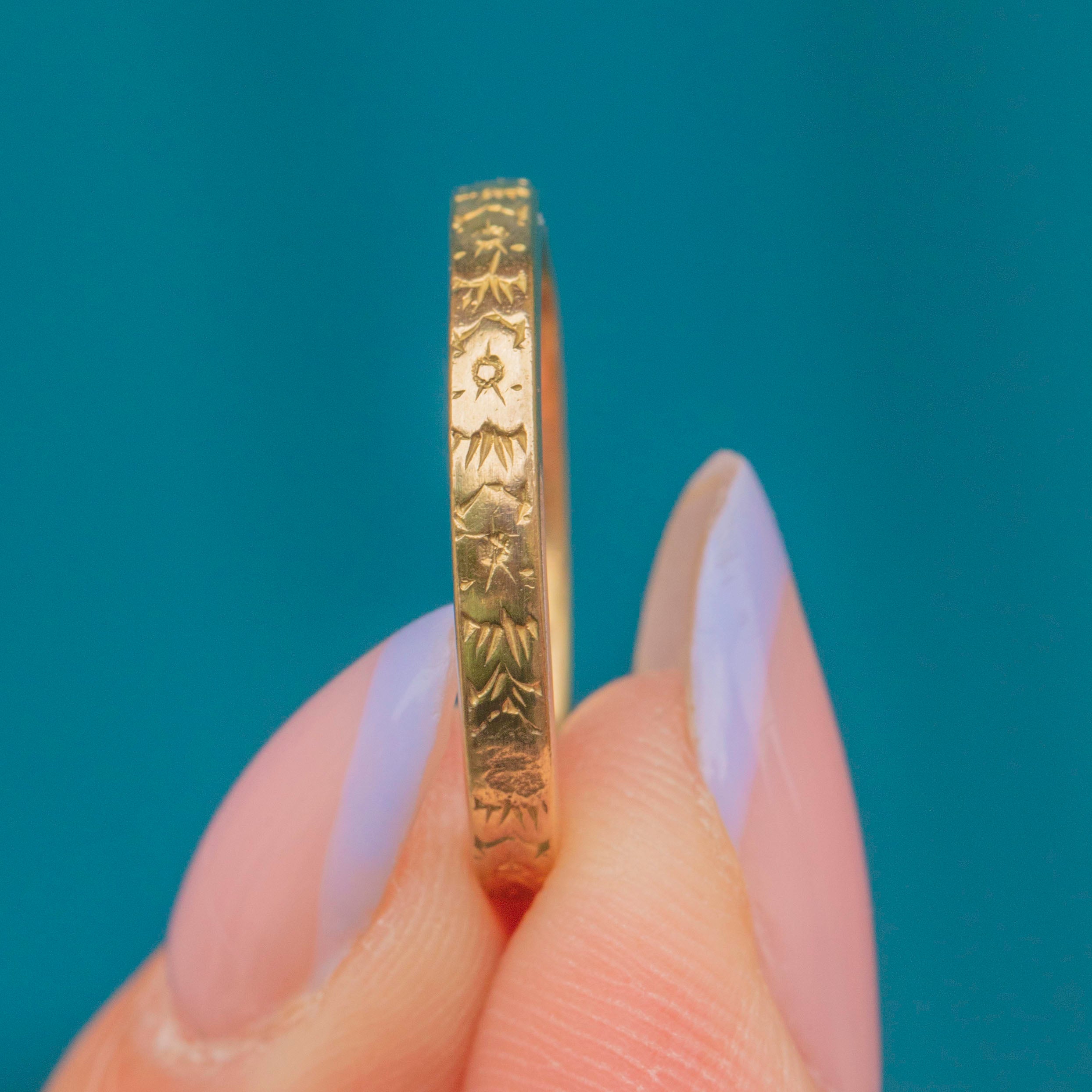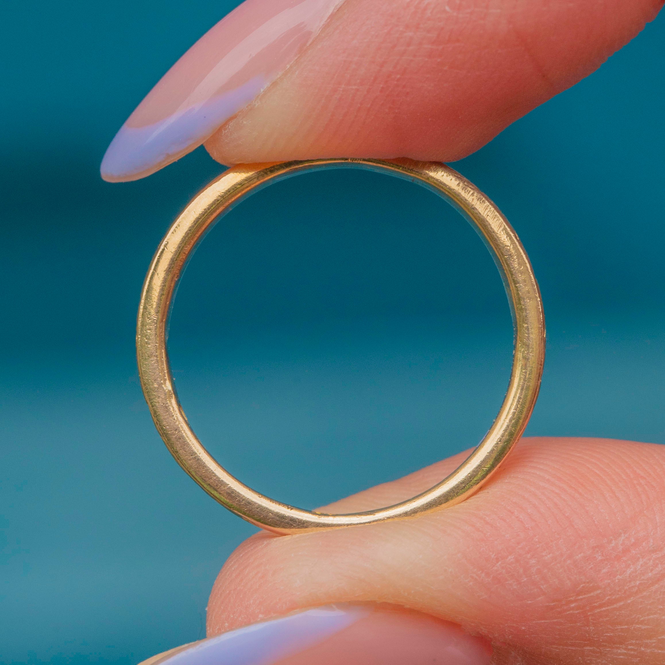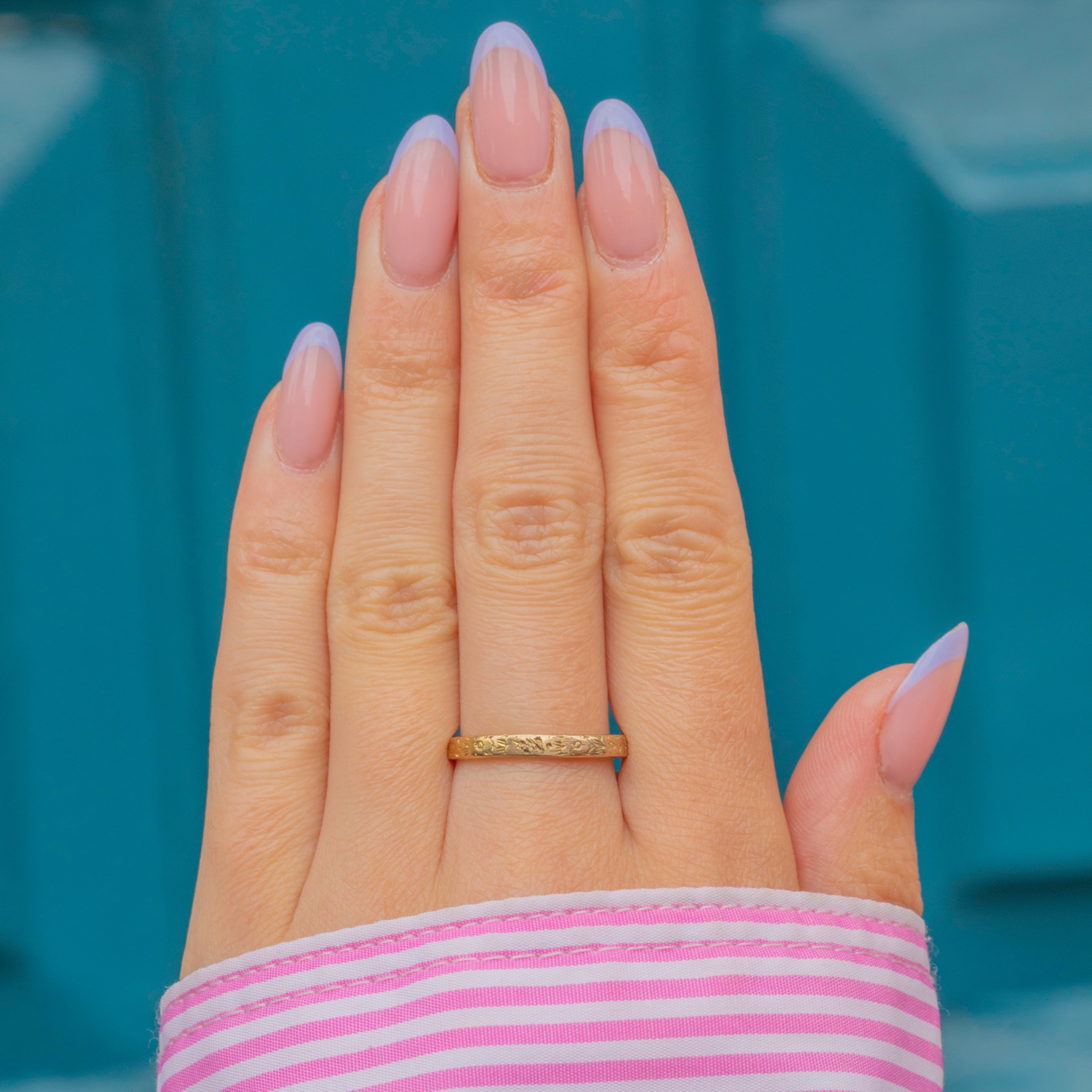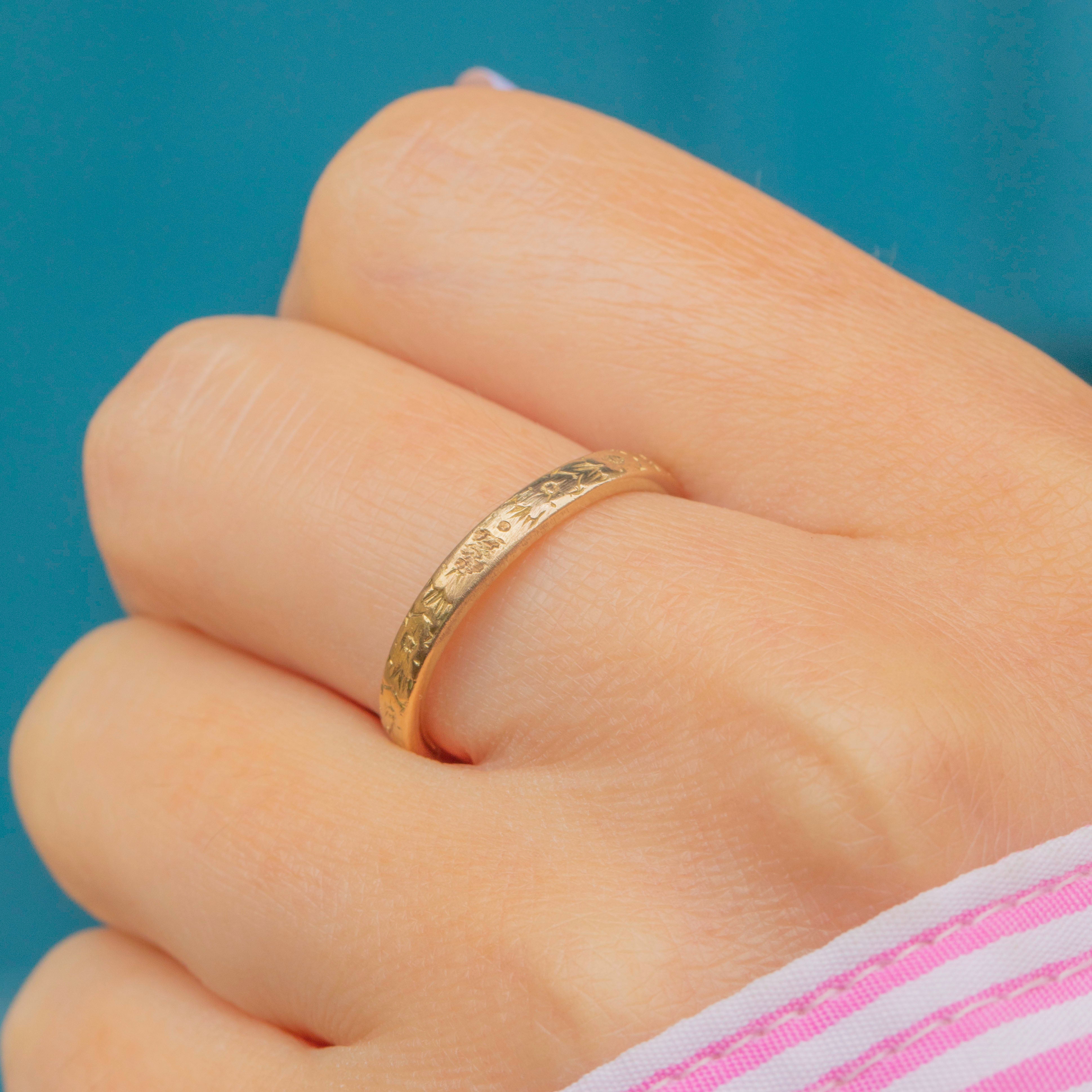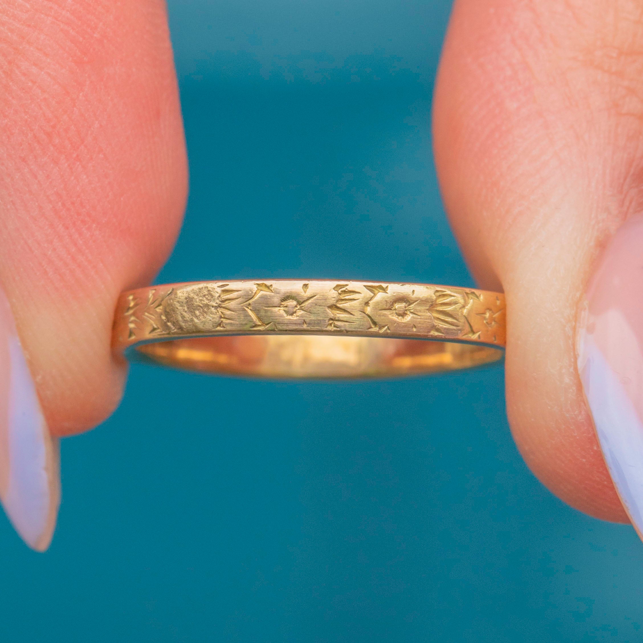 Symbolic of purity and new beginnings, orange blossoms have been a popular choice for wedding bands throughout history, making this vintage Gold ring a sentimental choice for your upcoming nuptials. Dainty and with a low profile, this solid Gold wedding band is perfect for everyday wear!