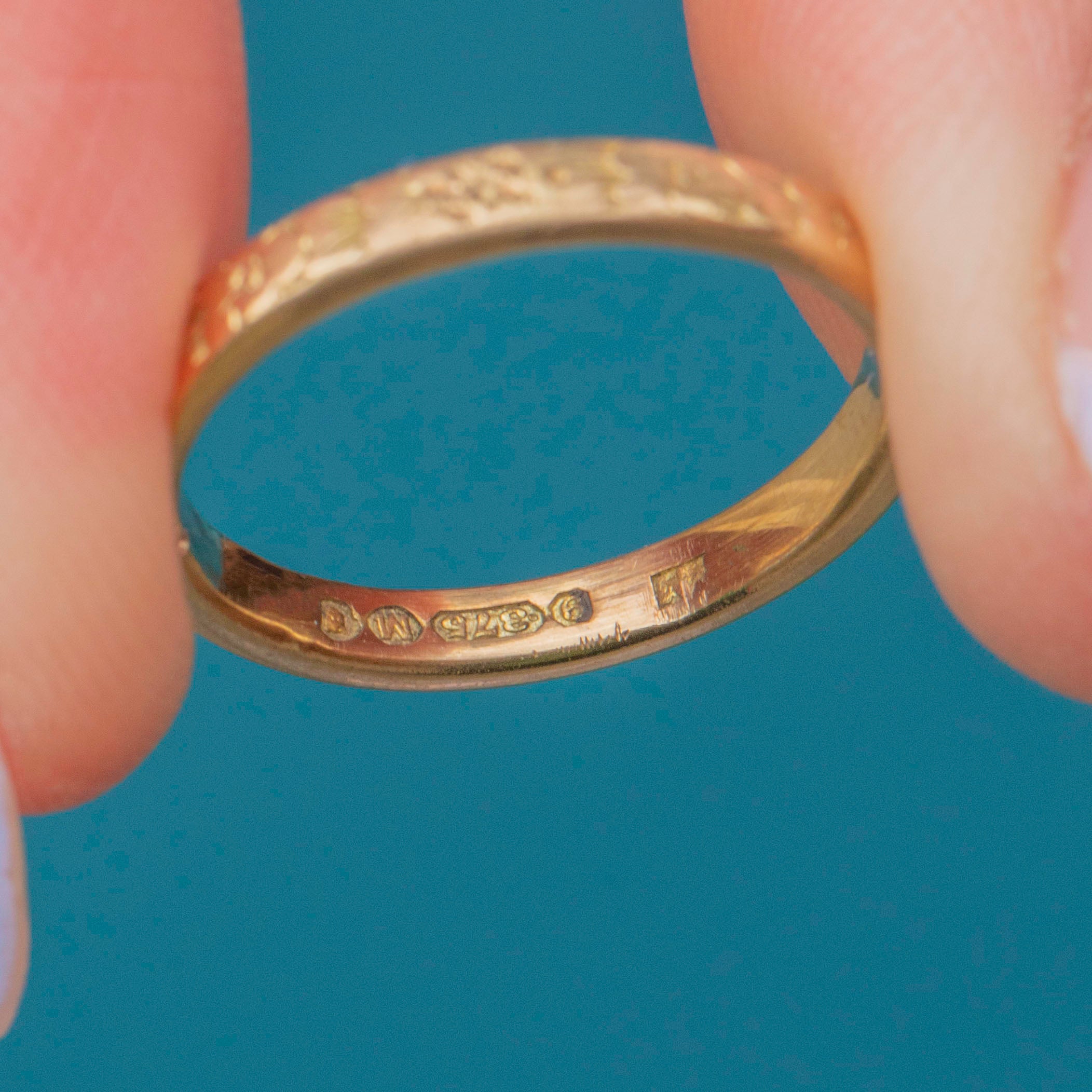 VERY GOOD: This 9ct Gold orange blossom wedding band is in very good condition. The Gold is radiant and the engraved details have remained defined for the most part, with  only small areas of wear noticeable under close inspection. The hallmarks are fully legible, allowing us to accurately date her to 1947. This ring is the perfect vintage wedding band to honour a new beginning!