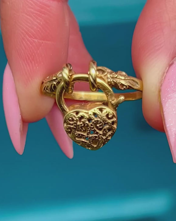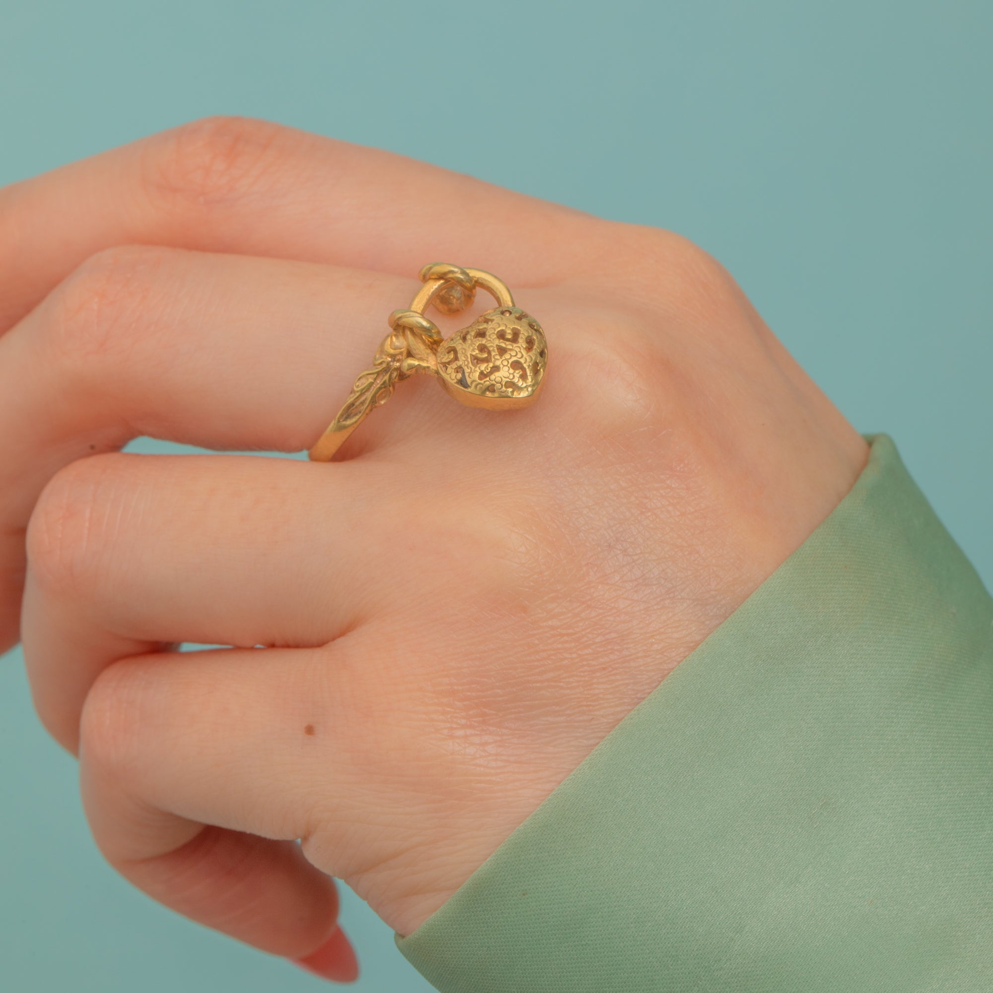 Meticulously crafted from buttery 9ct Gold, this vintage ring features a charming openwork heart padlock suspended from an intricately engraved curvaceous band.