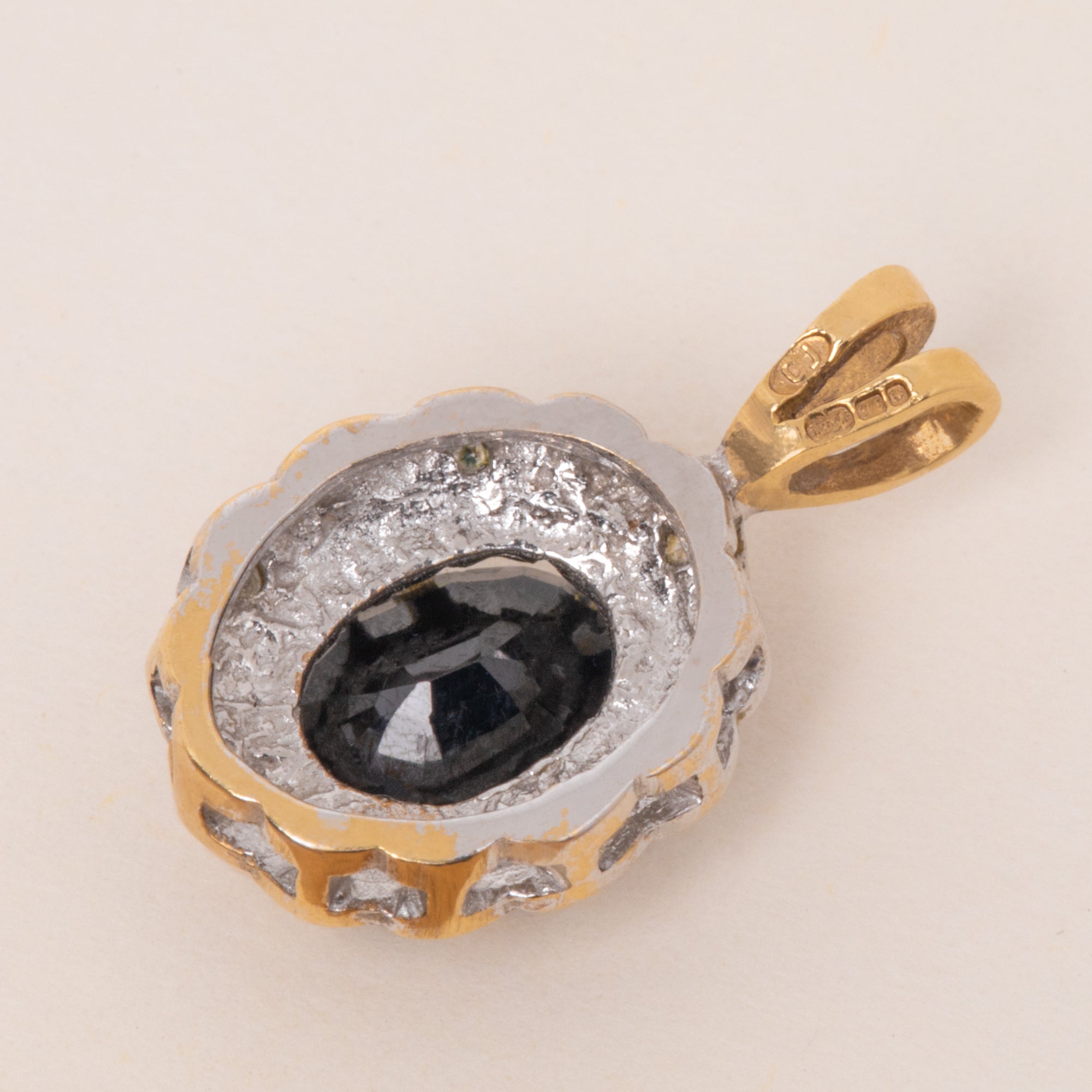 MATERIALS: Tests as 9ct Yellow Gold bale, 9ct White Gold settings, Sapphire (0.80ct), Diamonds.