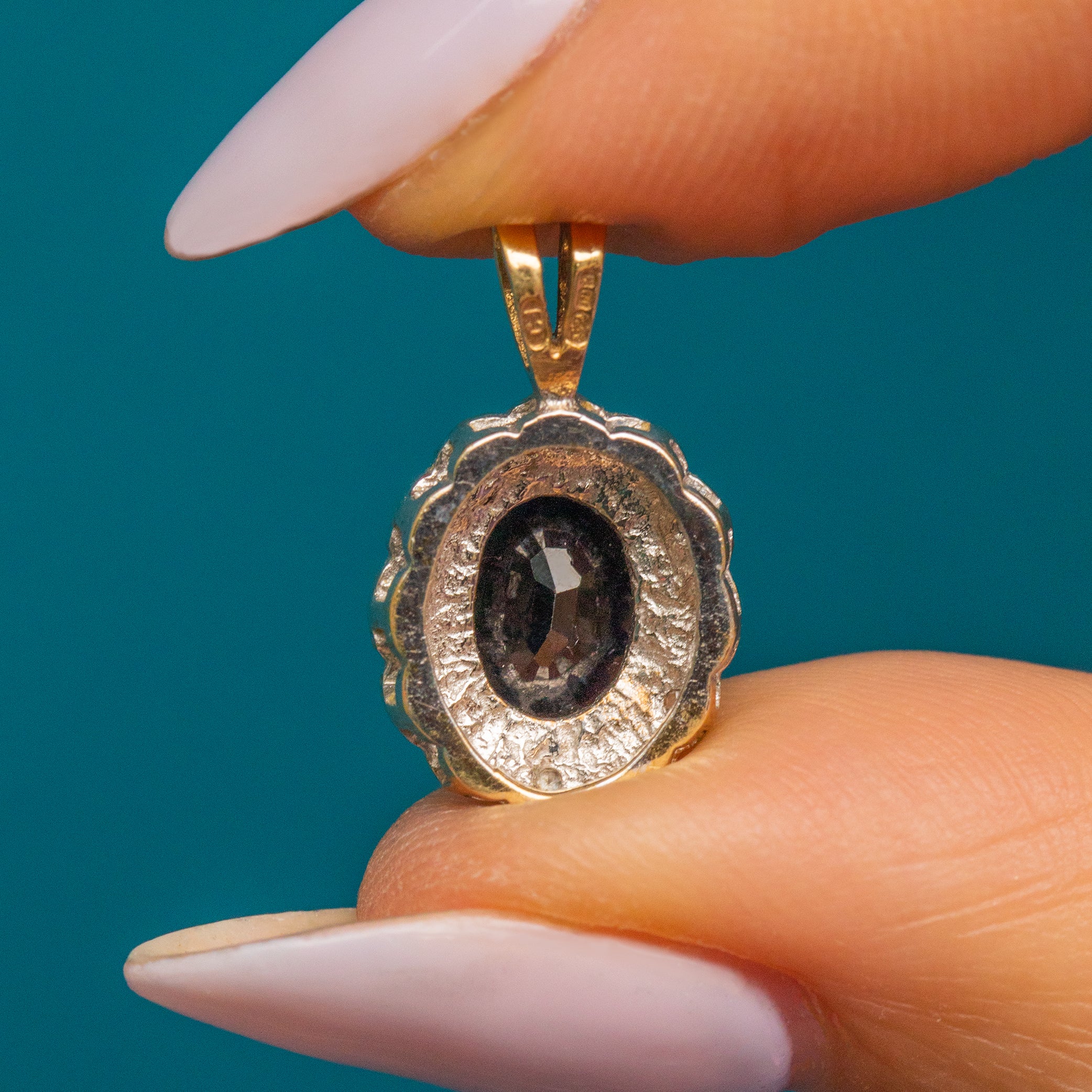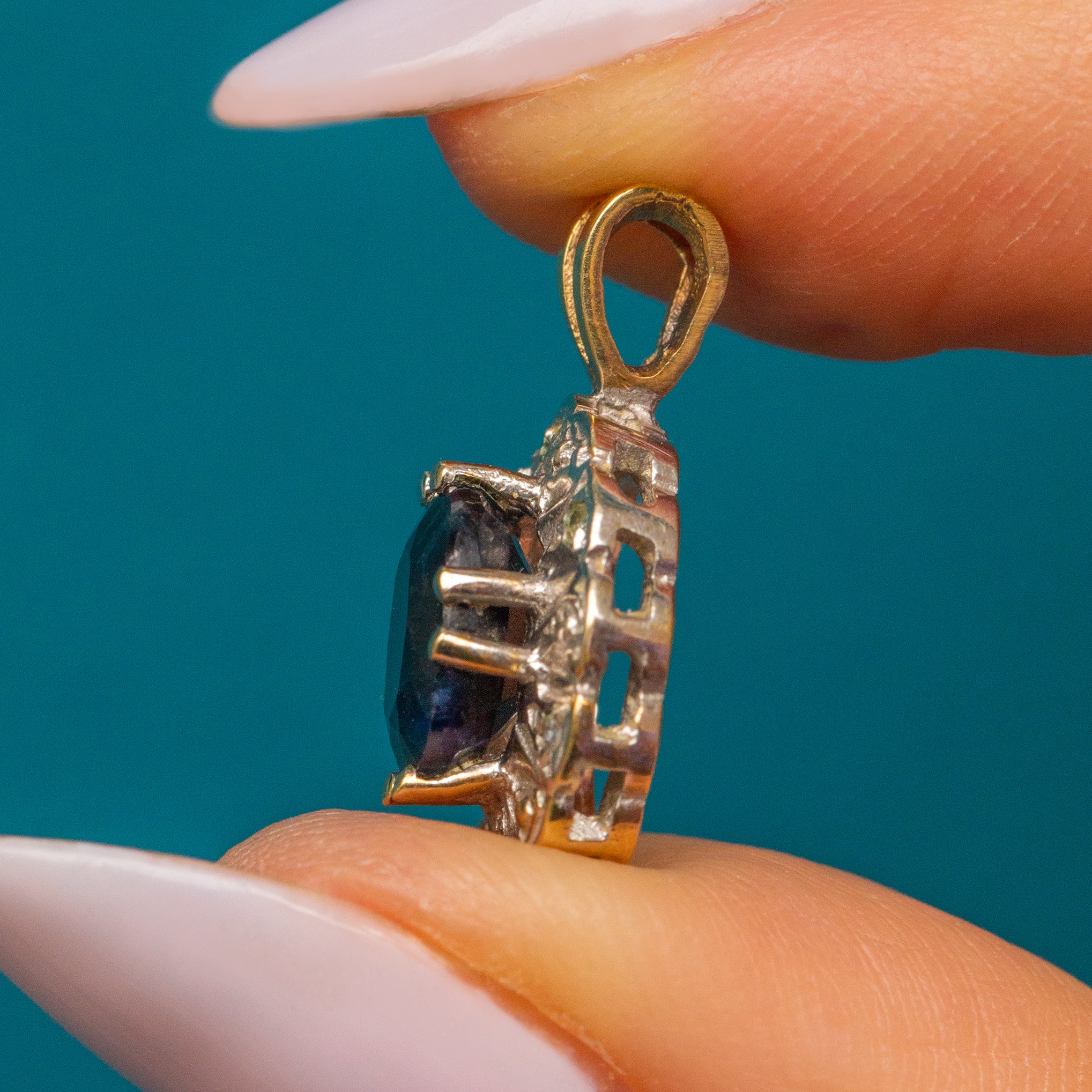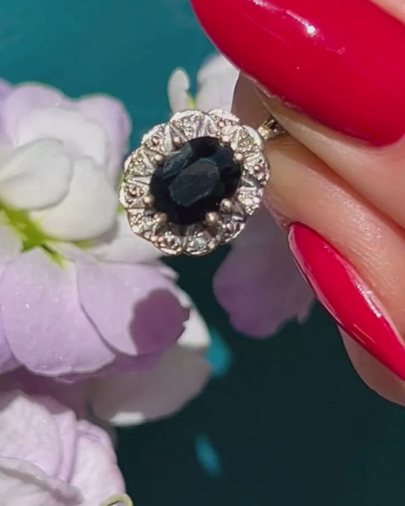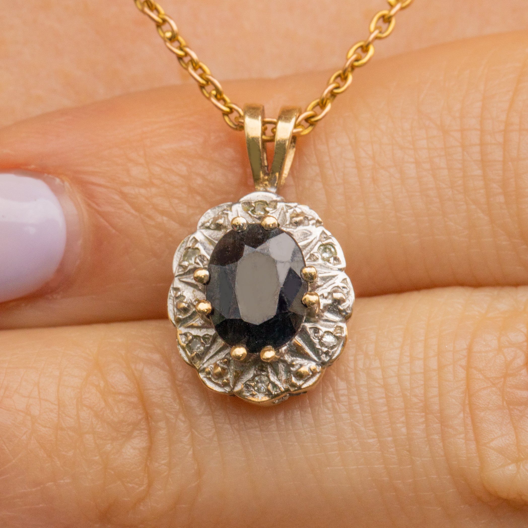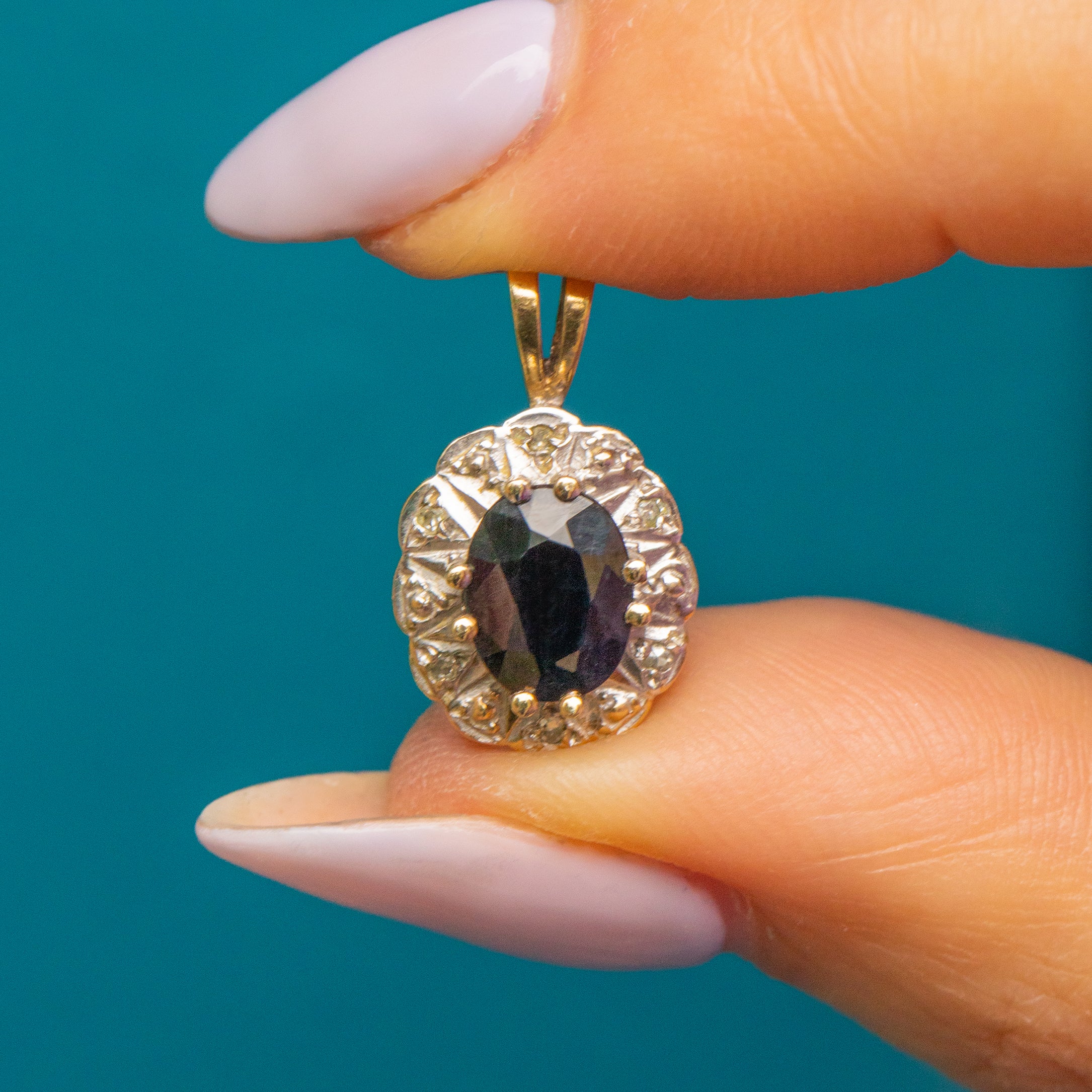 Bordered by a scalloped edge, this Vintage Sapphire pendant has a floral flare. With a tapered Gold bale, you won't be able to resist suspending her from a Gold chain as soon as this Sapphire Diamond charm is in your possession!