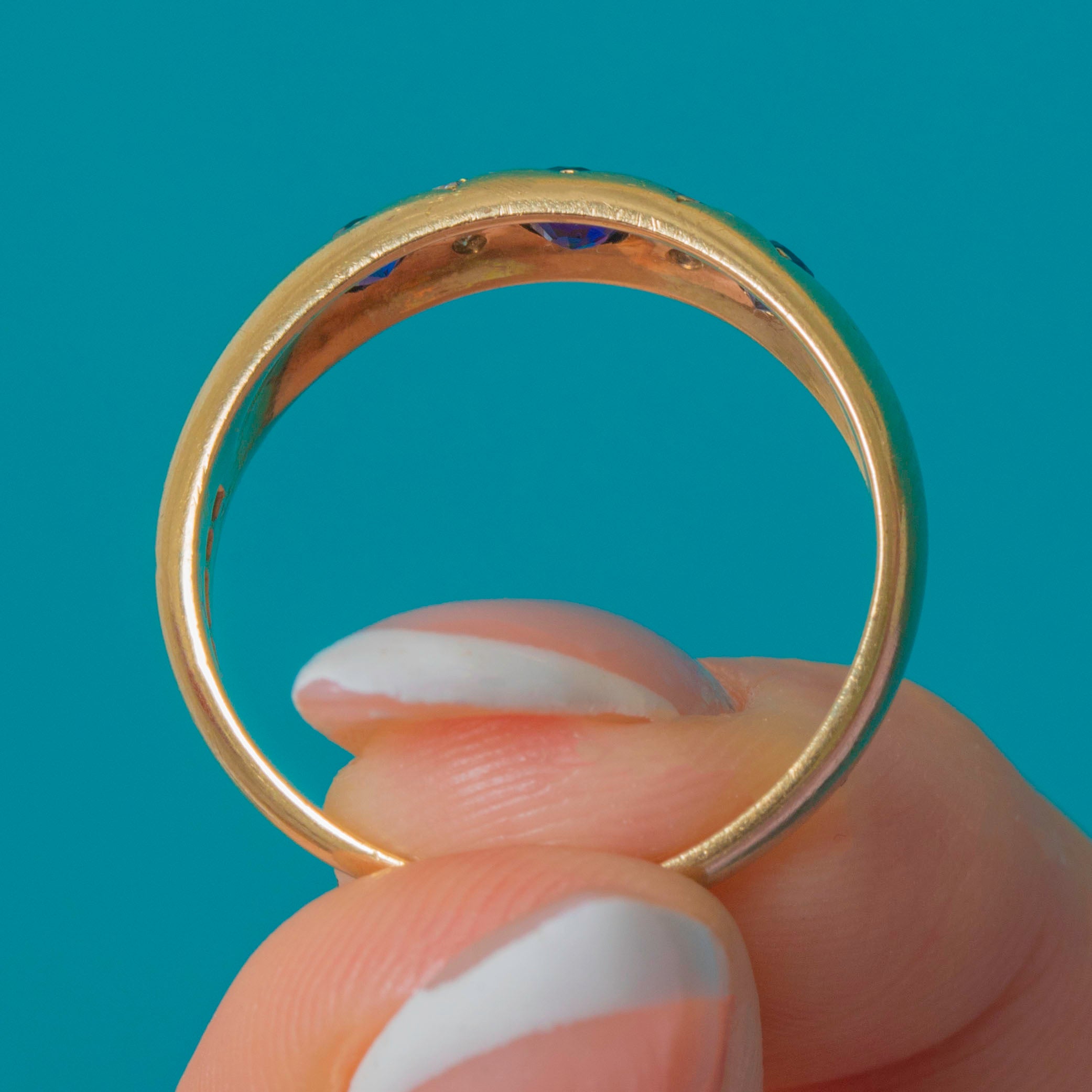 This vintage Sapphire and Diamond ring is the perfect sleek and elegant stacking piece, crafted in warm 9ct Gold. The natural Blue Sapphires and bright Diamonds are neatly set across the band, offering subtle sparkle and a refined, understated look.